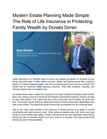 Don Dirren is a licensed financial advisor with more than forty years of experience in retirement planning and wealth management. Based in Phoenix, Arizona, he owns and operates two independent brokerage firms, including Integrated Financial Services. His work focuses on helping individuals understand financial decisions that influence retirement and long-term financial stability. Through his affiliation with Bergen Financial Group, he has been recognized as one of Arizona’s Safe Money Specialists. Donald Dirren has spent his career guiding clients through retirement planning while helping them protect the savings they depend on for the future. He began his career after earning a Bachelor of Science in marketing and management from Arizona State University. Early in his professional life, he worked at established financial services companies, gaining experience in retirement income planning, insurance strategies, and investment management. These early roles helped him understand how financial planning affects individuals at different stages of life and how important clear guidance can be. Operating two independent brokerage firms gives him flexibility in how he serves clients. Instead of relying on a single financial institution, he can review a broader range of financial solutions. This independence allows him to focus on strategies that reflect each individual's needs and goals. Donald Dirren uses this structure to help clients explore financial options that support retirement income and protect long-term savings. When discussing retirement planning, he often explains that the process involves more than investment performance. Individuals must also consider Social Security timing, tax planning, and ways to manage financial risk. He works to present these topics in clear language so people can understand how their decisions may affect their future.