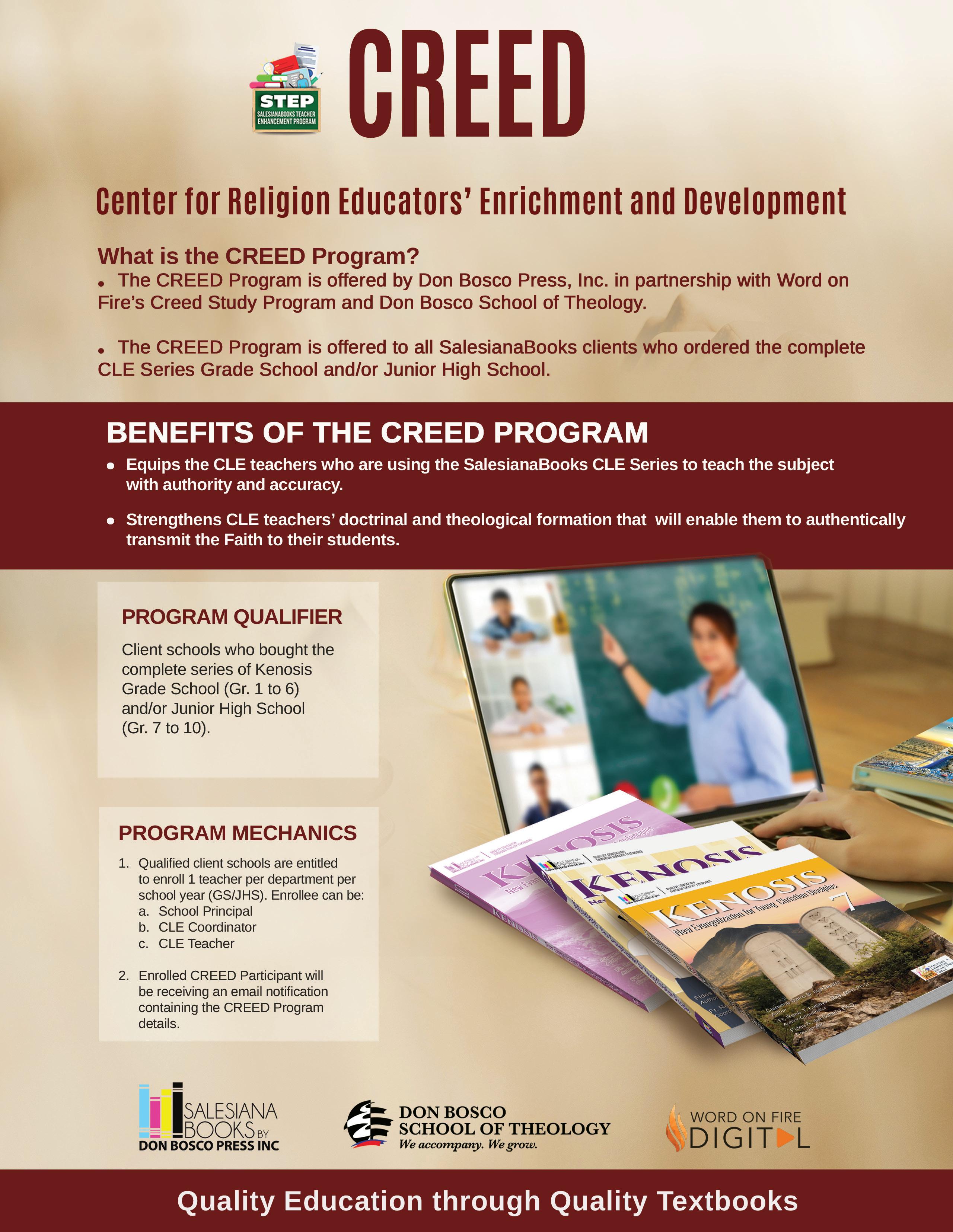 One of these tools is to aid teachers in presenting their lessons, SalesianaBooks is enthusiastic to present to you the wrap-around edition of its Teacher's Manuals of the selected textbooks. The newest program of STEP is the SalesianaBooks CREED Program for CLE Educators.