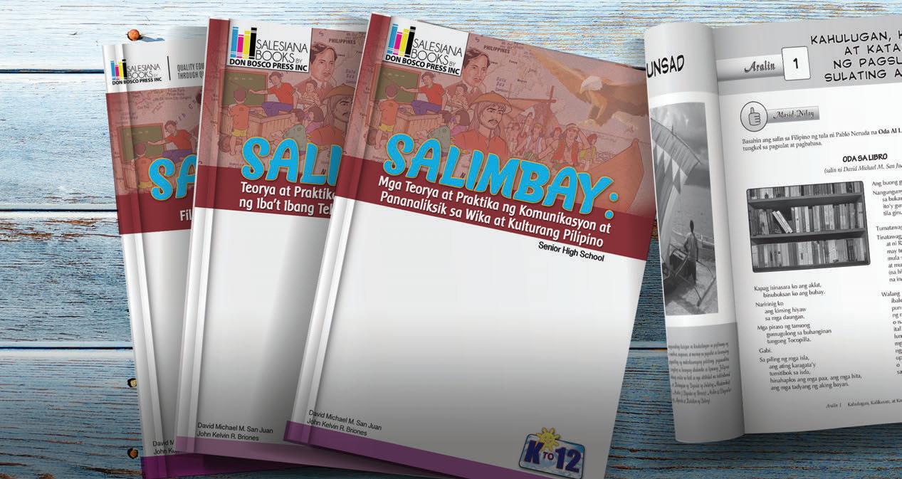 SALIMBAY: Mabilis na paglipad, pagsakay sa ihip ng hangin, pag-akma sa takbo ng panahon. Naaayon sa layunin ng aklat na ito ang kahulugan ng salitang SALIMBAY. Ang teksbuk na Salimbay: Mga Teorya at Praktika ng Komunikasyon at Pananaliksik sa Wika at Kulturang Pilipino, Salimbay: Teorya at Praktika sa Pagbasa at Pagsusuri ng Iba’t Ibang Teksto Tungo sa Pananaliksik, at Salimbay: Filipino sa Larangang Akademiko ay pagtugon sa mga kahingian at pangangailangan ng bagong kurikulum ng Filipino sa ilalim ng K to 12. Gaya ng akto ng paglipad, ang mga aralin sa teksbuk na ito ay nagsisimula sa “lupa” – sa mga pinakapayak at batayang impormasyon – tungo sa mas mapanghamon at mas matataas na antas ng kaalaman at kasanayan, na animo “alapaap” na nararating sa pagsalimbay.