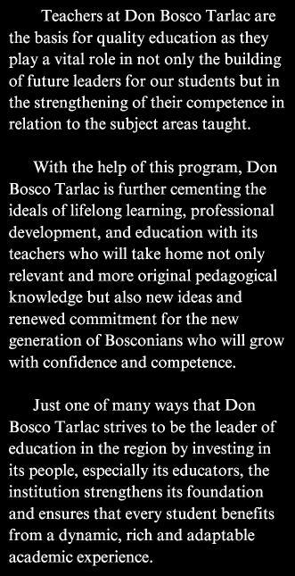 In preparation for the Phase 2 implementation of the MATATAG Curriculum, or the K-10 Enhanced Curriculum, for the academic year 20252026, a joint Enhanced Curriculum Training Workshop was held on April 14, 2025, at the University of the East Manila - College of Education. It was attended together by the academic team members from both the Grade School and Junior High School departments, led by Fr Daniel R Gonzales, SDB, K-10 Principal