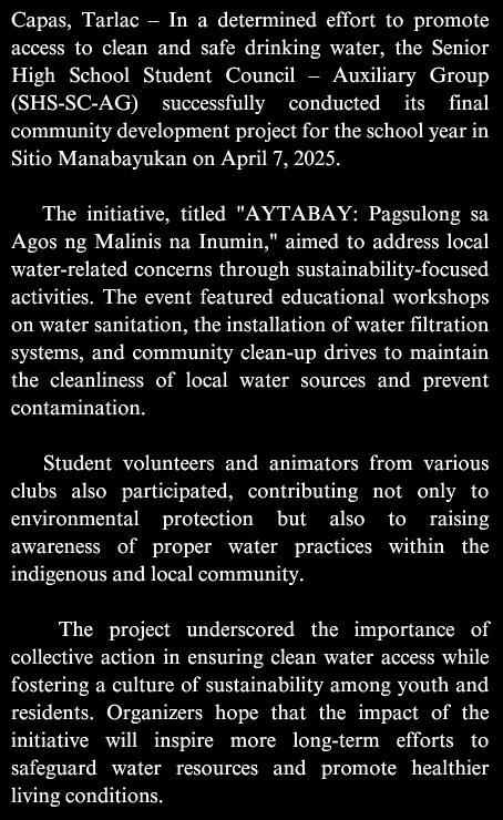 In a remarkable effort to uplift the Ayta community, the JHS Mathematics Club, in collaboration with the Red Cross Youth JHS Council, Boy Scouts of the Philippines, and the Institutional Affairs Office Community Development Area, successfully conducted an outreach activity at Sitio Mataba, Bamban, Tarlac on March 15, 2025