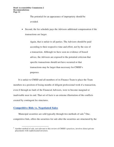 Second, the fee schedule pays the Advisors additional compensation if the transactions are larger. Again, that is unfair to all parties. The Advisors should be paid according to their respective time and effort, not by the size of a transaction. Although we have seen no evidence of biased advice, the Advisors are exposed to the potential criticism that specific transactions should not have occurred or that transactions may be larger than necessary for CMSD’s purposes.