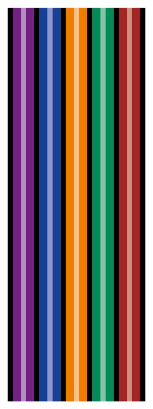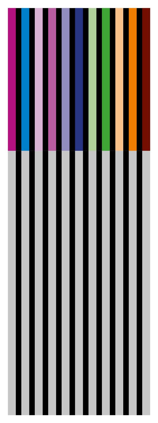 Ähnlich ist es bei der Renaissance Serie. Der Unterschied besteht darin, dass die Bildquelle konkret benannt und auch gezeigt wird. Hier wurden farbrelevante Bildausschnitte von Gemälden einiger bekannten italienischen Renaissance Maler der Cinquecento Epoche ausgewählt, die die Farbpaletten ihrer Meister zeigen. Die Farben wurden aus einer Druckvorlage sorgfältig selektiert und für eine Streifensequenz arrangiert. Dabei stellte ich fest, dass ihre Abstraktion eine erstaunliche Nähe zum figürlichen Ursprungsbild aufbaute. Nachvollziehbar in seinem farblichen Inhalt wird hier das 12-streifige Bildobjekt in seiner Farbcodierung zu einem sensitiven Gegenstand, der die charakteristische Farbenwelt der Renaissance skizziert.