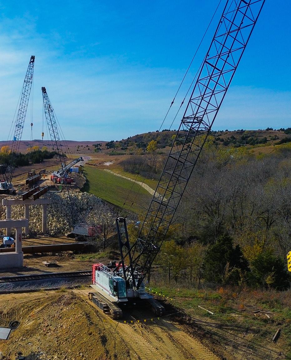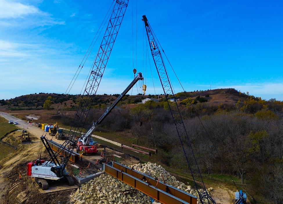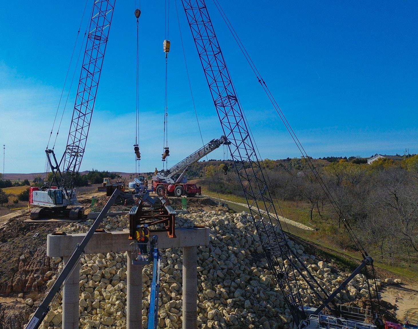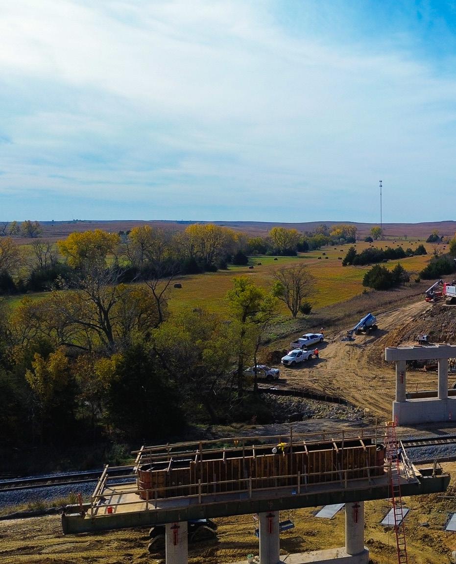 The project replaced the existing 4 span concrete box girder with a new 4 span steel beam bridge. The bridge is on K-141 highway over the Union Pacific Railroad. The railroad has been the biggest challenge of the project. They require specific submittals and work procedures that are above and beyond KDOT requirements. If an item of work is within 25 feet of the centerline of the railroad tracks it can only be performed when they allow it. An example was the demolition of the existing bridge, the only time we could work was over the night during a weekend. We are shooting to have all of the concrete work complete by the end of December.