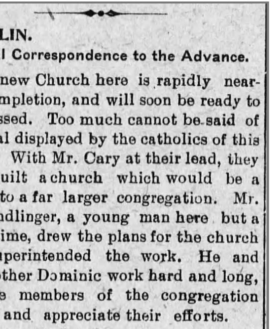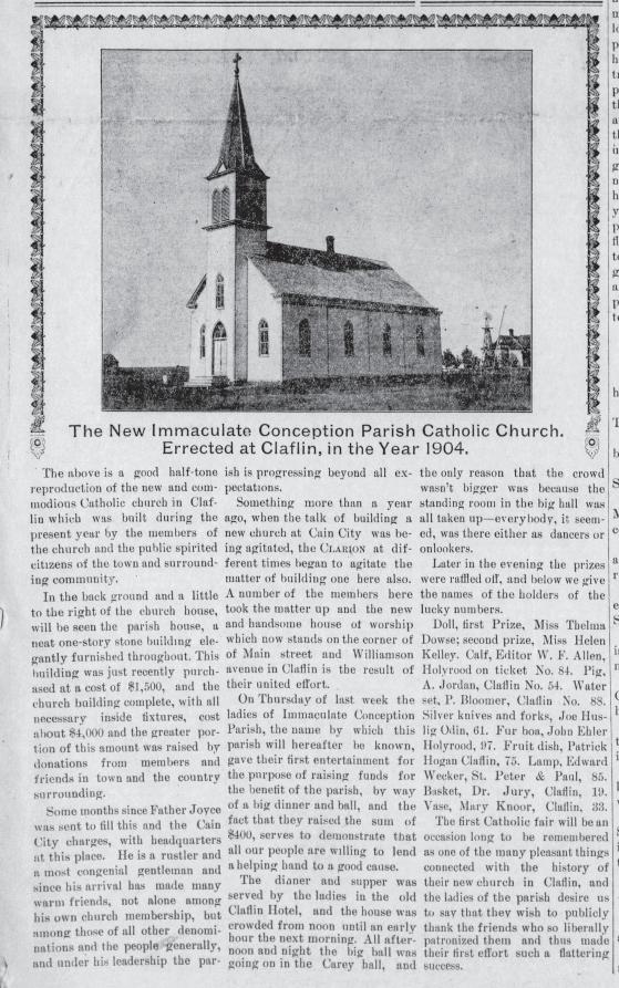 These newspaper clippings date all the way back to 1904, when N.L. and Dominic Dondlinger worked on the original Immaculate Conception Catholic Church in Claflin, KS. The lot for the church was purchased for a remarkable $177, and the final cost to build the first Catholic Church in Claflin totaled $4,000.