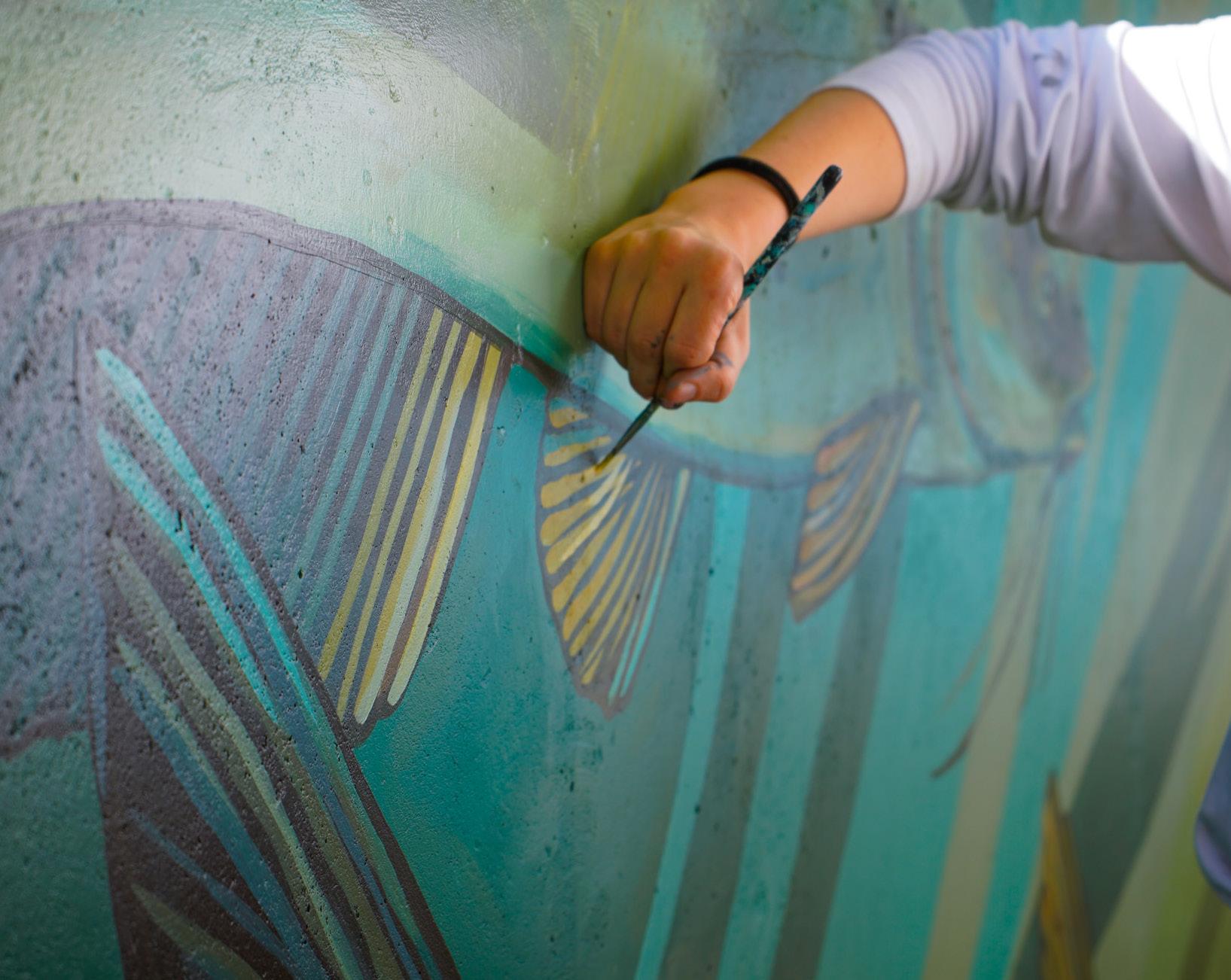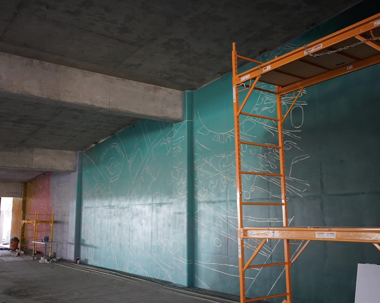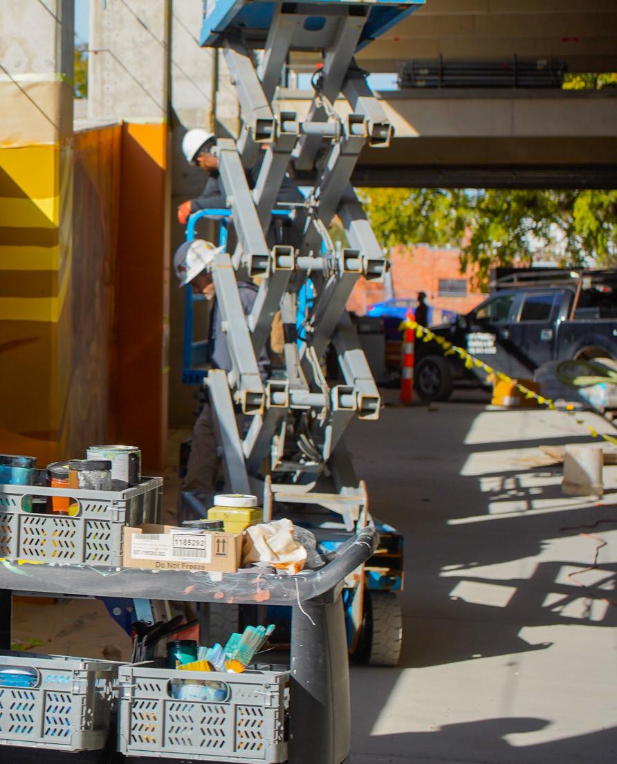 She creates public art that turns everyday spaces into places of color, curiosity, and connection. She made her mark on the Delano Transit Hub that Dondlinger has been working on. She believes that art is an invitation. To think new thoughts, to enjoy our surroundings a little more, and to feel part of a community. Collaboration fuels her practice, and she’s constantly inspired by the artists she works alongside.