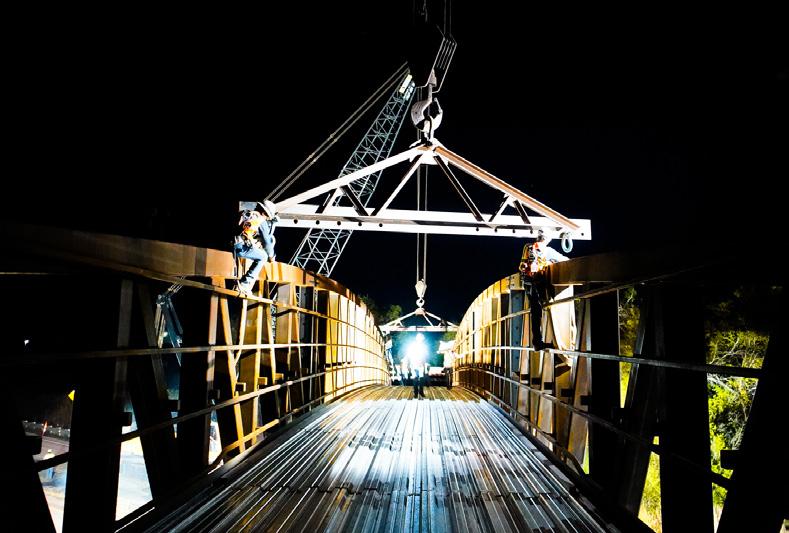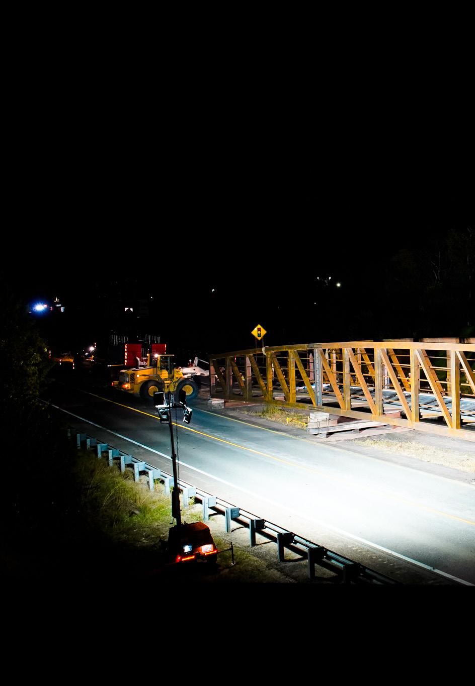 The Red Bud Trail bridge was erected starting at 9 pm on a Saturday and continued through the night until set. This bridge is a hefty 160,000 lbs and 200 feet long. It was in 4 pieces and our team assembled it on site! Along with this projects normal Superintendents, Carlos Silva and Jeff Burnham also lend a hand to help the setting go smooth!