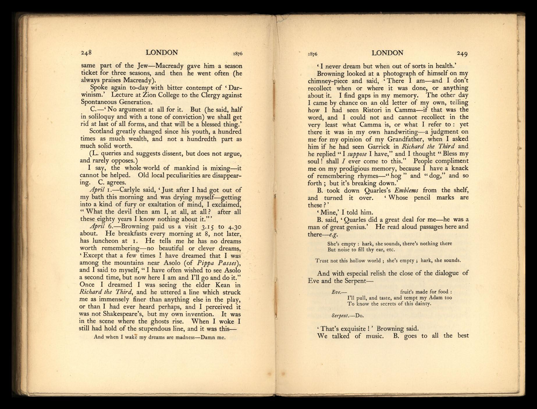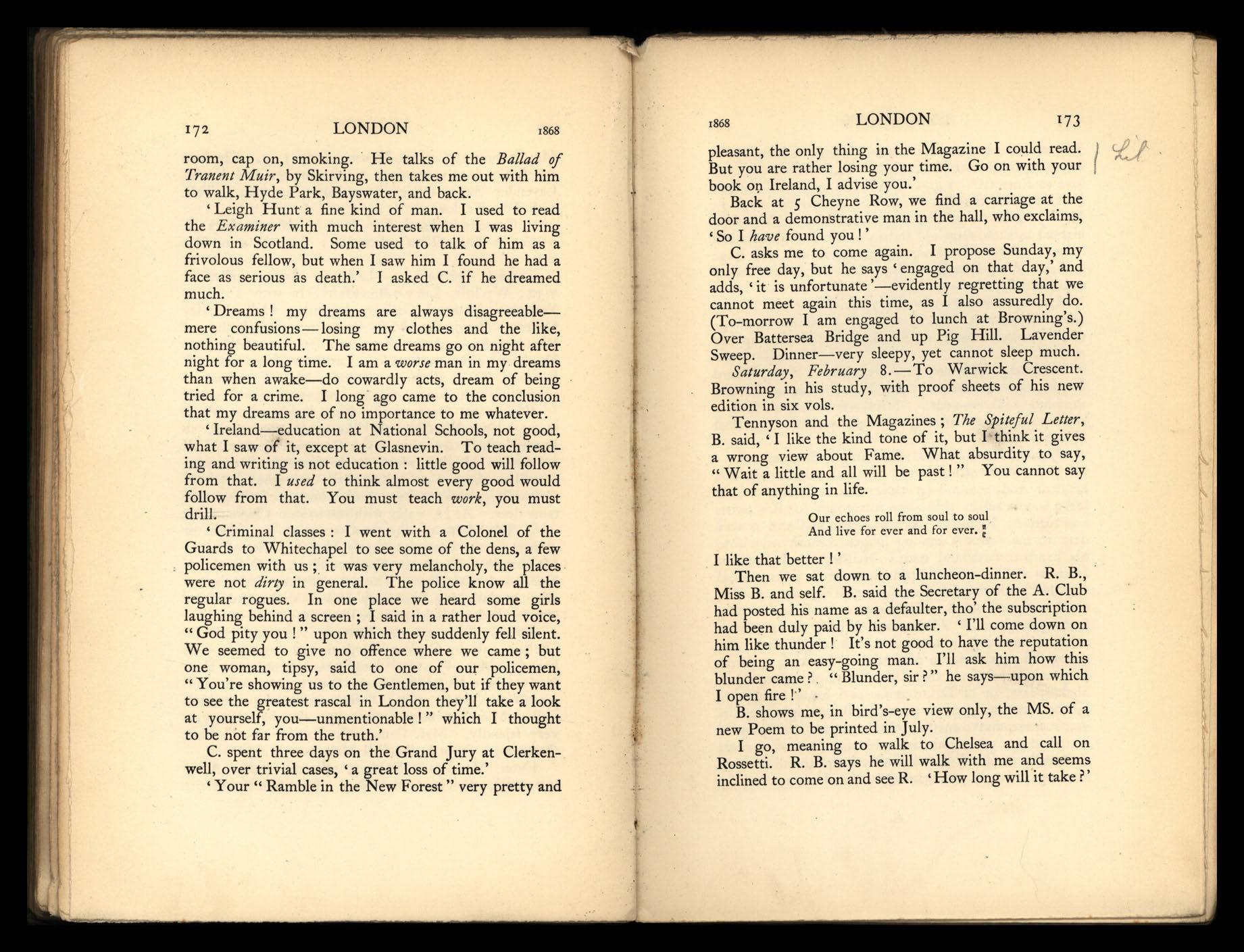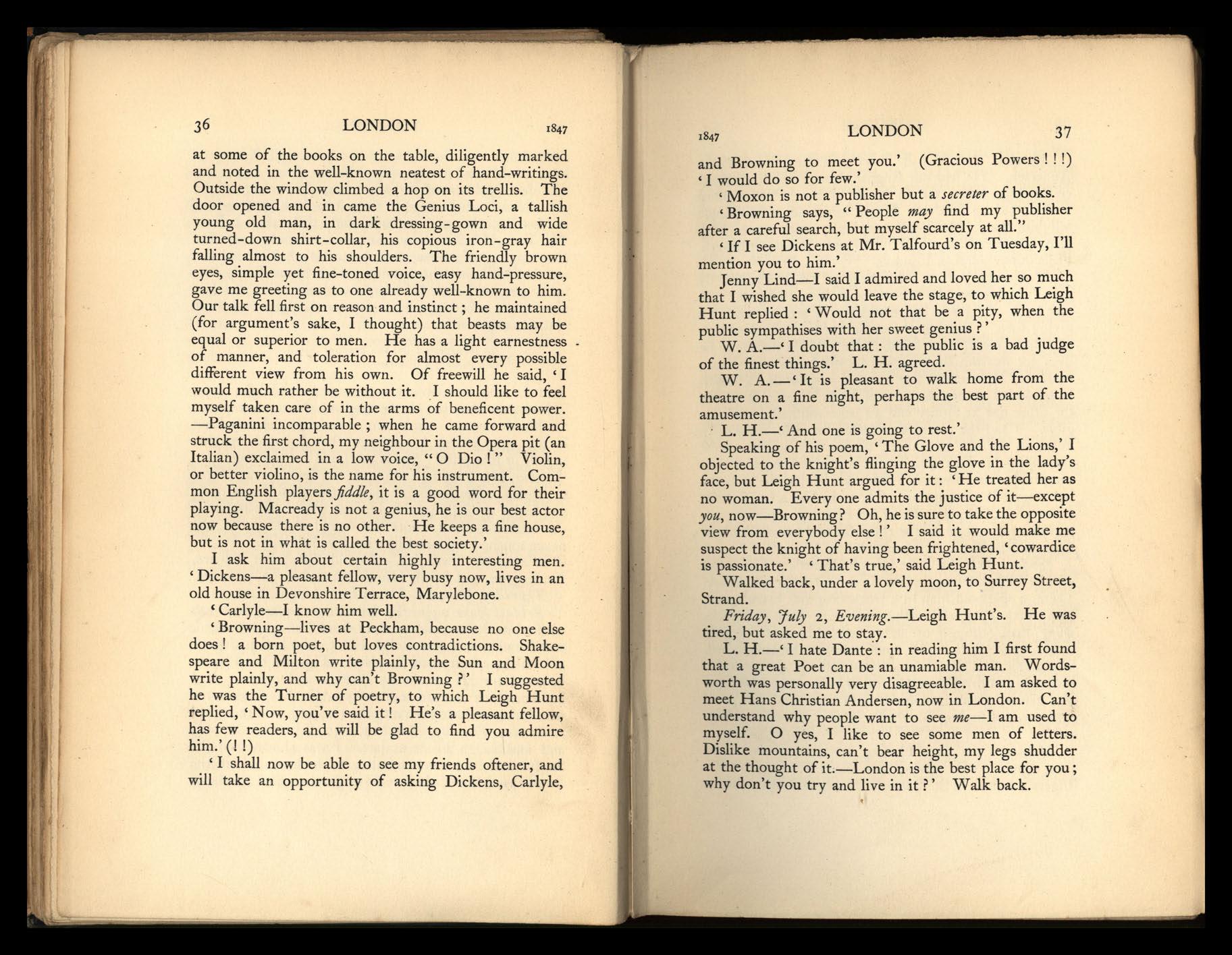'Browning-lives at Peckham, because no one else does! a born poet, but loves contradictions. Shakespeare and Milton write plainly, the Sun and Moon write plainly, and why can't Browning?' I suggested he was the Turner of poetry, to which Leigh Hunt replied, 'Now, you've said it! He's a pleasant fellow, has few readers, and will be glad to find you admire h· , (I I) tm ...