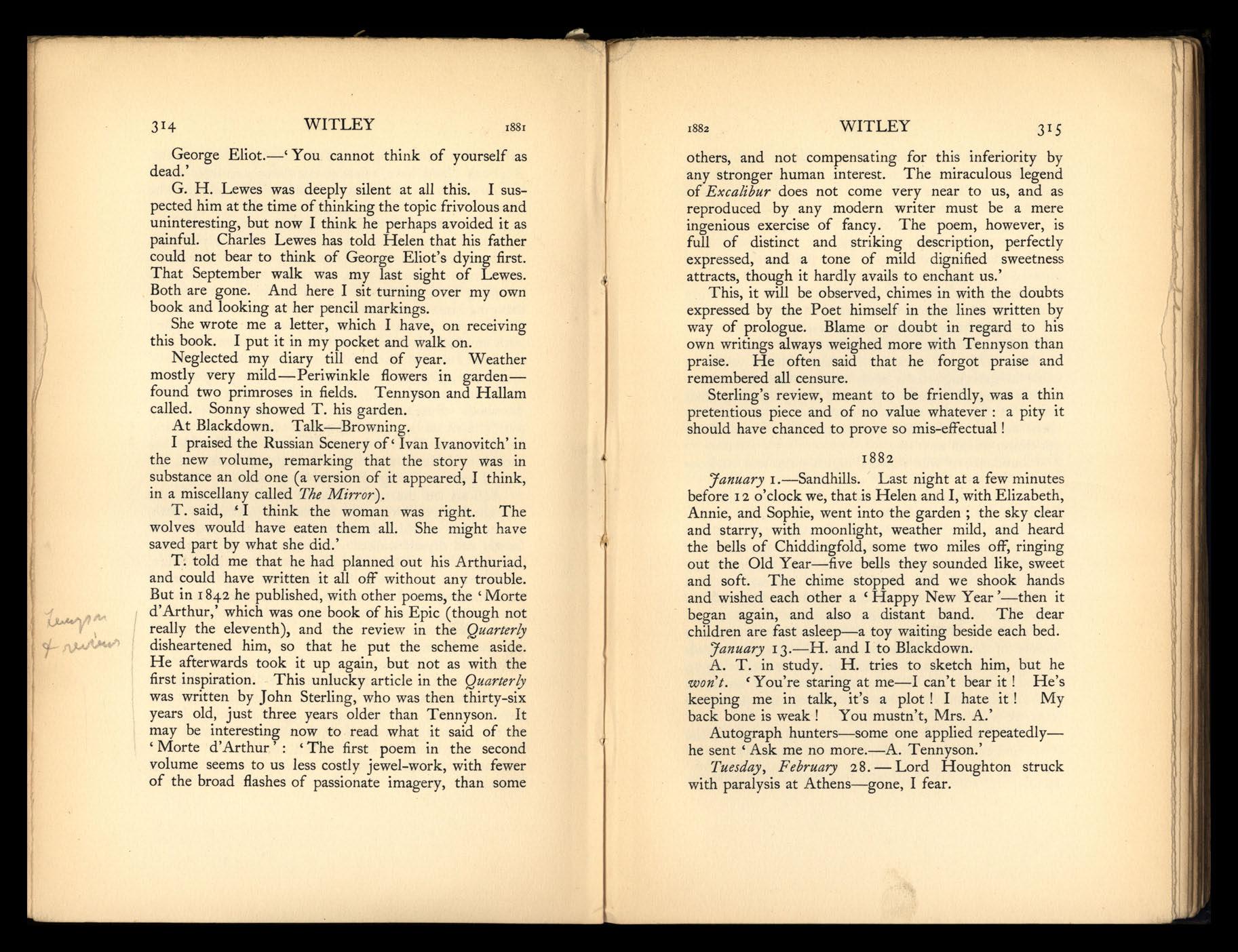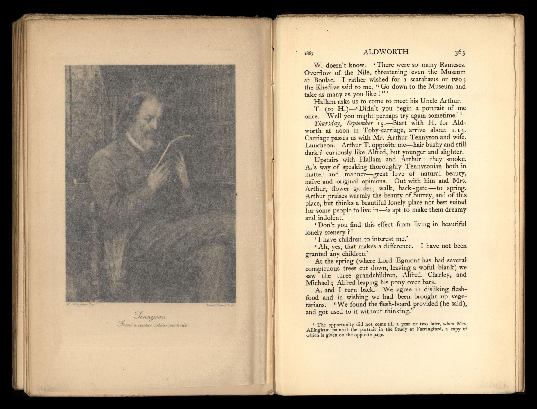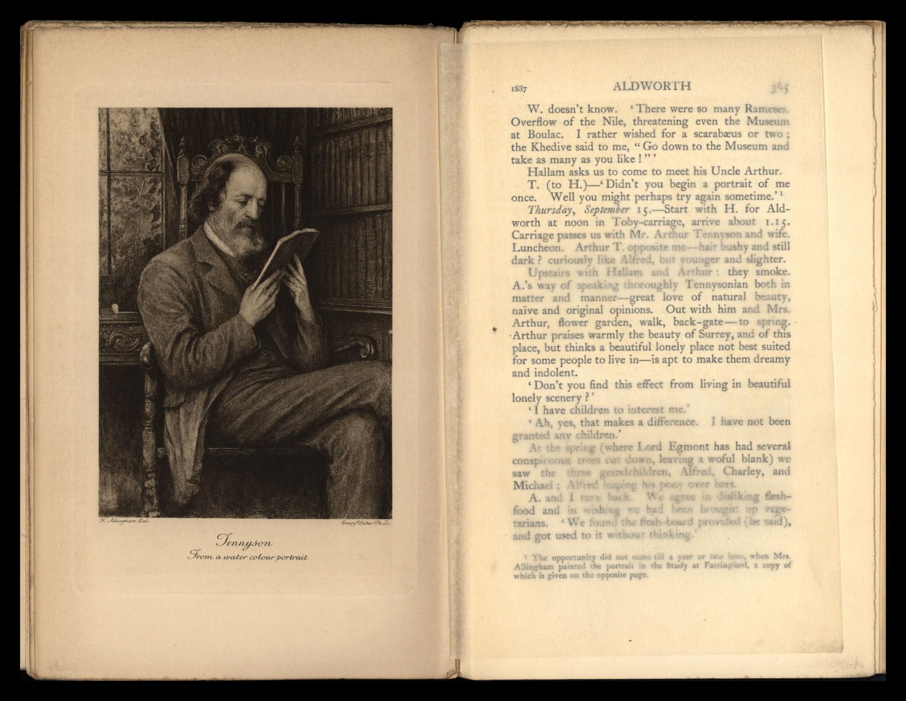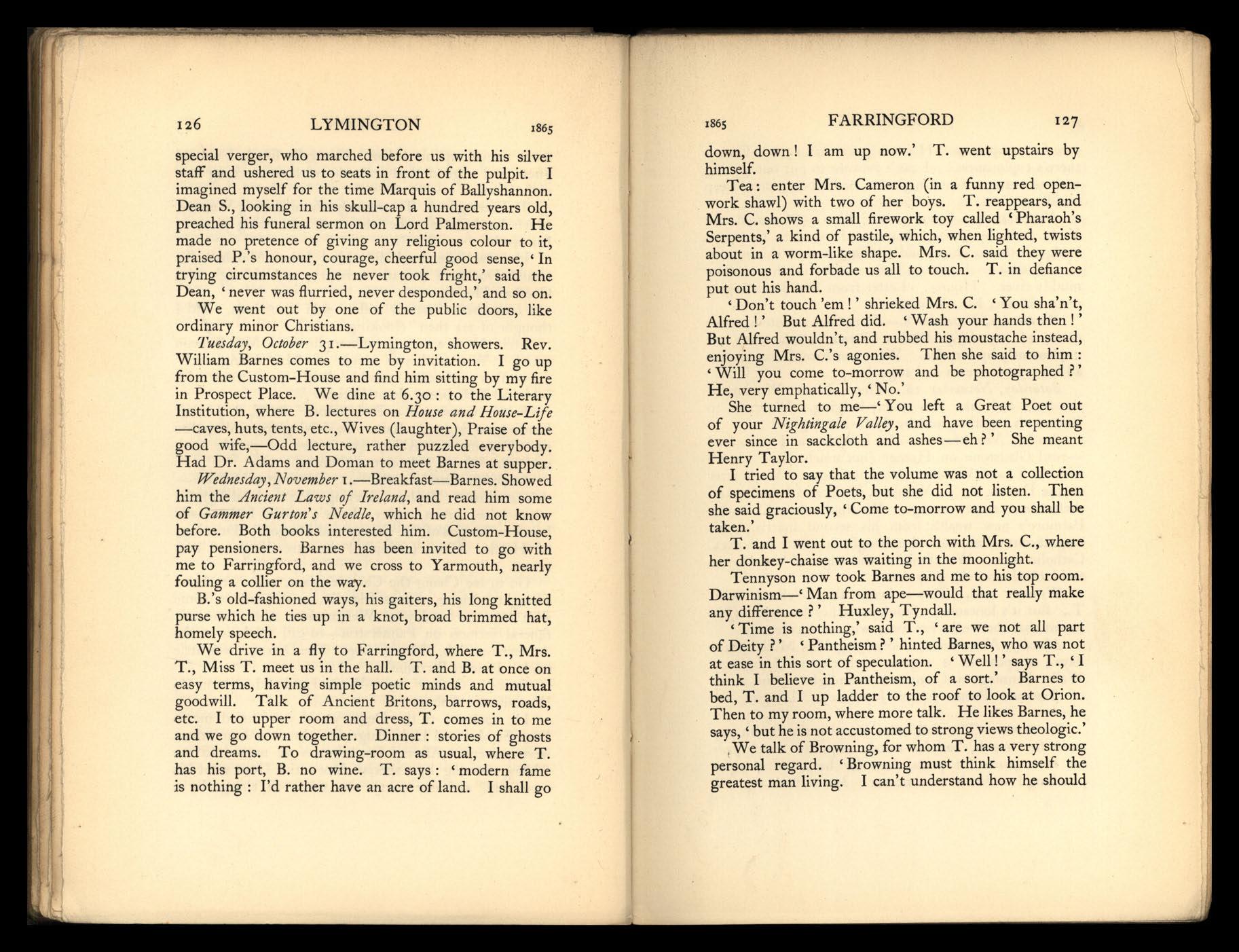 Tennyson, Alfred (Lord), Allingham reads his poems at Belfast, 31; manuscript of 'In Memoriam,' 55; at Twickenham, 60-65; described at age of forty-one, 60; at Farringford, 87-89, 93-95; boys and Shakespeare, 89; classic metres, 93 -9 5; reads aloud or repeats own poems, 95, 1'7119, '46, '58, 301, 302, 304, 328; excursion to Beaulieu, 100; his visit to the Queen, 118, 150; varieties, and a drunken man 's promise, 119; visit to Weim ar, 125; regard for Browning, 128; his fondness for brooks, 130, 131; on Byron, 132; at Lyn dhurs t , 133-137; his songs, , The Loves of the Wrens,' 146 ; J ane Austen's novel s, 156, 158; feelings on immortality and the destiny of man, 14 8, '51, 185, 329; Arthurian epic and' Morte d' Arthur,' 150, 314, 315; delig htful converse, '5 I 159; on marriage, 158 ; jottings on religion, 163, 215; the Queen's autograph gift to him, 166; on Irish landscape, 167; on Greek and Latin poetry, 168; at Cambri dge, 175; his Lincolnshire stories, 176; on Longfellow, Swe denbo rg, and Hinton, 183 ; 'The San Grail,' 187; Carlyle on, 205; remarks on I reland, 199, 293,