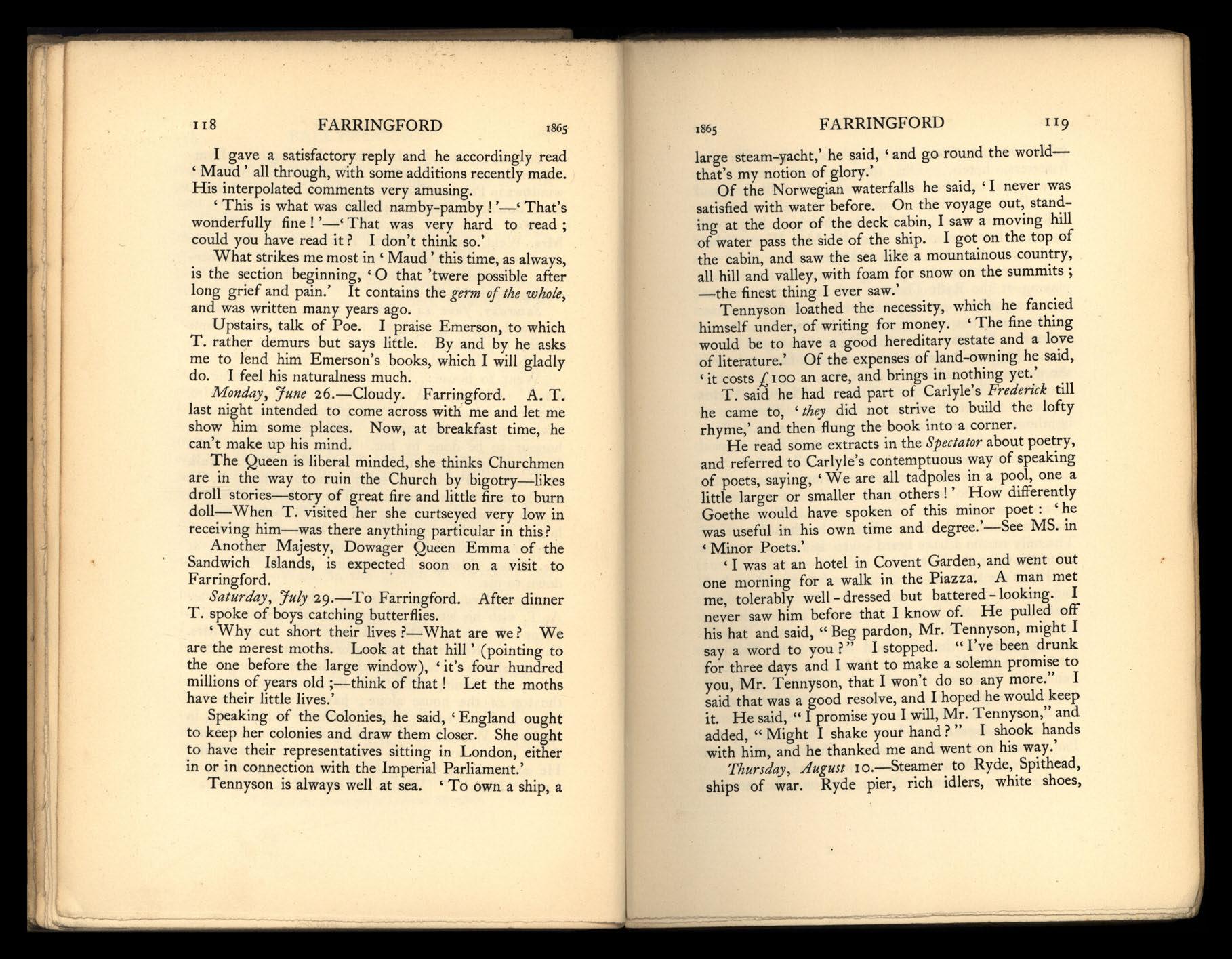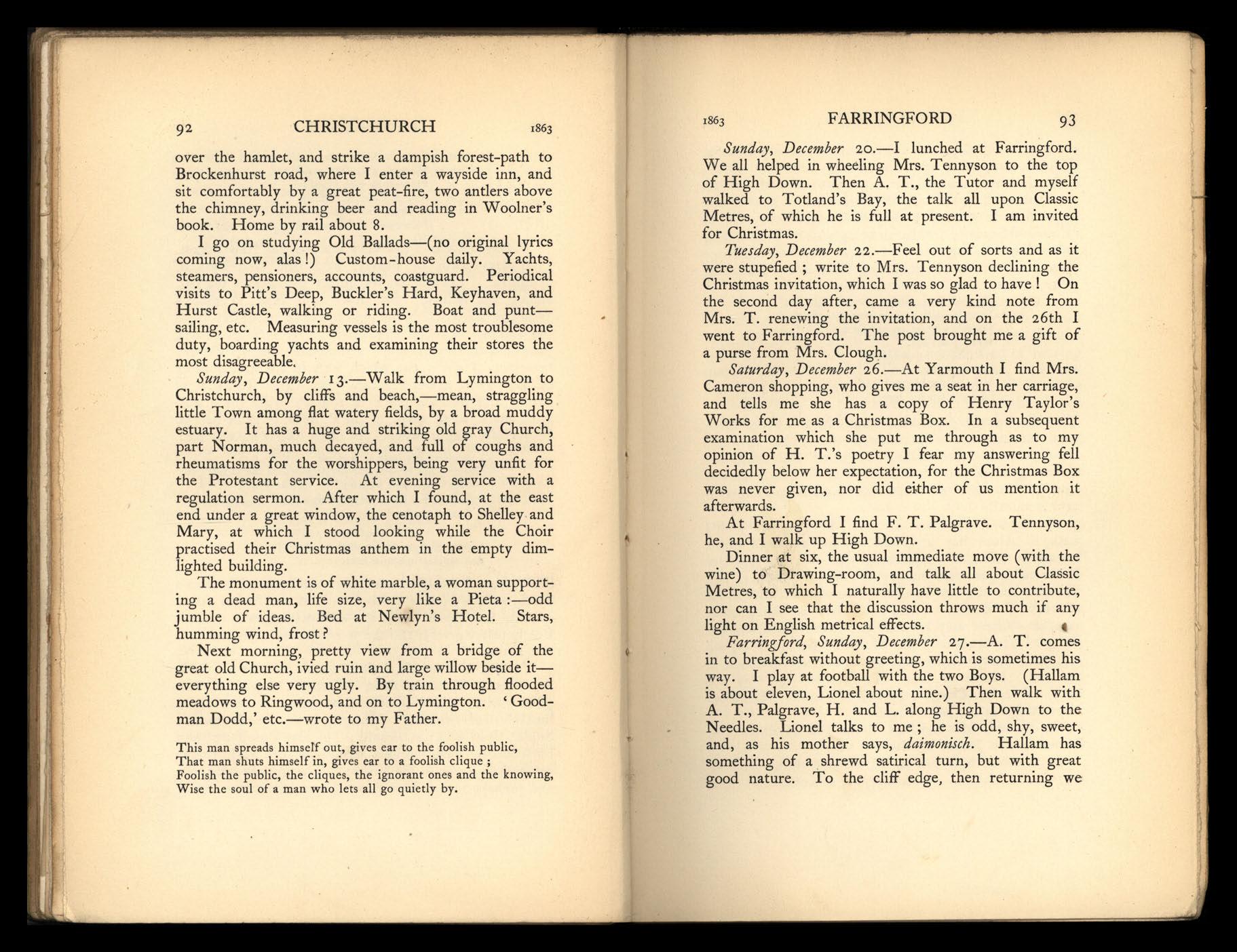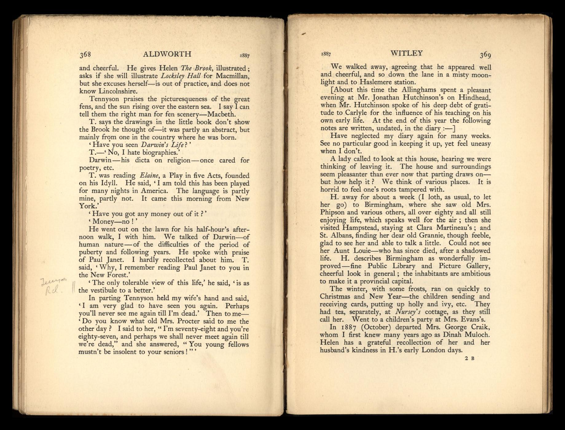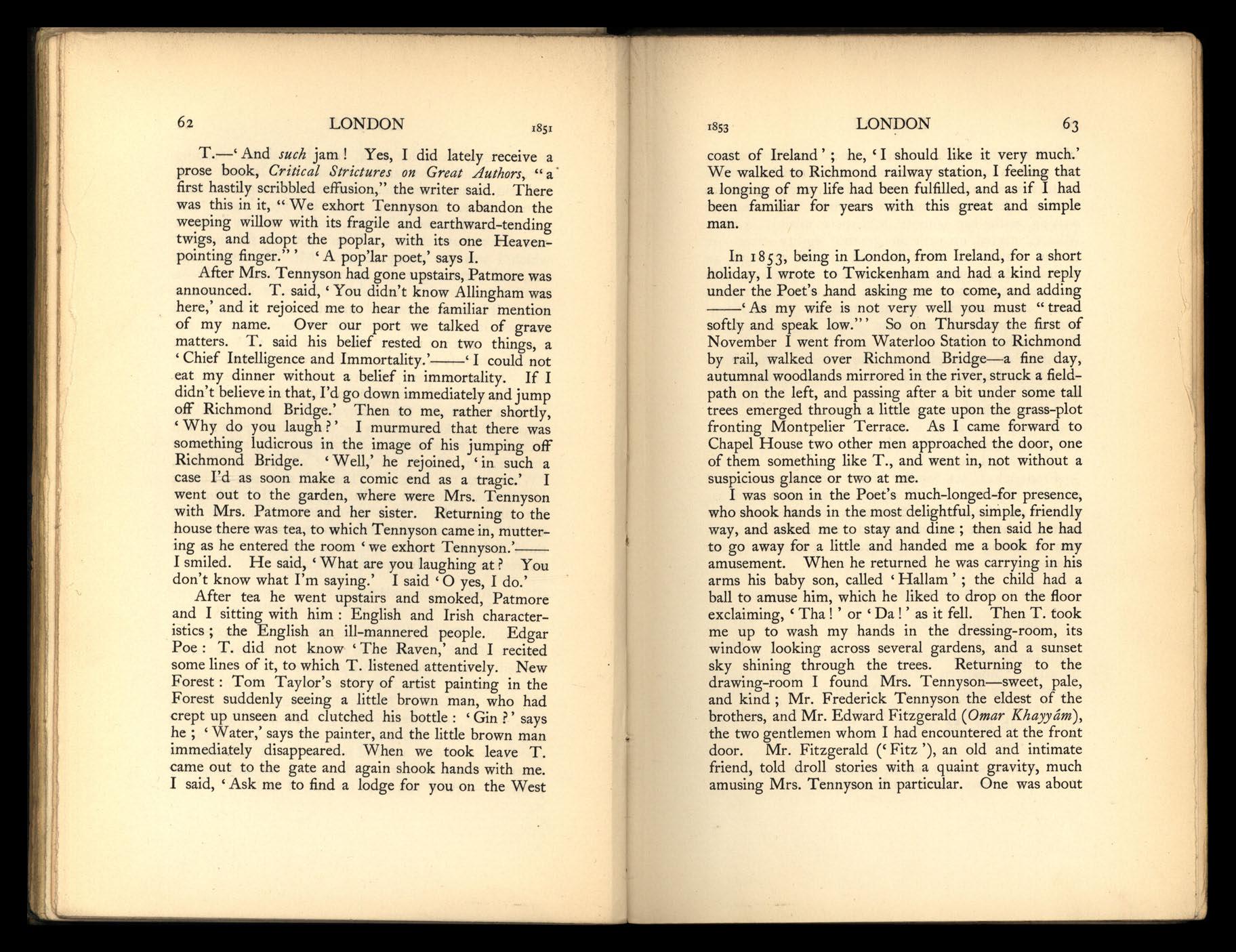 Tennyson, Alfred (Lord), Allingham reads his poems at Belfast, 31; manuscript of 'In Memoriam,' 55; at Twickenham, 60-65; described at age of forty-one, 60; at Farringford, 87-89, 93-95; boys and Shakespeare, 89; classic metres, 93 -9 5; reads aloud or repeats own poems, 95, 1'7119, '46, '58, 301, 302, 304, 328; excursion to Beaulieu, 100; his visit to the Queen, 118, 150; varieties, and a drunken man 's promise, 119; visit to Weim ar, 125; regard for Browning, 128; his fondness for brooks, 130, 131; on Byron, 132; at Lyn dhurs t , 133-137; his songs, , The Loves of the Wrens,' 146 ; J ane Austen's novel s, 156, 158; feelings on immortality and the destiny of man, 14 8, '51, 185, 329; Arthurian epic and' Morte d' Arthur,' 150, 314, 315; delig htful converse, '5 I 159; on marriage, 158 ; jottings on religion, 163, 215; the Queen's autograph gift to him, 166; on Irish landscape, 167; on Greek and Latin poetry, 168; at Cambri dge, 175; his Lincolnshire stories, 176; on Longfellow, Swe denbo rg, and Hinton, 183 ; 'The San Grail,' 187; Carlyle on, 205; remarks on I reland, 199, 293,