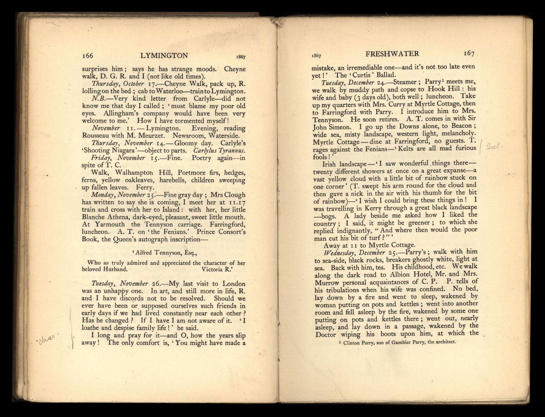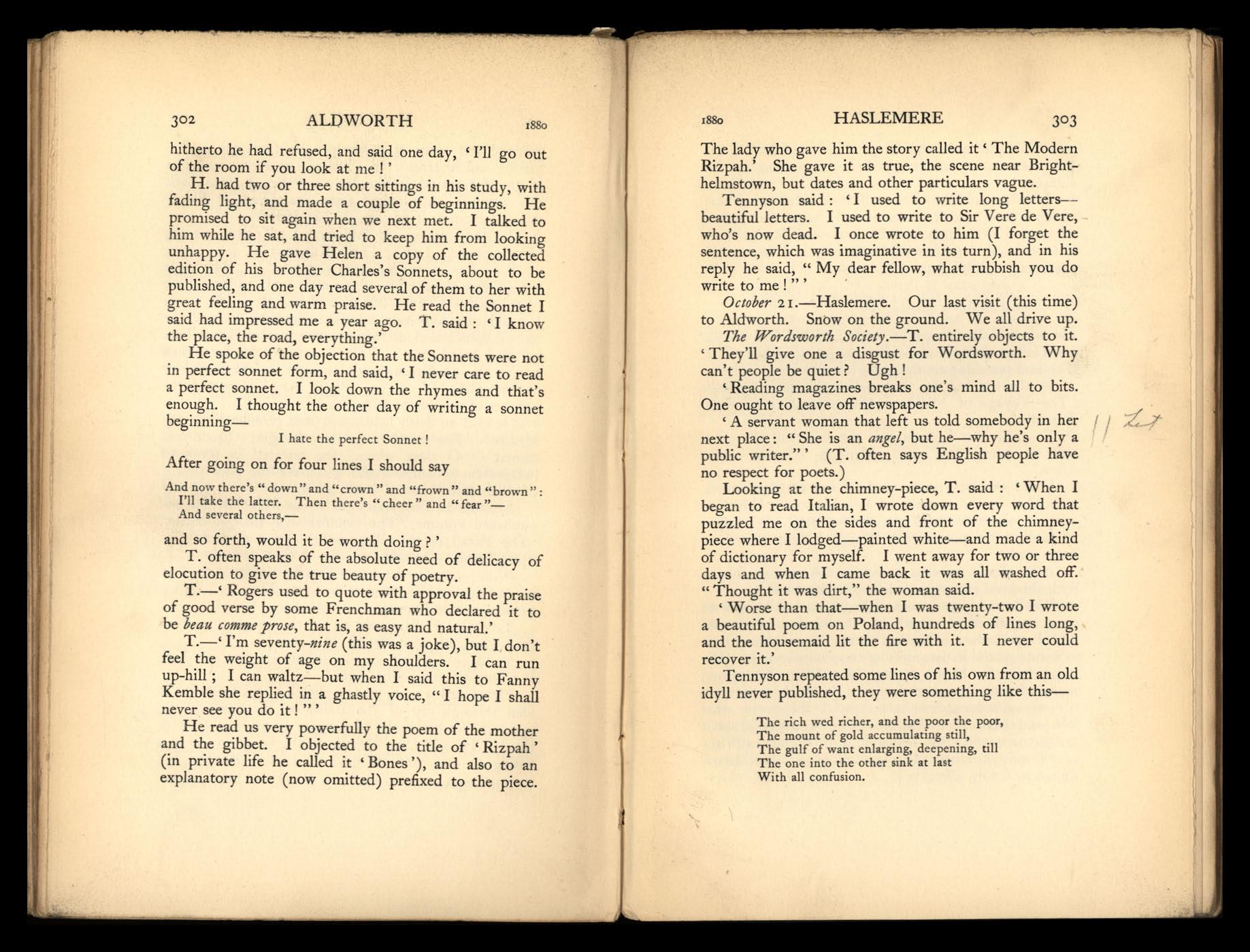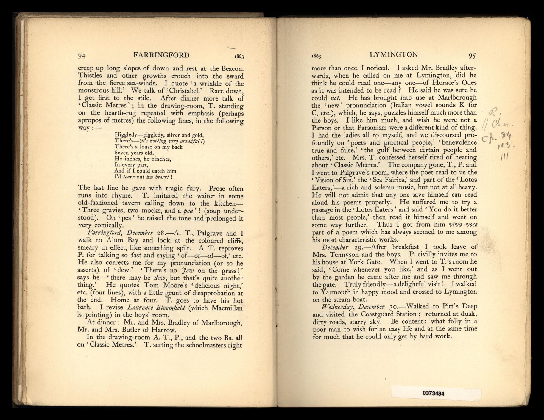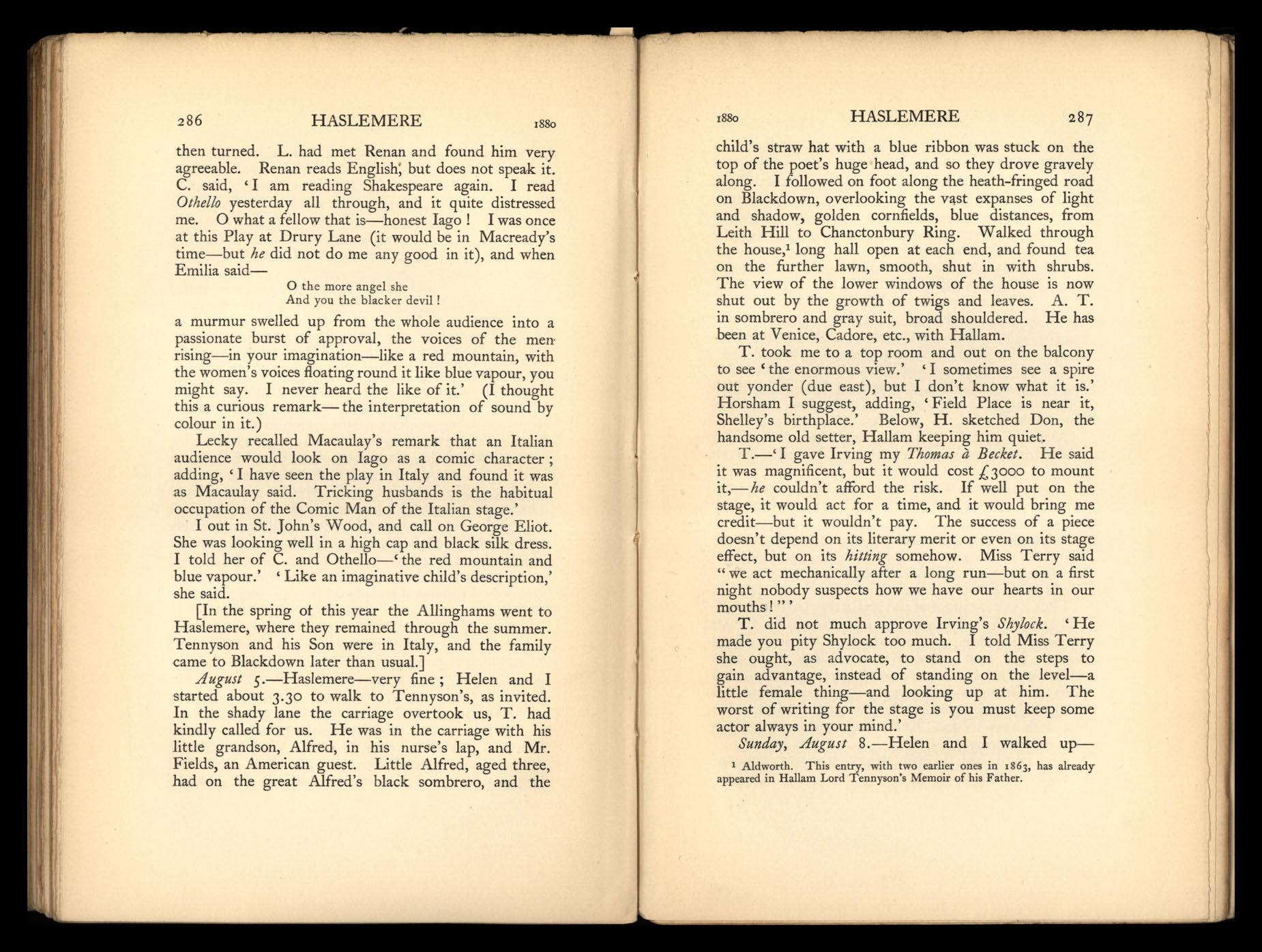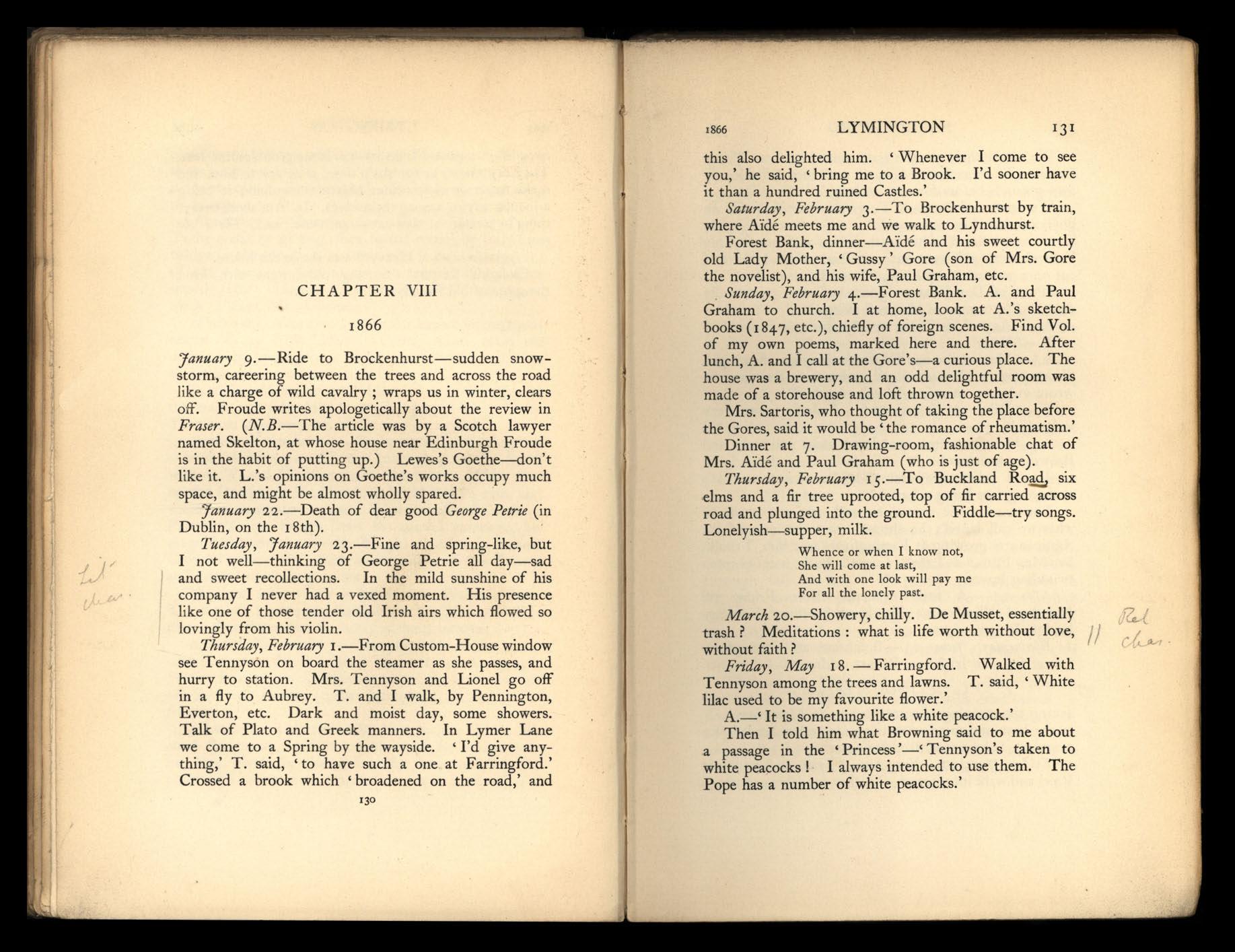 Tennyson, Alfred (Lord), Allingham reads his poems at Belfast, 31; manuscript of 'In Memoriam,' 55; at Twickenham, 60-65; described at age of forty-one, 60; at Farringford, 87-89, 93-95; boys and Shakespeare, 89; classic metres, 93 -9 5; reads aloud or repeats own poems, 95, 1'7119, '46, '58, 301, 302, 304, 328; excursion to Beaulieu, 100; his visit to the Queen, 118, 150; varieties, and a drunken man 's promise, 119; visit to Weim ar, 125; regard for Browning, 128; his fondness for brooks, 130, 131; on Byron, 132; at Lyn dhurs t , 133-137; his songs, , The Loves of the Wrens,' 146 ; J ane Austen's novel s, 156, 158; feelings on immortality and the destiny of man, 14 8, '51, 185, 329; Arthurian epic and' Morte d' Arthur,' 150, 314, 315; delig htful converse, '5 I 159; on marriage, 158 ; jottings on religion, 163, 215; the Queen's autograph gift to him, 166; on Irish landscape, 167; on Greek and Latin poetry, 168; at Cambri dge, 175; his Lincolnshire stories, 176; on Longfellow, Swe denbo rg, and Hinton, 183 ; 'The San Grail,' 187; Carlyle on, 205; remarks on I reland, 199, 293,