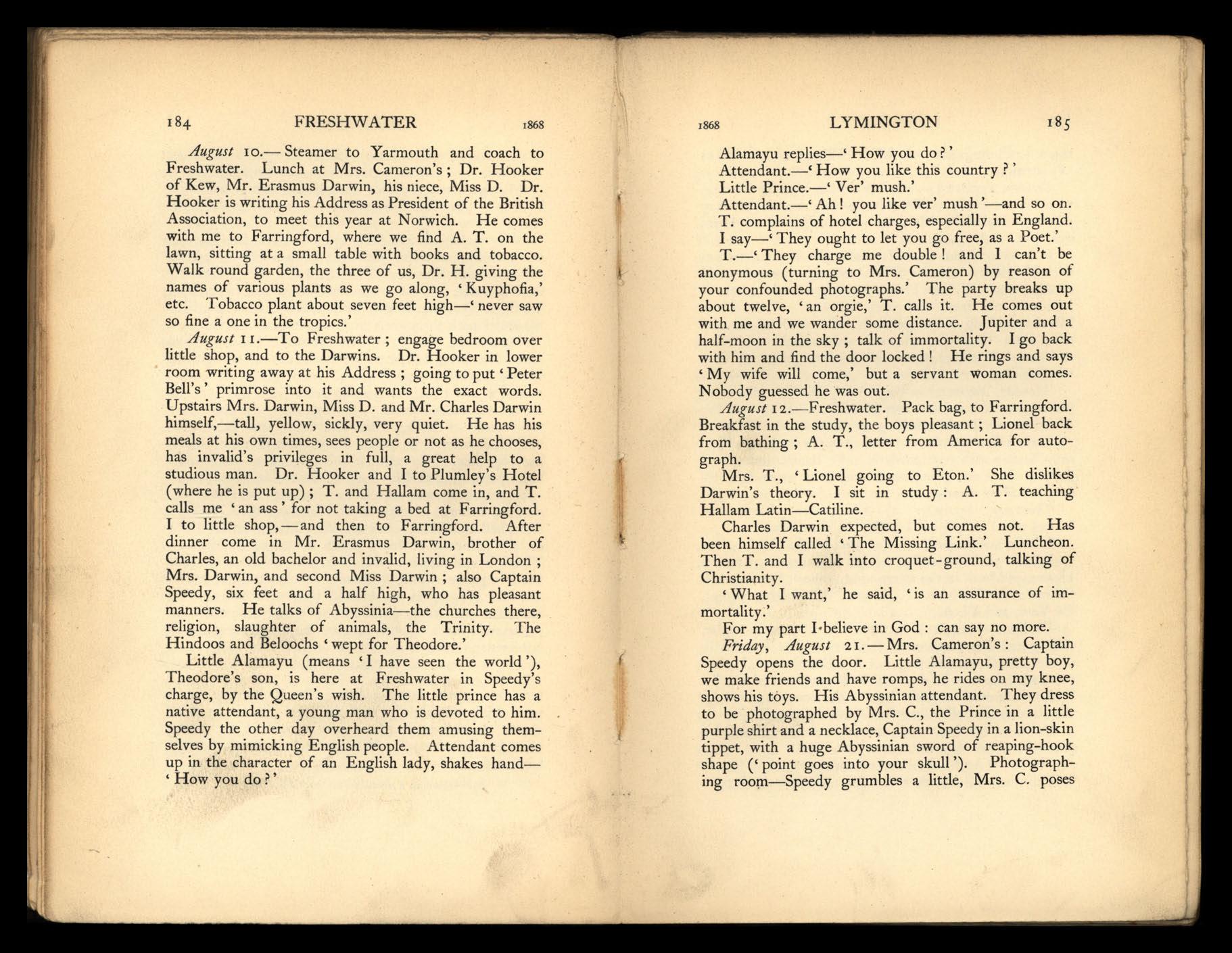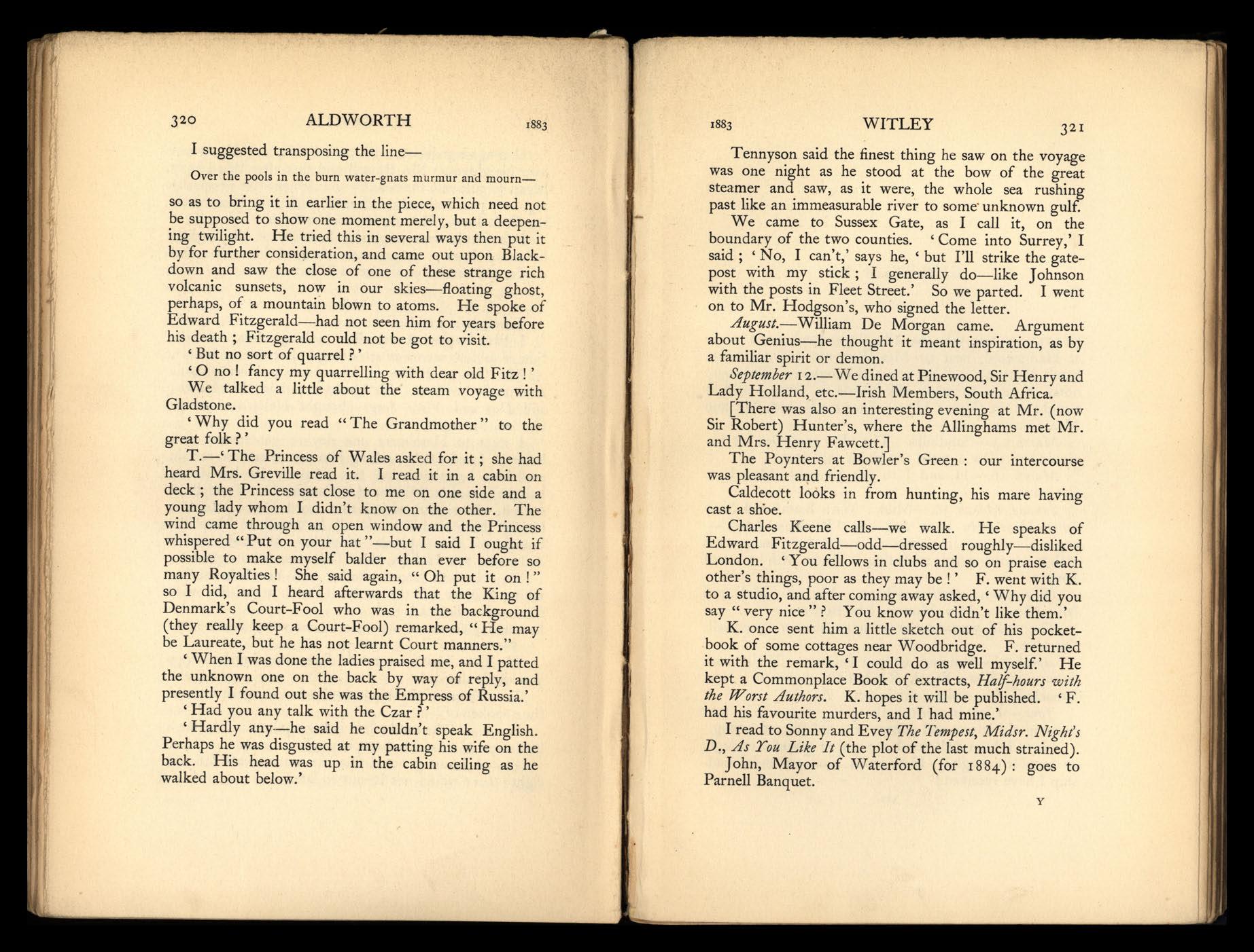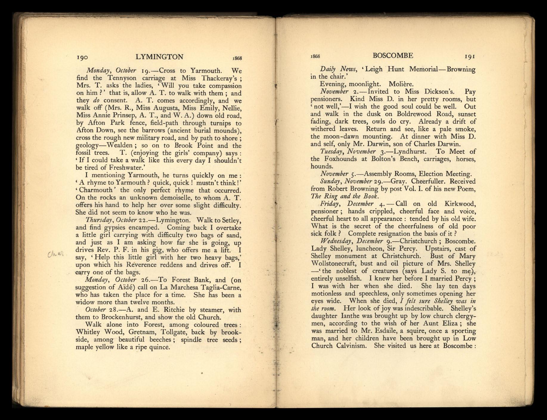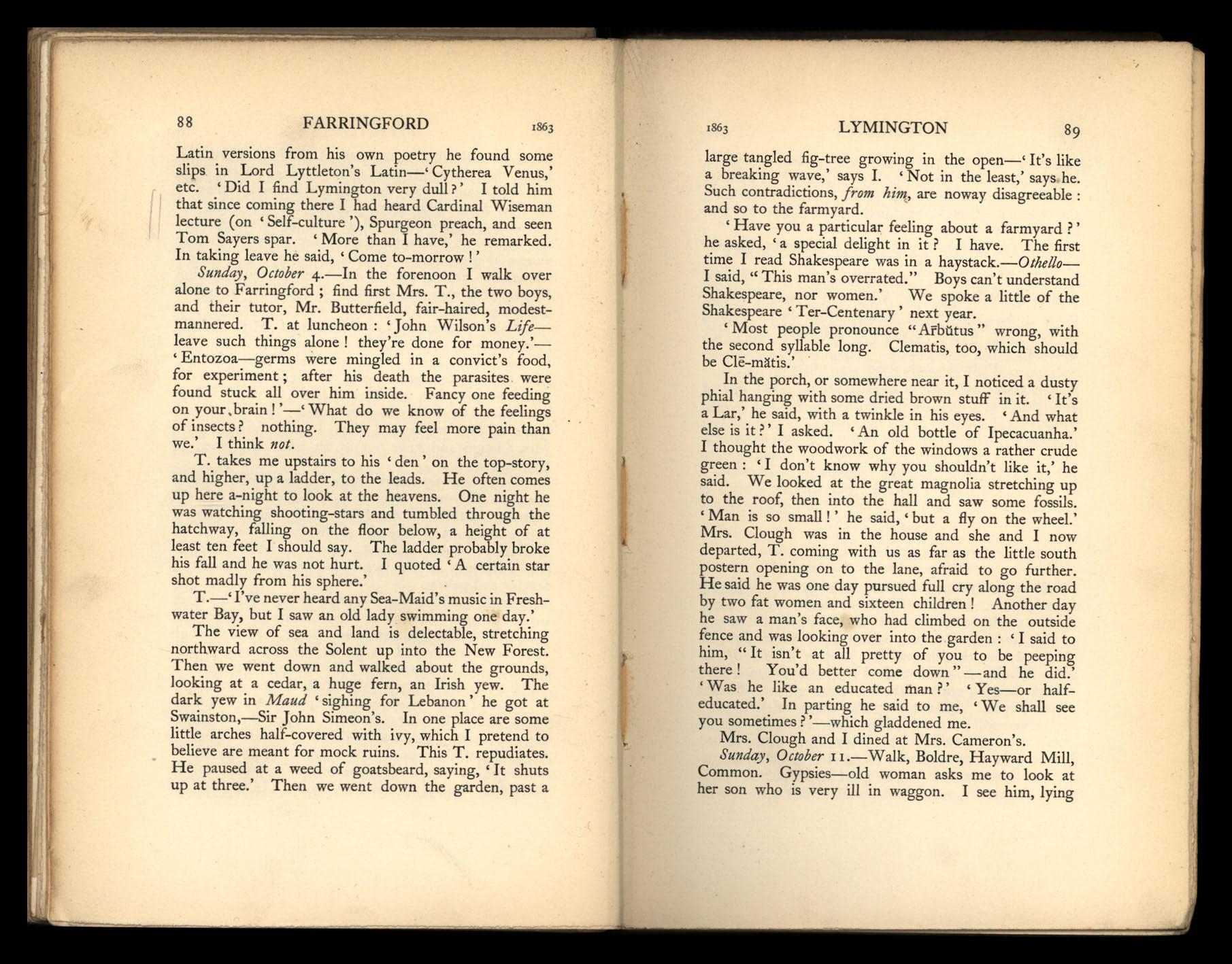 Tennyson, Alfred (Lord), Allingham reads his poems at Belfast, 31; manuscript of 'In Memoriam,' 55; at Twickenham, 60-65; described at age of forty-one, 60; at Farringford, 87-89, 93-95; boys and Shakespeare, 89; classic metres, 93 -9 5; reads aloud or repeats own poems, 95, 1'7119, '46, '58, 301, 302, 304, 328; excursion to Beaulieu, 100; his visit to the Queen, 118, 150; varieties, and a drunken man 's promise, 119; visit to Weim ar, 125; regard for Browning, 128; his fondness for brooks, 130, 131; on Byron, 132; at Lyn dhurs t , 133-137; his songs, , The Loves of the Wrens,' 146 ; J ane Austen's novel s, 156, 158; feelings on immortality and the destiny of man, 14 8, '51, 185, 329; Arthurian epic and' Morte d' Arthur,' 150, 314, 315; delig htful converse, '5 I 159; on marriage, 158 ; jottings on religion, 163, 215; the Queen's autograph gift to him, 166; on Irish landscape, 167; on Greek and Latin poetry, 168; at Cambri dge, 175; his Lincolnshire stories, 176; on Longfellow, Swe denbo rg, and Hinton, 183 ; 'The San Grail,' 187; Carlyle on, 205; remarks on I reland, 199, 293,