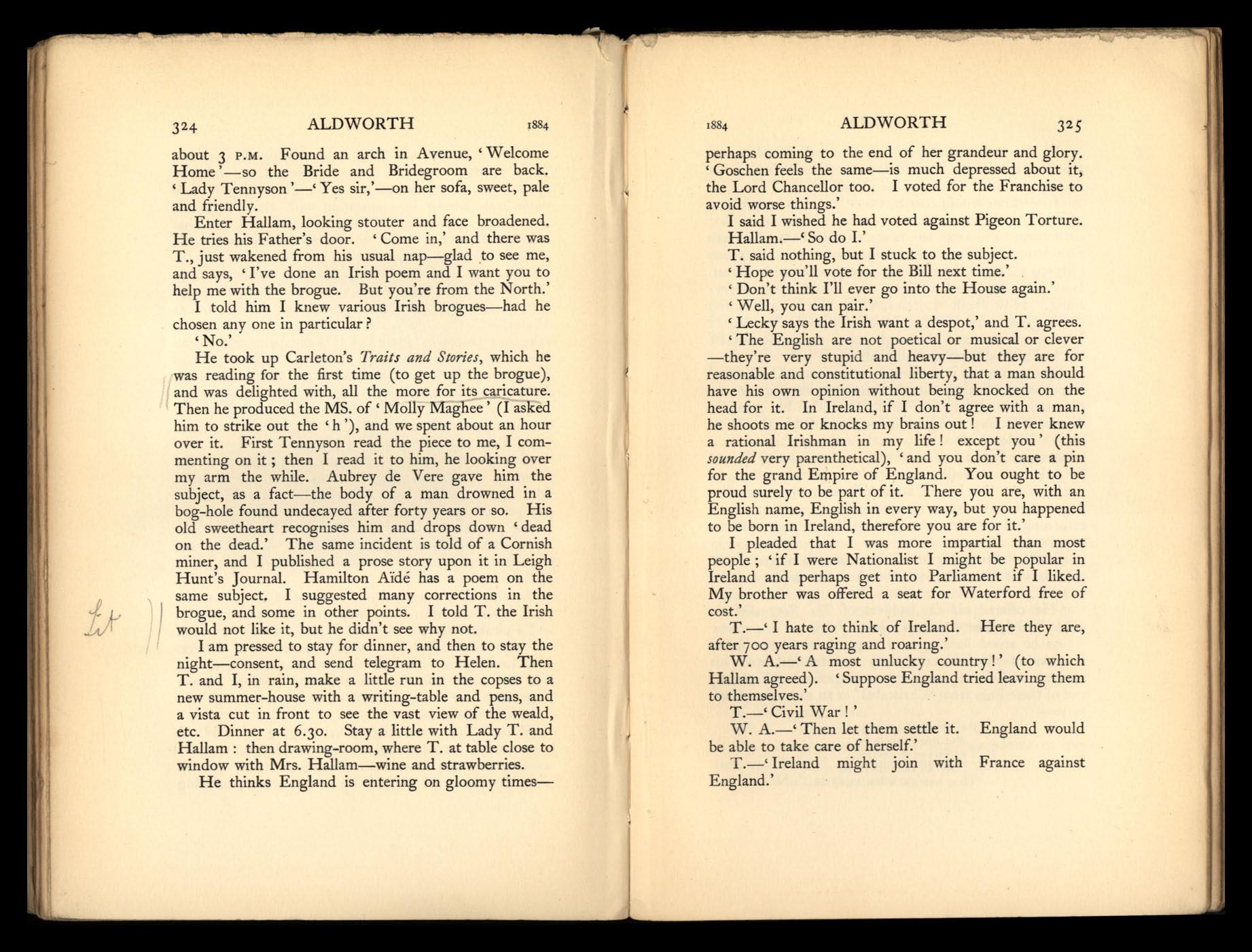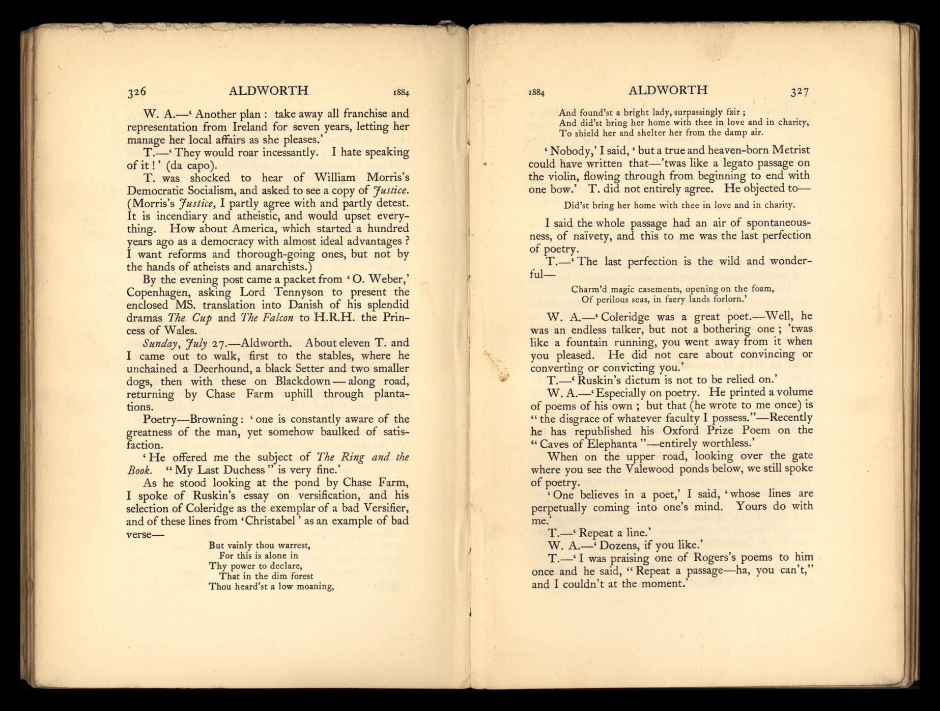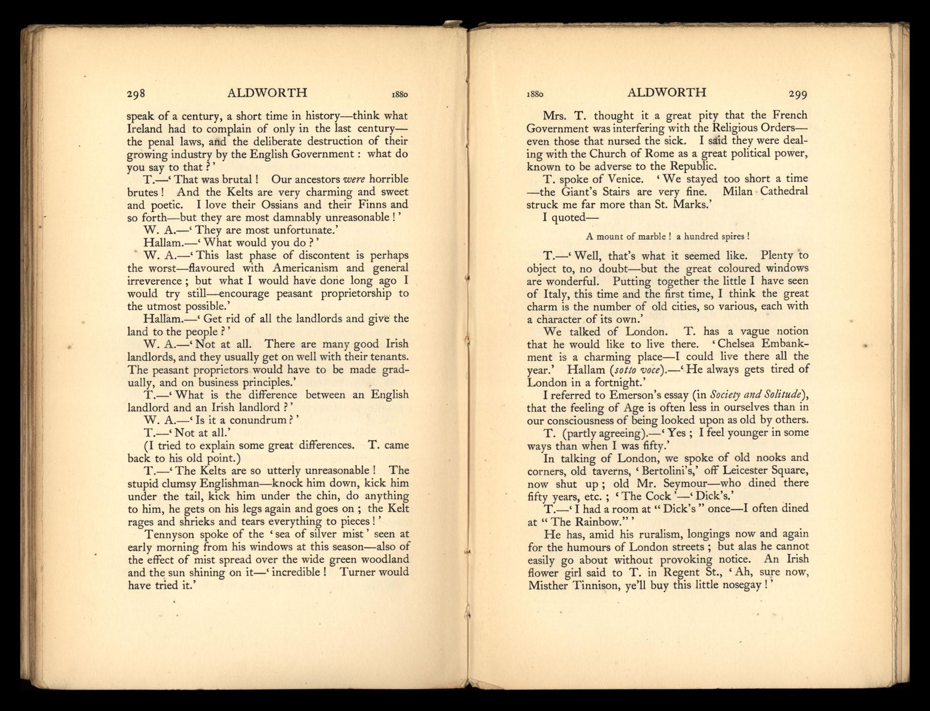 297; on politics, 288, 333, 346; distrust of Russia, 265 ; his play B URet and Henry Irving, 287; remarks on satire, 289; discussion on Browning's poetry, 290, 29 I, 326; music and its meaning, 292; Words worth, Coleridge, Shelley, and Keats discussed, 293 - 296; on the Sonnet, 302; 'ProFetty, propetty,' Farmer Thimbleby, • Northern F armer,' 312. He will not be sketched, 3 5; criticises poems of his own, JI 9, 3 20 , 334, 344; steam voyage with Mr. Gladstone and Royalties, 320; 'Molly Magee' and Irish brogue, 324, 343; votes for the Franchise, 325; discussion on poetry, 327, 350; eternal punishment an obsolete belief, 328 ; his belief in Go d, 329, 339 ; his gift of wordpainting, 331; soap-bubbles, 331; method of composition, 334 ; his friendship for Gladstone, 336; story of a Catholic picture, 337 ; his pride in the Empire, 325,338 ; recollections of youth, old Tories and Whigs, 340 ; Lincolnshire farmers, 346, 377, 378 ; ghost-story of his grandfather, 349; stories of dog and lark, 350; his anecdotes of G lad. tone and Ireland, 354; illness , gout (age 80), 381; the elfect of corrupt Latin books on boys, 381, 382