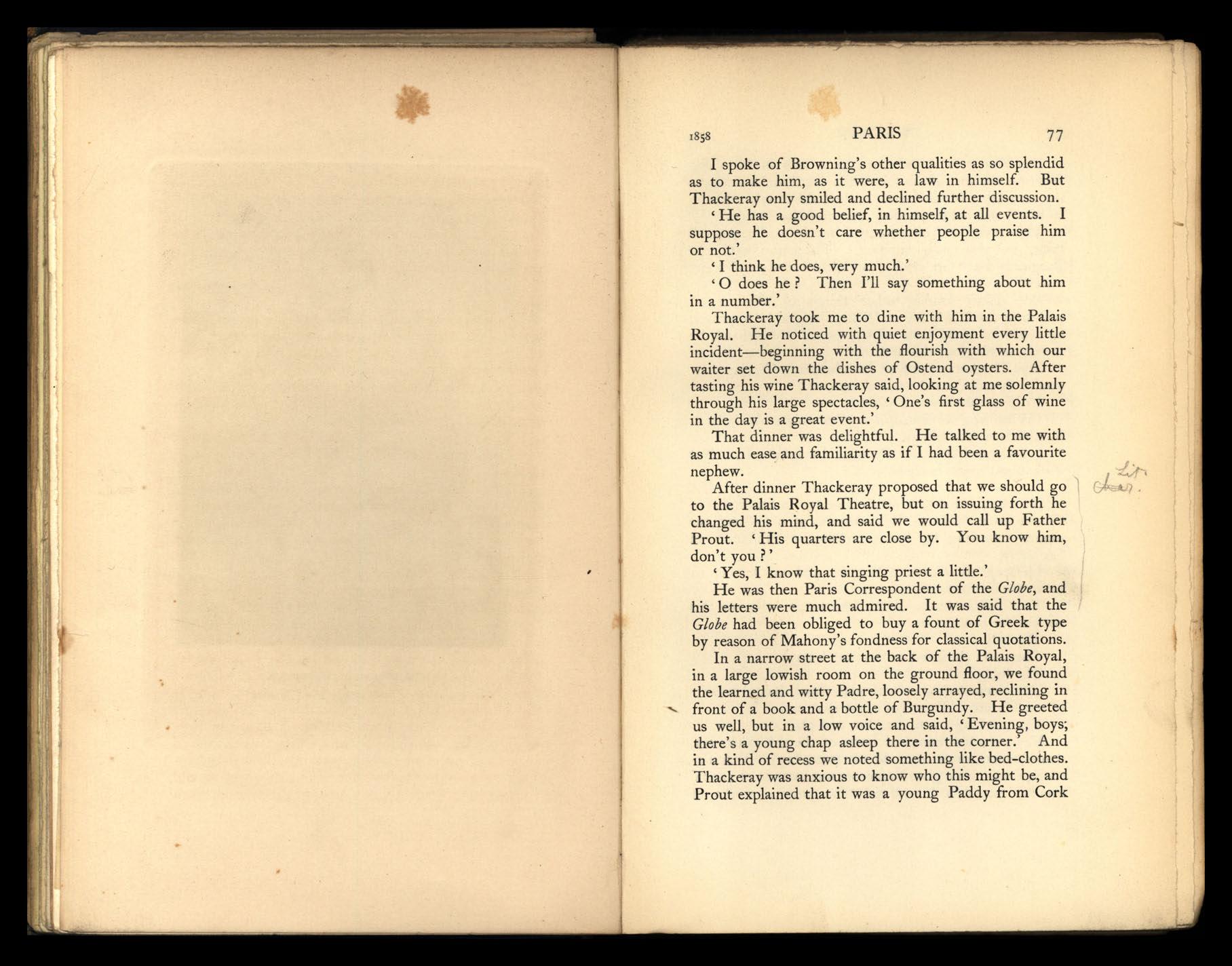 Thackeray, W. M., in Paris, 76-78; his opinion of Browning, 76; letter to Tennyson, 136, 208 Thackeray, Miss (Mrs. Richmond Ritchie), 112, 171, 175, 177, 178,