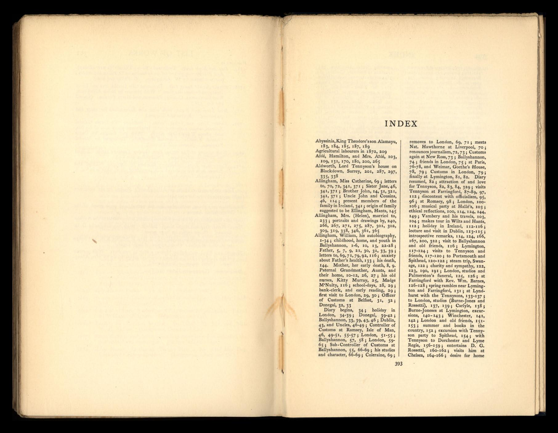 Rice, Mr., death of an old man, 123 Ritchie family, 189, 193, 265; Miss Ritchie at Tennyson's, 335, 337, 377 Robertson, Mrs. Graham, 381 Rogera, Samuel, 39, 302, 336 Romsey, Hants, 98 Rossetti family, 72; William M. Rossetti, 139; their mother, 165 Rossetti, Dante Gabriel, 59,72,74, 75, 86, 13 7, 202; designs cover for Allingham's 'Day and Night Songs,' 74; two of his pictures, 75 ; 'Venus Verticordia,' 100; his housekeeper Fanny, 100; other society, 101; detests music, 104; drawings by his wife, 144; visits Lymington, 159163; his singularities, 160, 161; Allingham's view of his character and opinions, 162-163; his visitors and garden at Chelsea, 164; Blake's drawings, 349 Ruskin, John, his lectures on Art and Life, 153; meets Mrs. AlIingham, 245, 275; laments his upbringing, 245; Carlyle's admiration for him, 263 ; visits Carlyle, 275; on Byron'. poetry, 300; on versification, 326; his poems, 327 Russeil, Countess, and daughter, 366 Russeil, George, M.P., 318 Russell, Odo, Minister at Rome, 310 Russell, Hon. Roilo, 363 Russia, feeling as to, by Tennyson, Spedding, and Carlyle, 265 ; anecdote of brutal Russian noble, 297 ; Empress and Czar of, 320
