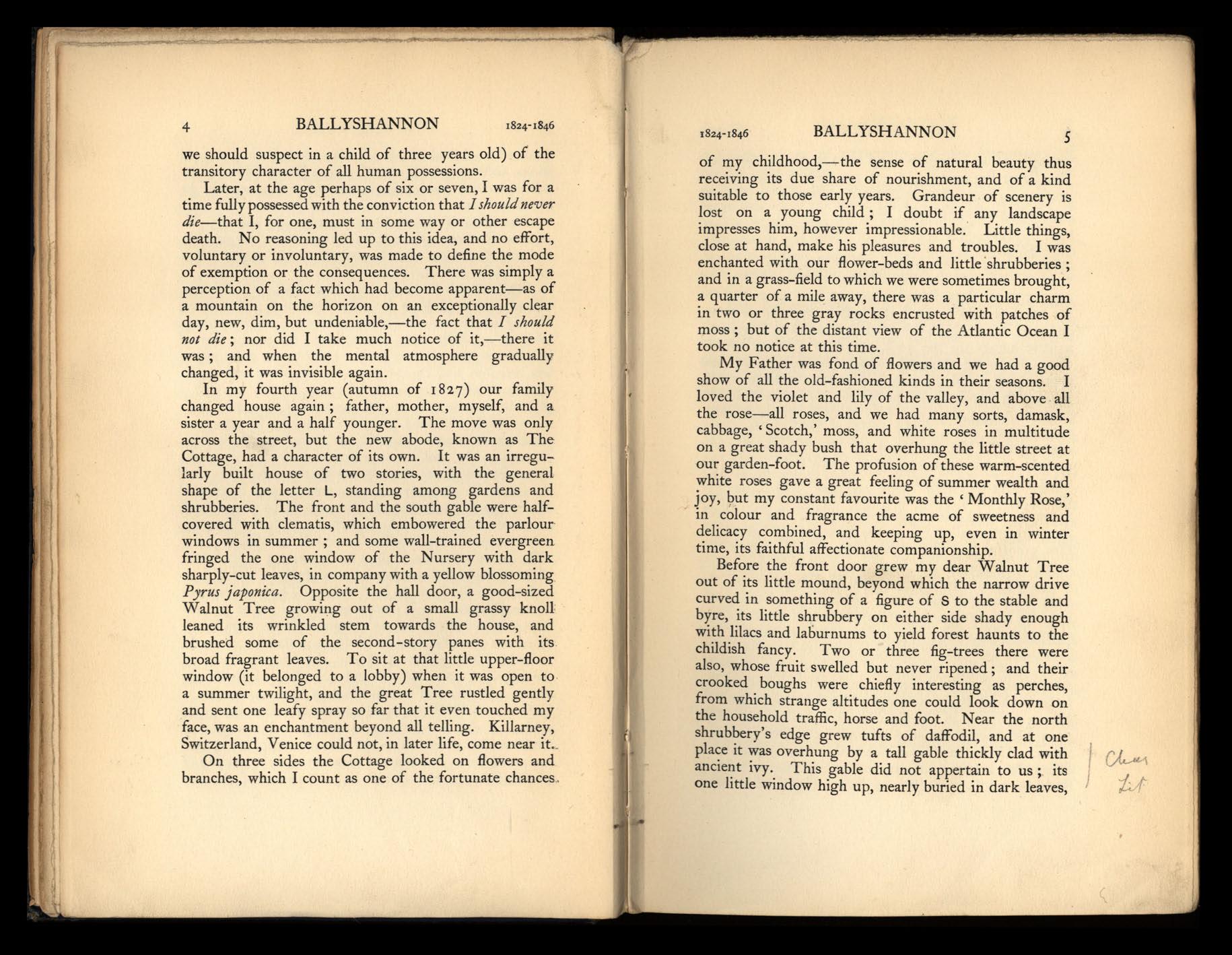 Once or twice I was taken clandestinely to mass by a nurse, on some Saint's Day most likely, and stood or sat f<?r a while just inside the Chapel door. It felt like a strange adventure, with some flavour of horror, but more of repulsiveness, from the poverty of the congregation and the intonation of the priests. I remember arguing with my nurse Kitty Murray, (who only died this year, 1883, at the supposed age of ninety-three-but I don't think it was she who took me to the chapel), for the superiority of Protestantism because 'the Catholics, you see, are poor people'; to which Kitty replied, ,It may be different in the next world.' A good answer, I felt, and attempted no retort; being indeed at no time of my life addicted to argue for argument's sake, or for triumph.
