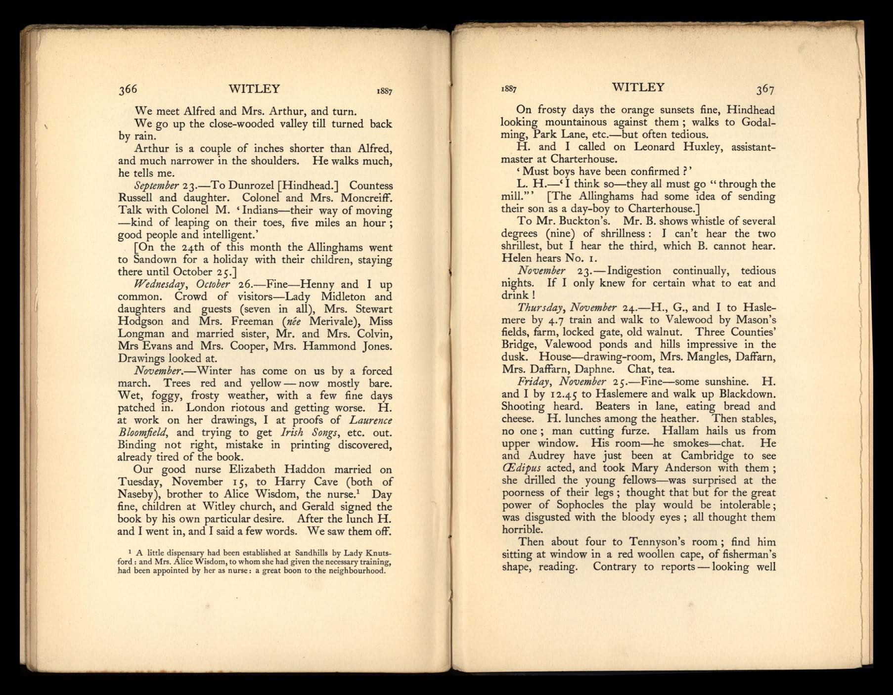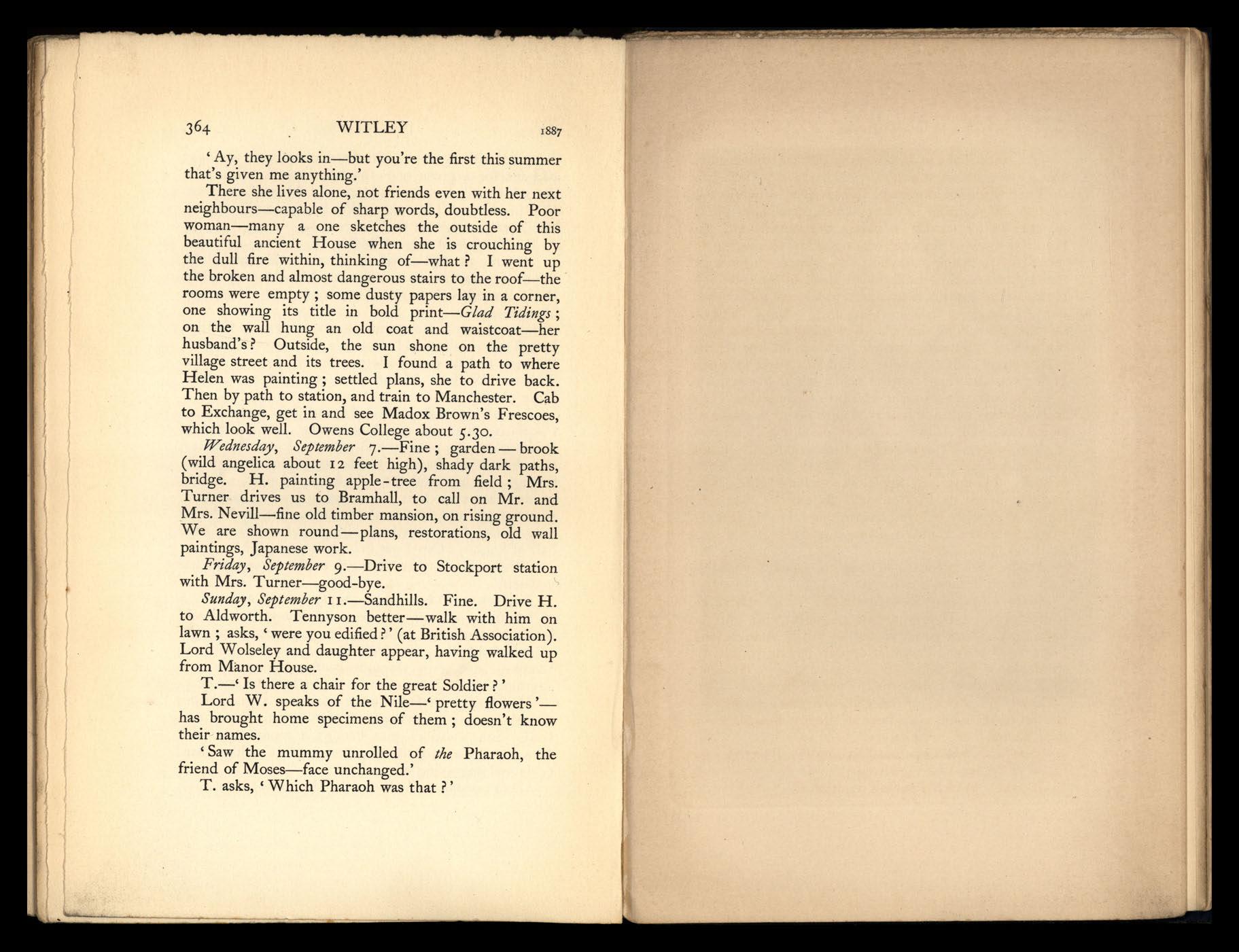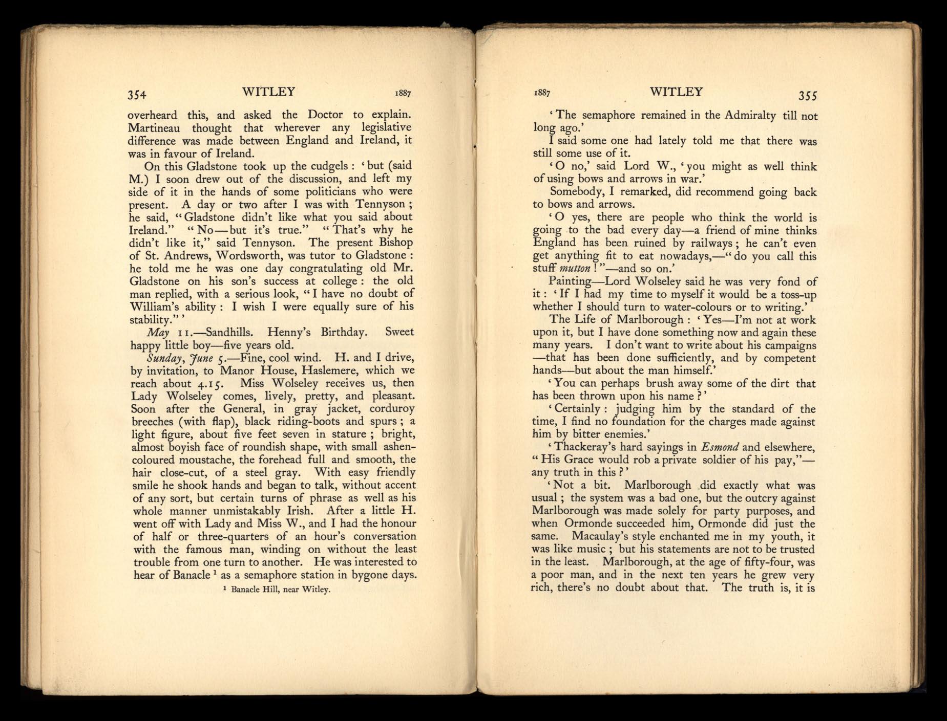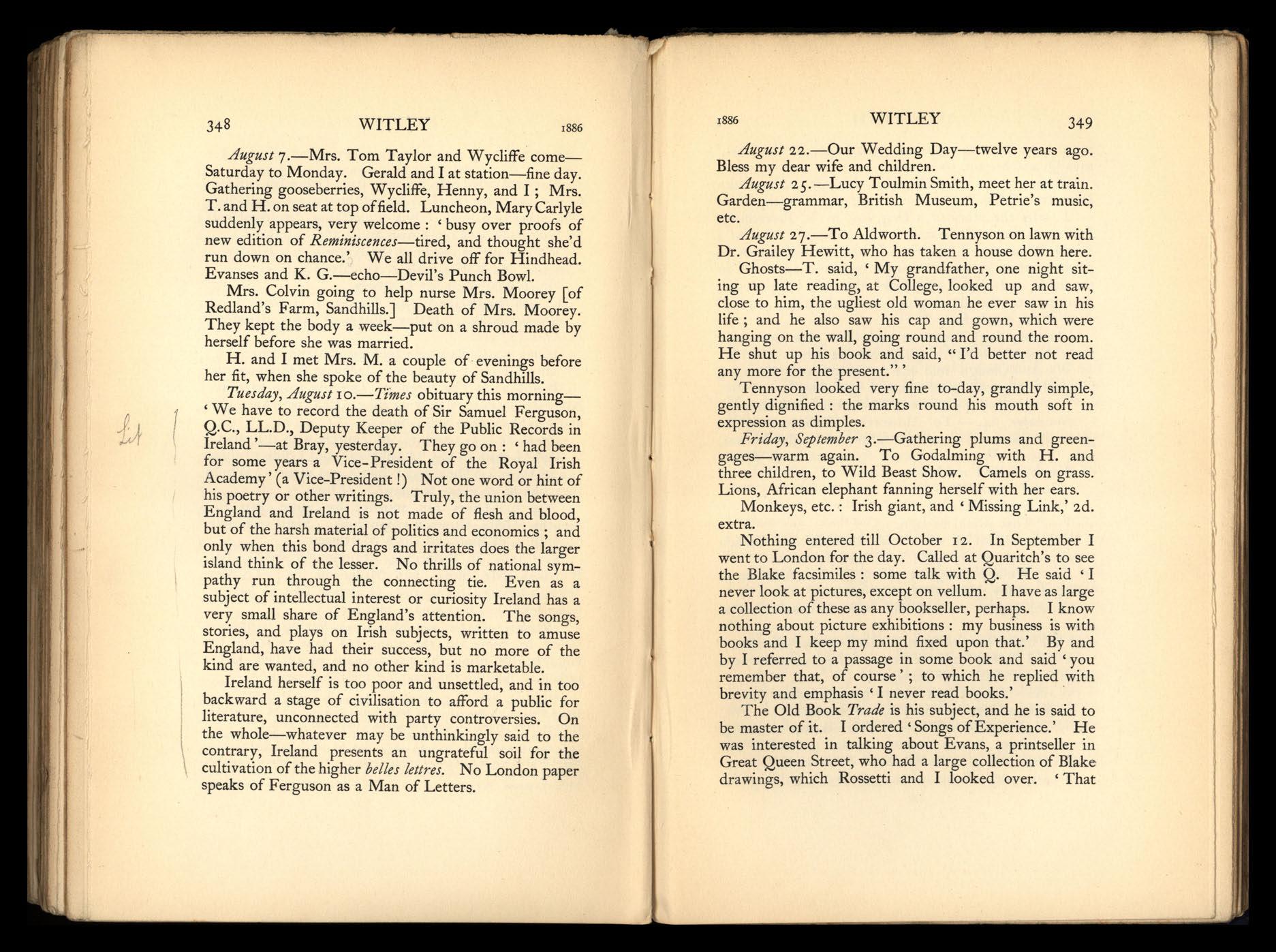 Wiseman, Cardinal, lectures at Lymington, 88 Witley, Surrey, 311-315,322,347,350, 354-35 8, 360 -3 62 , 364, 366 -37 0 ; old semaphore station at Banacle Hill, near, 354 Wollstonecraft, Mary, 191 Wolseley, Viscount, description and conversation, 354-359, 361; in the Queen'. Jubilee procession, 360; at Tennyson's , 364; Lady Wolseley, 37 1 Woolner, Thomas, R.A., his 'Puck,' 53; 58,68,79; poem' My Beautiful Lady,' 91; visitors at his house,
