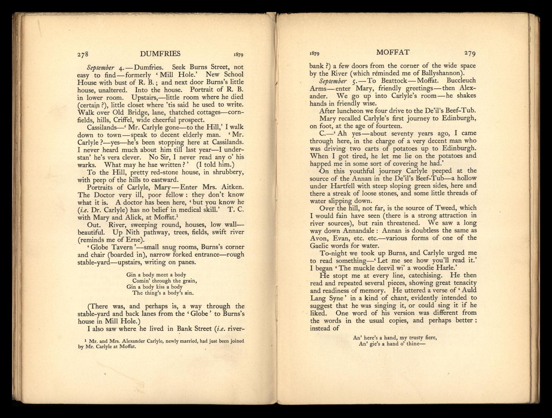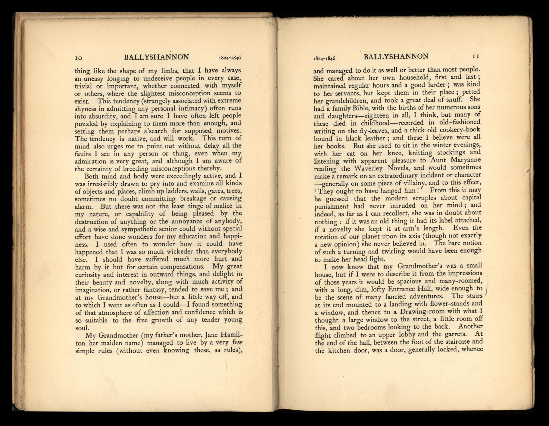 Aunt Maryanne was a voracious novel-reader. The winter evenings come clearly before me; my Grandmother in her arm-chair by the fire, with close cap, knitting incessantly, her snuff-box on a little table, an old cat called 'Norway' snoozing on the hearthrug and sometimes jumping into her lap; Aunt Bess also knitting, grave and silent; Aunt Maryanne reading aloud aWaverley Novel. I used to sit with paper and pencil, 'drawing' and also listening to the story. At any thrilling crisis ejaculations of interest or excitement were heard, and the end of a chapter often gave rise to comments, always on the incidents and characters, just as though they were real, never on the literary merits of the work or the abilities of the author. Critic;ism I of the latter kind was all but unknown in our circle, and surely its estate was the more gracious. I When I acquired, no one knew how, the art of reading rapidly, and at once applied it to every readable thing that came my way, I used sometimes to find my Aunt's novel in the daytime and take a run into the story in advance of the evening reading. On one or perhaps two occasions when I afterwards sat listening, I was unable to resist the temptation to give a hint of what was coming, whereupon Aunt Maryanne, starting up from her chair, clutched me firmly with both hands and bundled me out of the room-a very justifiable assault. Scott of course furnished the staple of the winter evenings' entertainment; but some minor story-tellers contributed to the amusement. I remember GaIt's Laurie Todd, and Horace Smith's Brambletye House, with the catchword, 'Think of that, young man! ' I think the Waverley Novels that most impressed me in those early days were Guy Mannering, The Antiquary, Ivanhoe, Kenilworth, The Talisman, but there were scenes in Waverley, The Fortunes of Nigel, Quentin Durward, The Fair Maid of Perth, The