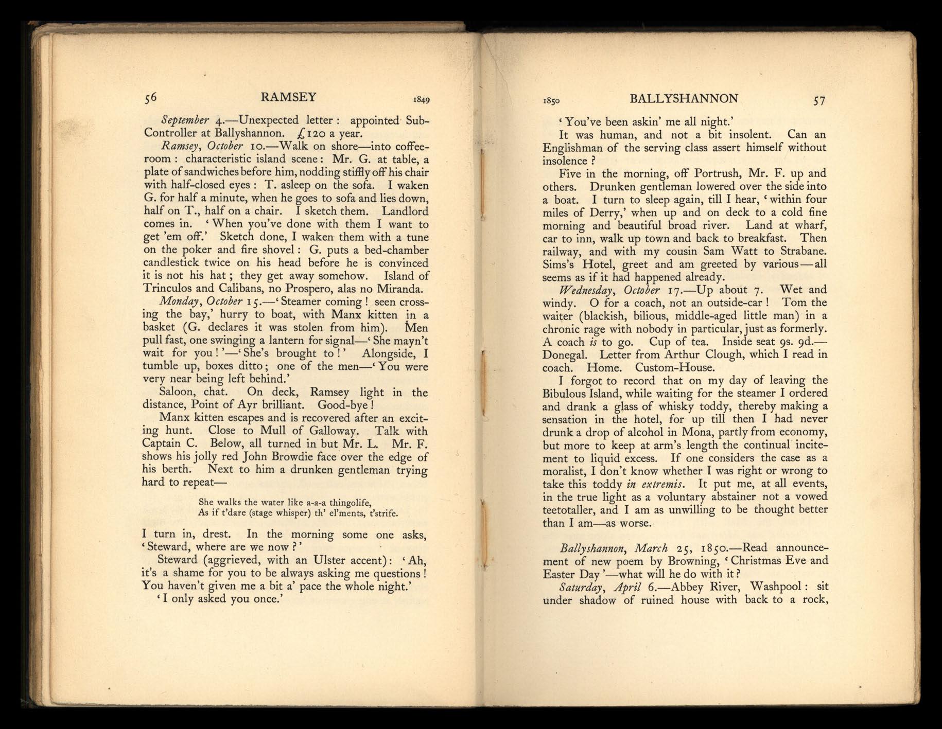 Yet I am reminded by old memoranda that there were sometimes over-clouding anxieties, sometimes, but not very frequently, from lack of money, more often from longing for culture, conversation, and opportunity; oftenest from fear of a sudden development of some form of lung disease, the seeds of which I supposed to be sown in my bodily constitution. I can recall few details of my first year at Doneg al.