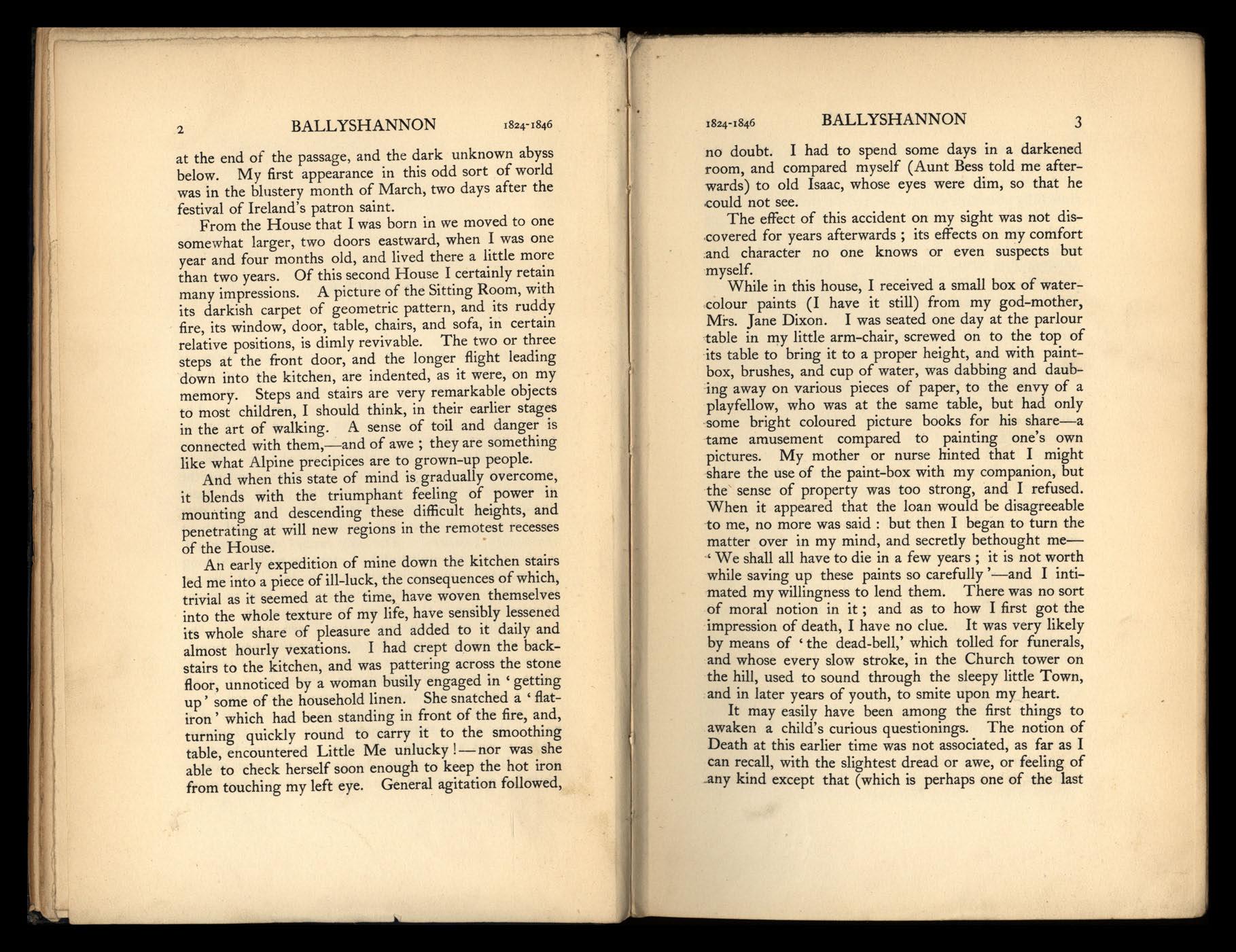 A terrible thought of Eternity sometimes came, weighing upon me like a nightmare,-on and on and on, always beginning and never ending, never ending r at all, for ever and ever and ever,-till the mind, ! fatigued, fell into a doze' as it were and forgot. I suppose this was connected, though not definitely, with the idea of a state of punishment. The suggestion of eternal happiness took no hold upon my imagination; my earliest thought of Heaven pictured it as a Sunday \ street in summer, with door-steps swept and the shutters of the shops closed. Later, there was a vague flavour of Church and psalmody. ' ....J'