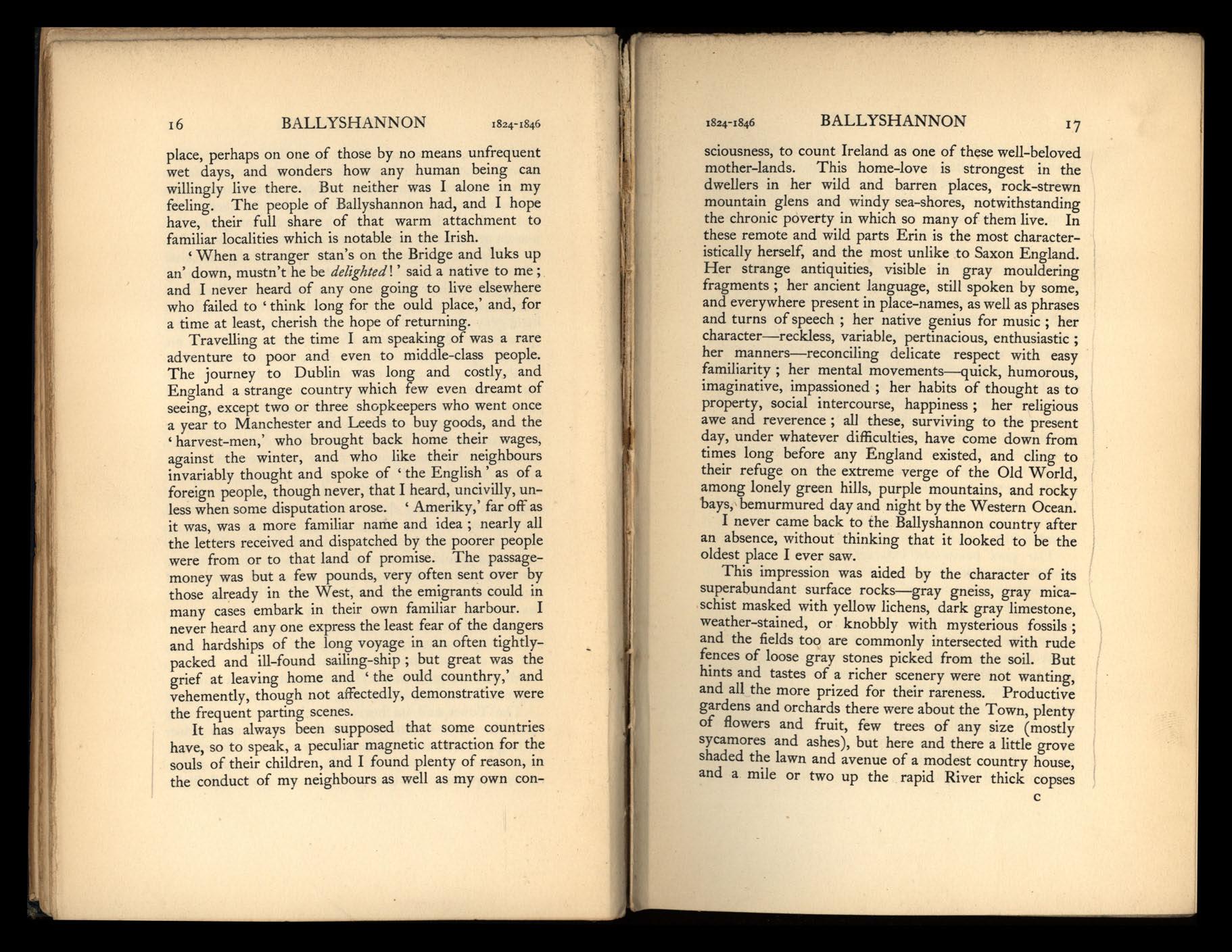 Travelling at the time I am speaking of was a rare adventure to poor and even to middle-class people. The journey to Dublin was long and costly, and England a strange country which few even dreamt of seeing, except two or three shopkeepers who went once a year to Manchester and Leeds to buy goods, and the 'harvest-men,' who brought back home their wages, against the winter, and who like their neighbours invariably thought and spoke of 'the English' as of a foreign people, though never, that I heard, uncivilly, unless when some disputation arose. ' Ameriky,' far off as it was, was a more familiar name and idea; nearly all the letters received and dispatched by the poorer people were from or to that land of promise. The passagemoney was but a few pounds, very often sent over by those already in the West, and the emigrants could in many cases embark in their own familiar harbour. I never heard anyone express the least fear of the dangers and hardships of the long voyage in an often tightlypacked and ill-found sailing-ship; but great was the grief at leaving home and 'the ould counthry,' and vehemently, though not affectedly, demonstrative were the frequent parting scenes.