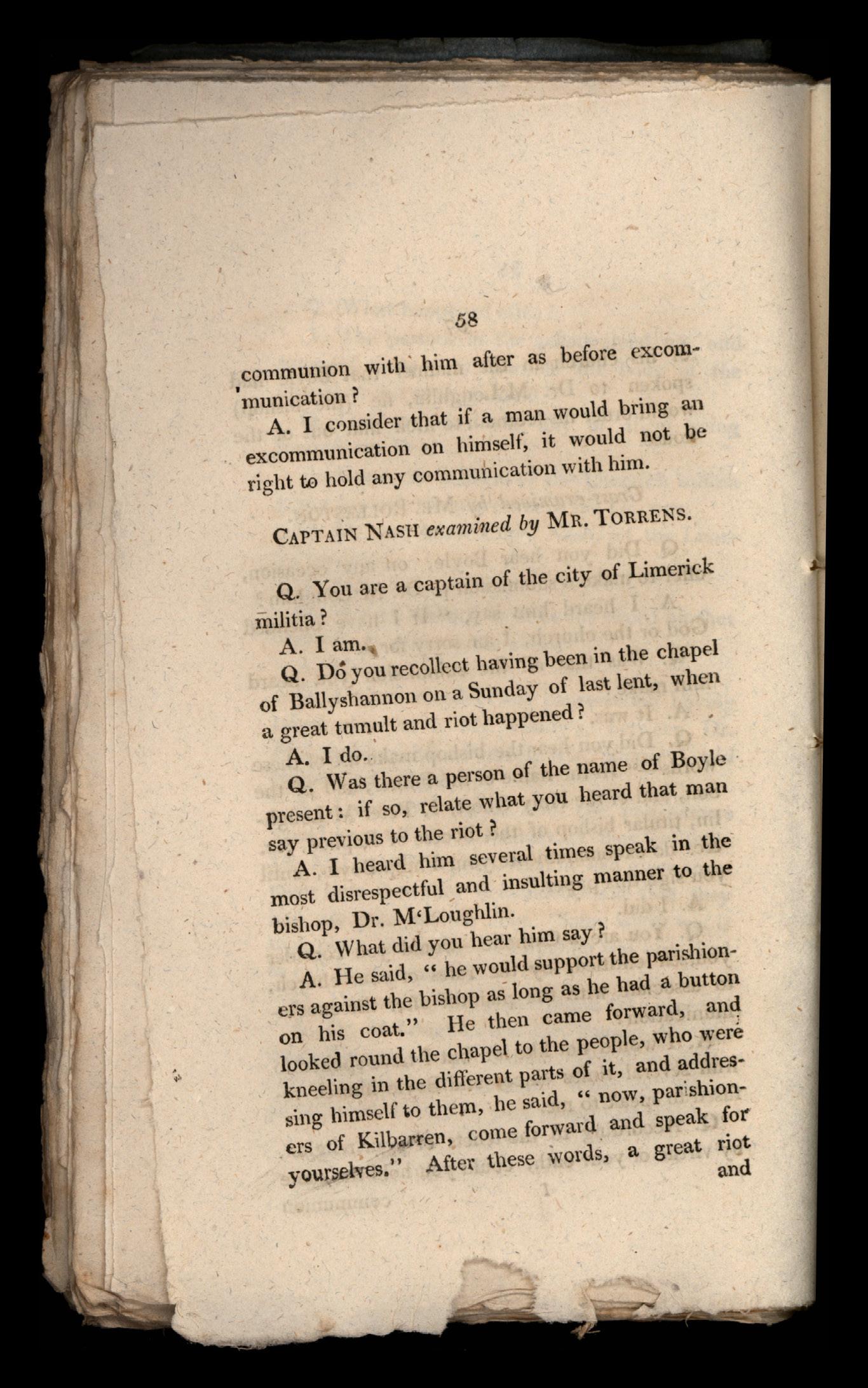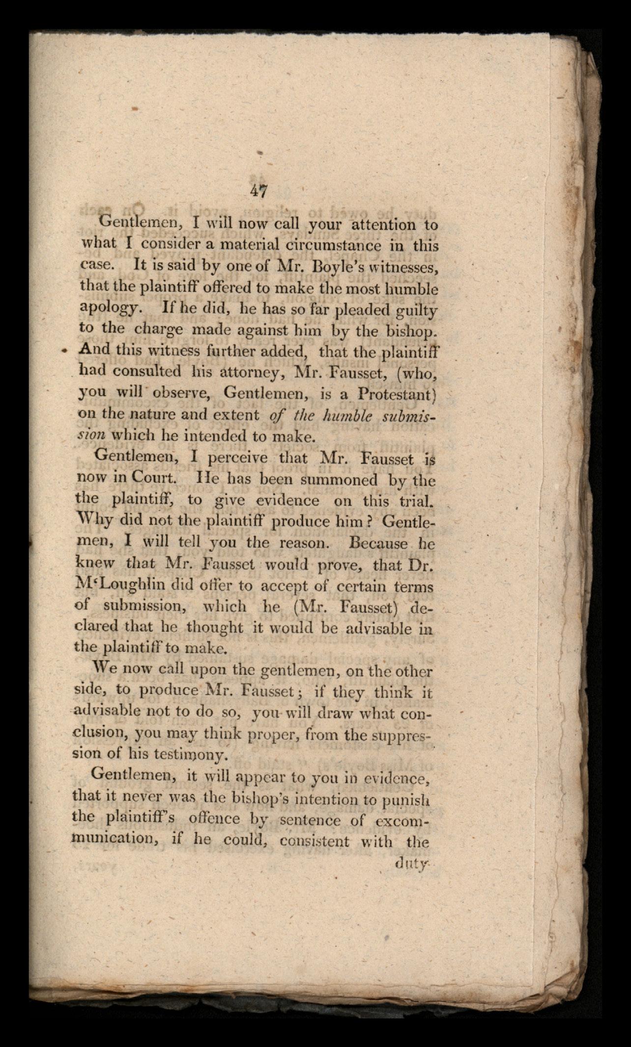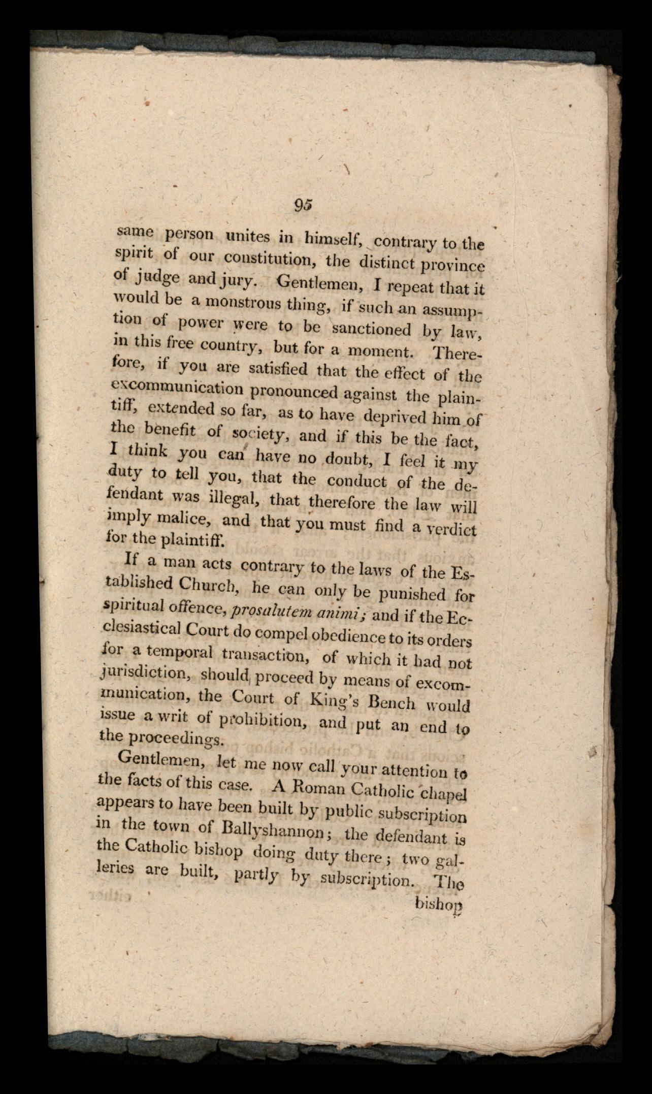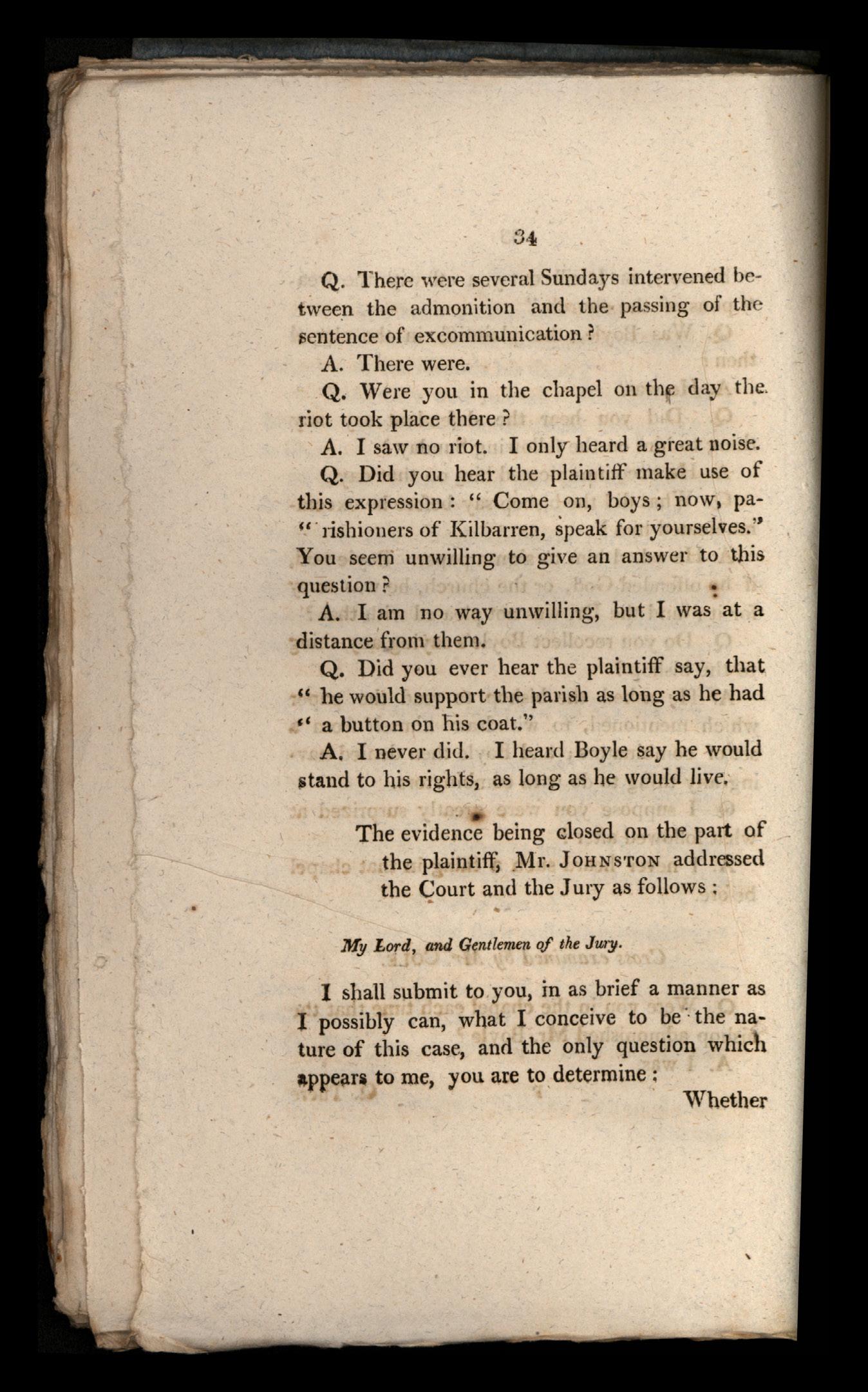 " In this case, . I am counsel on the same side with Mr Macklin; , and G entlem en, this -~ action forms a most striking contrast from that which you have now b een trying: Gentl ementhis is a Case of the most singular and important nature; and involves in its cons~quences the d earest rights and interests of so ciety.-It embraces the respect an<l reve rence, which is justly due from tl1e catholic laity, to the, catholic clergy of this kingdom ; and it will establish, b y its decision, that protection and security whi ch the laws of this Country afford to the Roman Catholic laity against the tyranny and oppression of their clergy: Gentl em en these are two points of the utmost consequen ce to th e community at large; but particularly interesting to a great majority of his maj esty' s subjects, in this kingdom