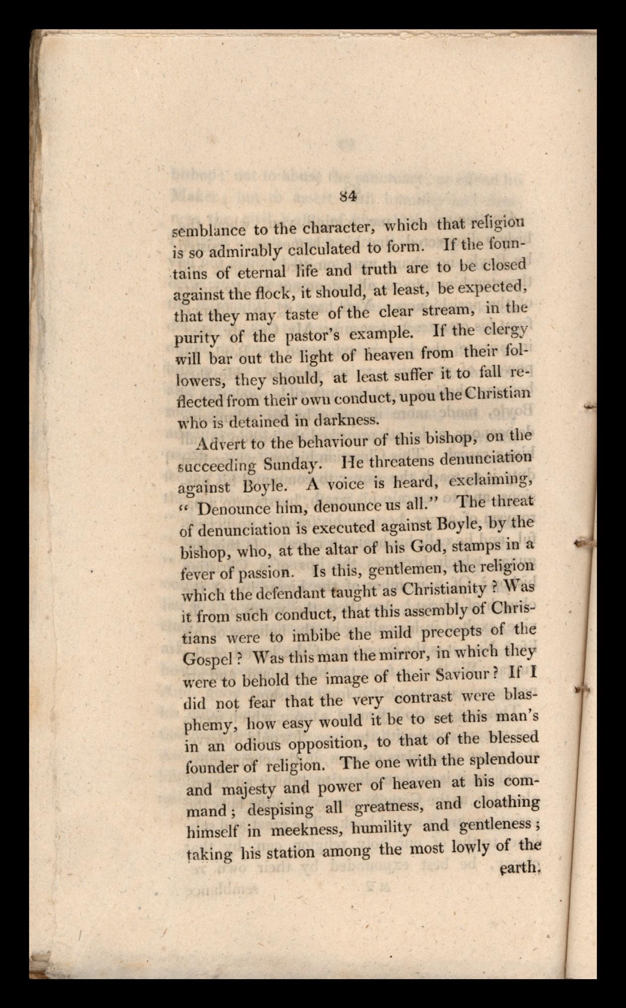 semblance to the character, which that refigion is so admirably calculated to form. If the foun.tains of eternal life and truth are to be dosed against the flock, it should, at least, be expected, that they may taste of the clear stream, in the purity of the pastor's example. If the clergy will bar out the light of heaven from their followers, they should, at least suffer it to fall reflected from their own conduct, upou the Christian ·who is detained in darkness. Advert to the behaviour of this bishop, on the E.ucceeding Sunday. He threatens denunciation against l3oyle. A voice is heard, exclaiming, " D enounce him, denounce us all." The threat of denunciation is executed against Boyle, by the bishop, who, at the altar of his God, stamps in a fever of passion. Is this, gentlemen, the religion which the defendant taught as Christianity? , Vas it from such conduct, that this assembly of Christians were to imbibe the mild precepts of the Gospel ? ,va!> this roan the mirror, in which they were to behold the image of their Saviour? If I did no~ fear that the very contrast were blasphemy, how easy would it be to set this man's in an odiolffi opposition, to that of the blessed founder of religion. The one with the splendour and majesty and power of heaven at his command ; despising all greatness, and cloathing himself in meekness, humility and gentleness ; taking his station among the most lowly of the earth.