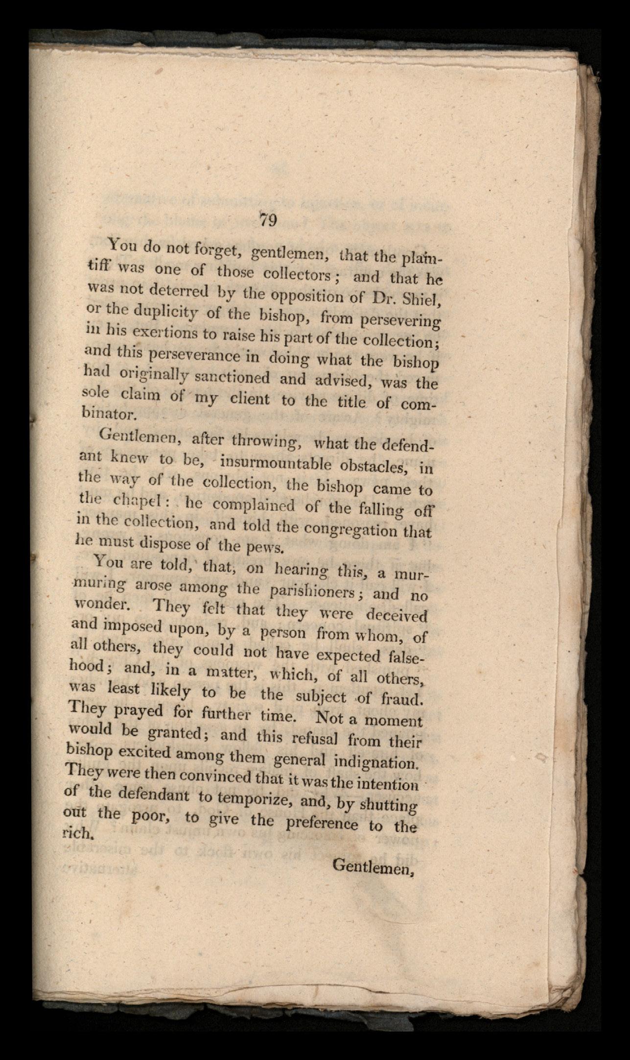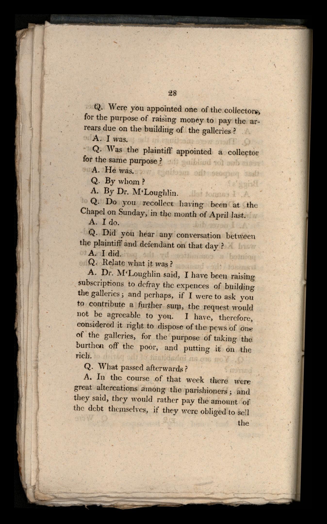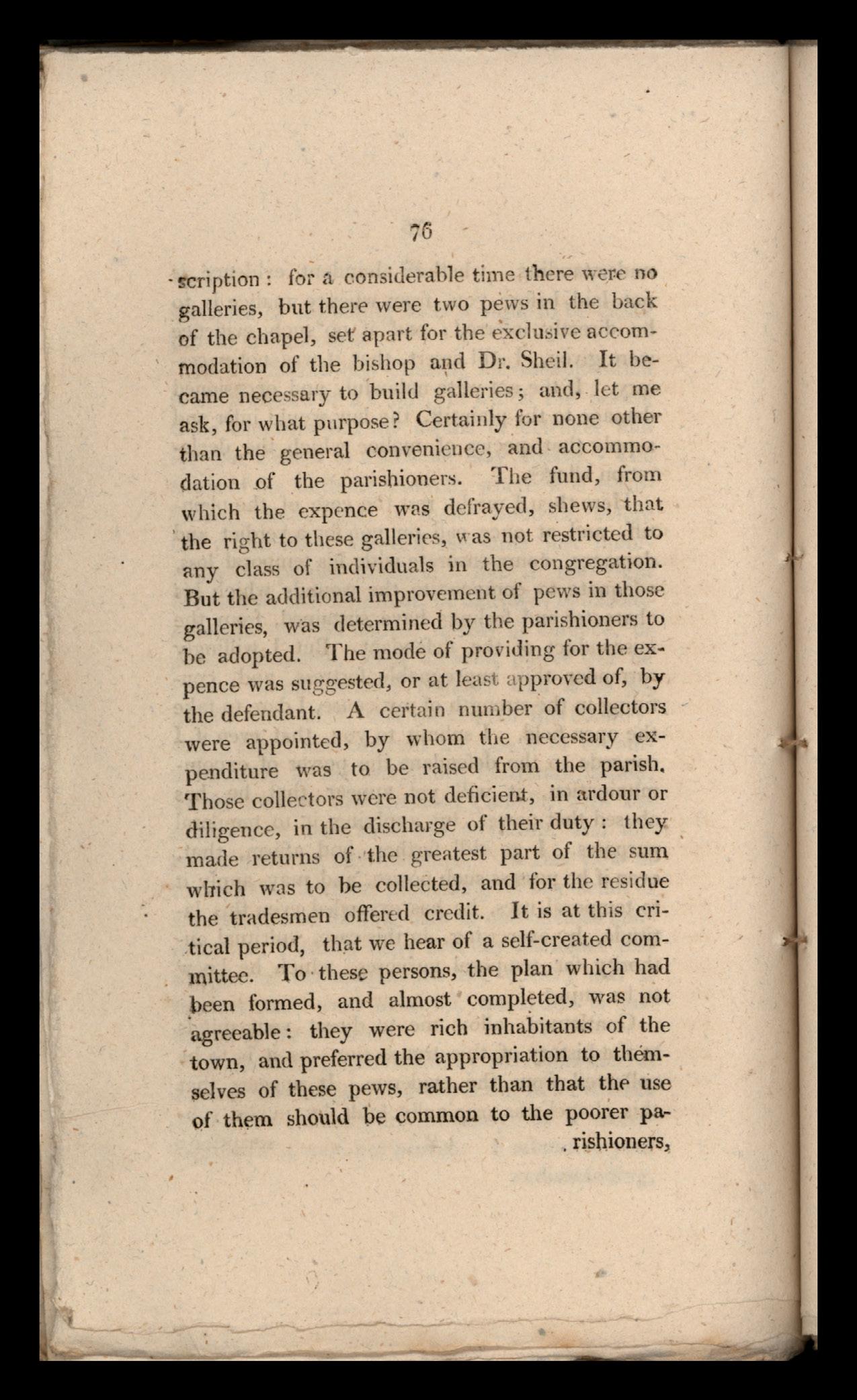 · scri pt1011 : for a consi<lerable time there "ere no galleries, but there were two pews in the back of the chapel, set' apart for the exclu,,ivc accom• modation of the bishop and Dr. Sh ei l. It became necessa ry to build galleri es; and, let me ask, for what p11rpose? Certaiuly for none other than the general convenience, and accommodation of the parishioners. The fund, from which the expcnce was defrayed, shews, that • the ri g ht to these galleri<'s, "as not r estricted to any class of individuals in the congregation. But the additional improvem e nt of pews in those galleries, was determined by the parishioners to be adopted. The mode of providing for the expence was su ggested, or at least ,1 1>pr0Yed of, by the defendant. A certain number of collectors were appointed, by who m th e necessary expenditure was to be rai sed from the parish. Those collectors were not defici e nt, in ardour or diligen ce, in the discharge of their duty : they made r eturns of the g reatest part of the sum which wns to he collected, and for th e resid ue the tradesmen offered credit. It is at this cri• tieal perio<l, that we hear of a self.created committee. To these persons, the plan which had ;been formed, and almost compl~ted, was not agreeable : they were rich inhabitants of the town, and preferred the appropriation to themselves of these pews, rather than that thf' use of them should be common to the poorer pa. rishioners,