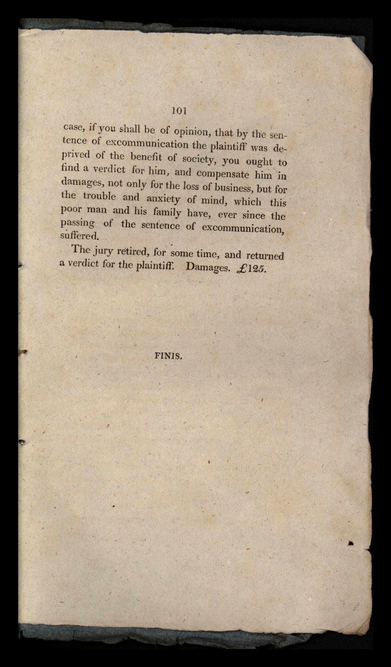 c ase, if you sh all b e of opini on, that by th e sente nc e of excommunication the plaintiff was deprived of the b e nefit of soc iety, you ought to find a ve rdict for him , and comp ensate him in d am ages , not only for the loss of bu siness, but for th e troubl e and anxi ety of mind, which this po or man and his family have, ever since the pass ing of the sentence of excommunication, suffere d.