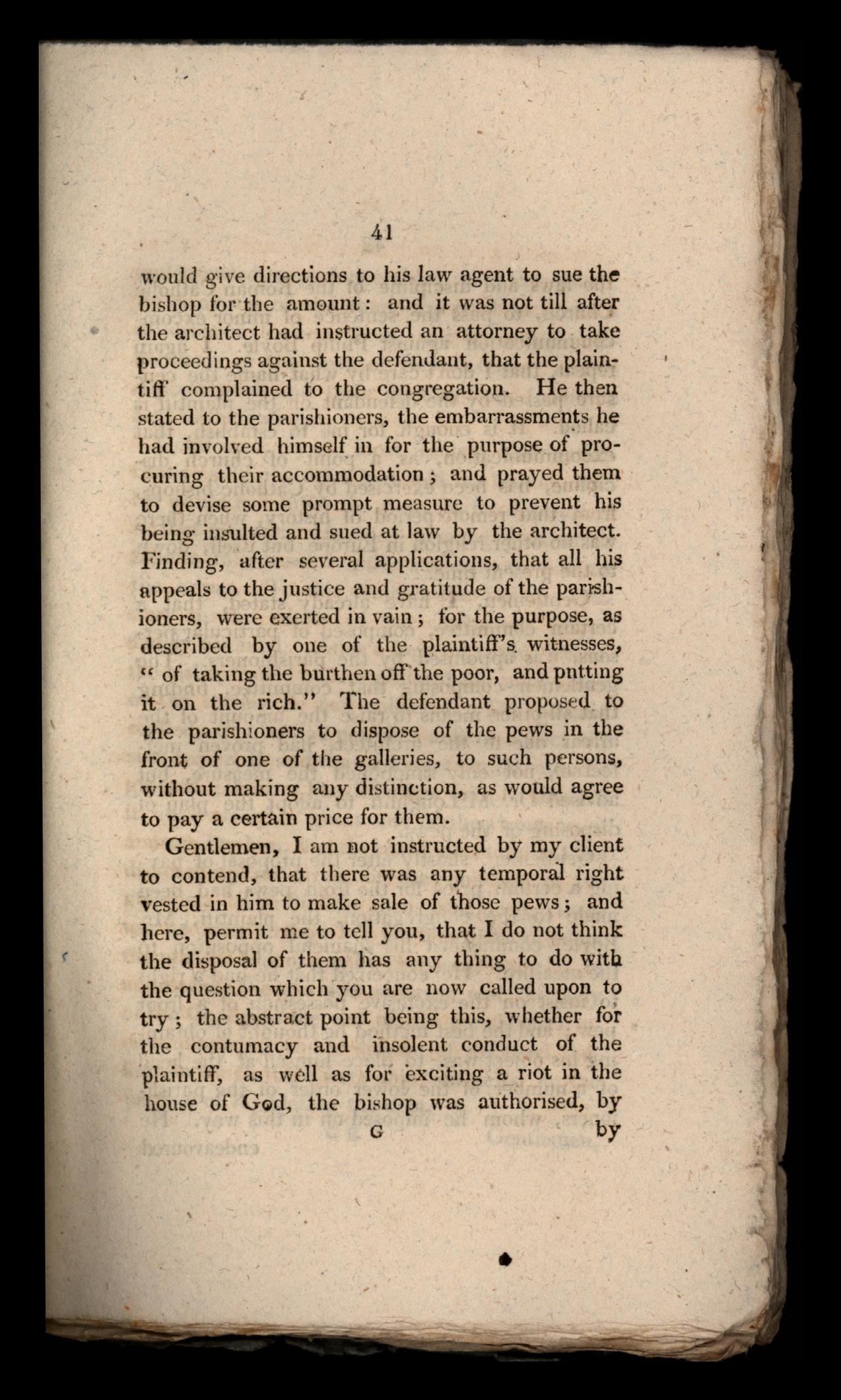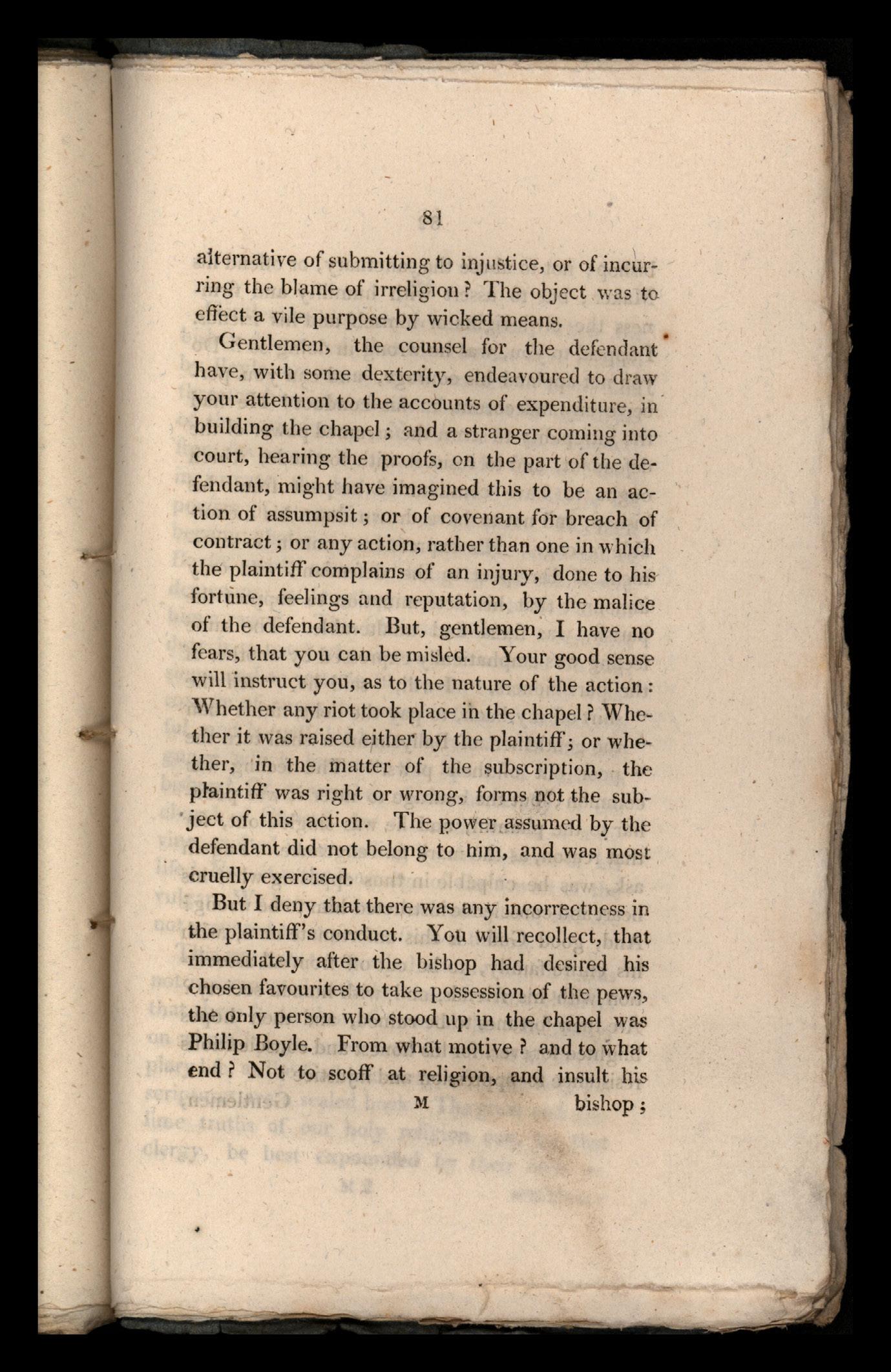 In my mind, the moment th e cc.:l e brntion of di,·ine se1Tiee was over, t!tt: bi s hop should ha1 'e retired from the chap~}, eith e r to an al e -ho us0, or to a market-house, for the purpose of de batin gthe subject, relative to those pews. He sho11l<l not ha,·c contaminated tlic house of God, hy exciting such a tumult, aml on who se head are all the ill dfects arising from his own misconduct, to be visited. What was the beginning of this riot ? The bishop ordered ecrtain gentlem~n to take possession of their seats. The plaintiff speaks from the gallery, in or<lcr to oppose this measure. Provoked b.r the opposition, the bishop lost his temper; stamped npon the altar, and said, " desist you set of coml>inators, " or I will punish you with the weapons of thC' " church." I confess, gentlemen, I cannot see in what the guilt or immorality of the plaintiff's conduct co11sistcd, or how he demeaned himself contrary to the laws of the church. How could the bishop have been so far mistaken, as to call the conduct of the plaintiff, upon this occasion, an act of combination or couspiracy. From this authoritative language of the defendant, on<;: would imagine, we were living, in the <lark bio gott~d