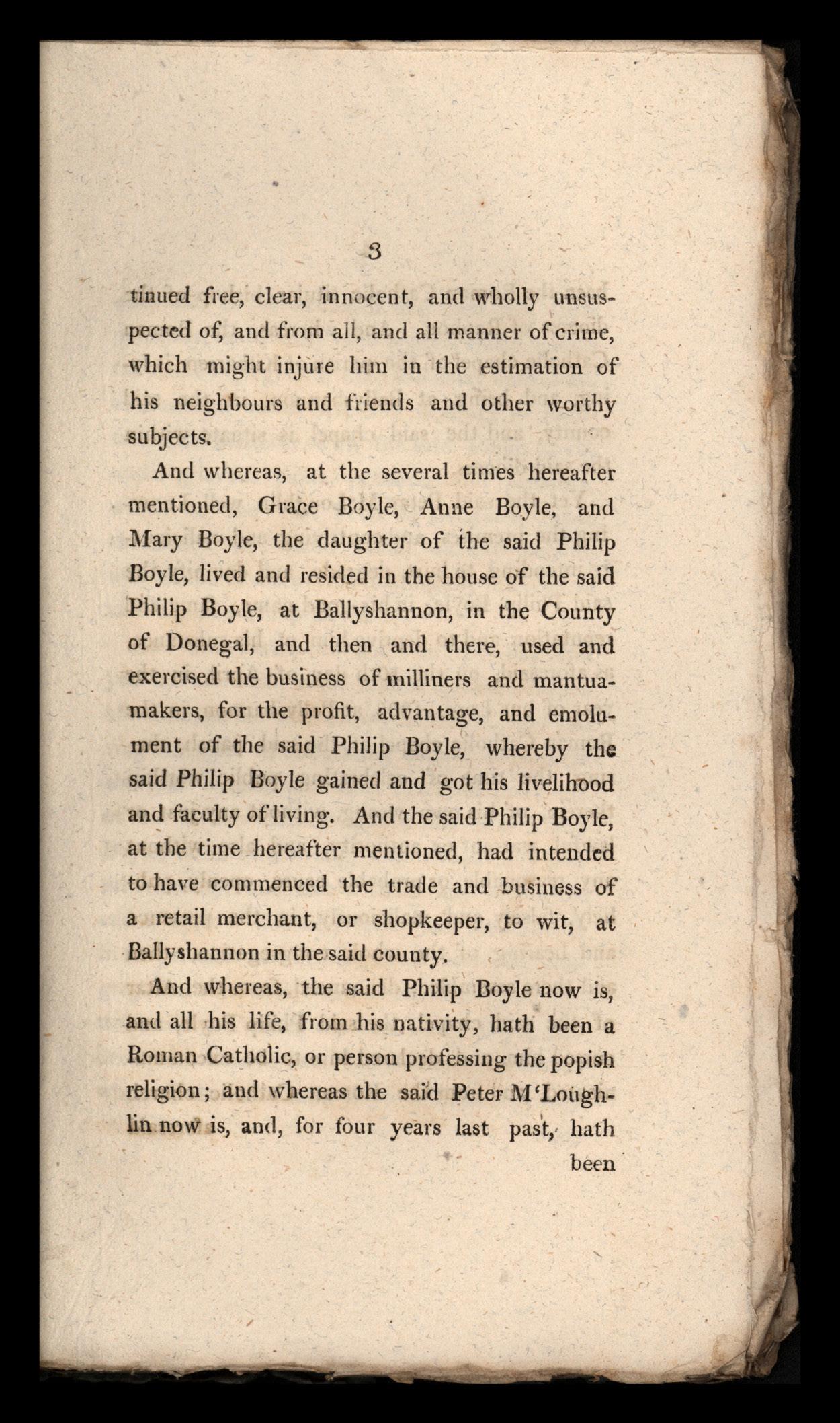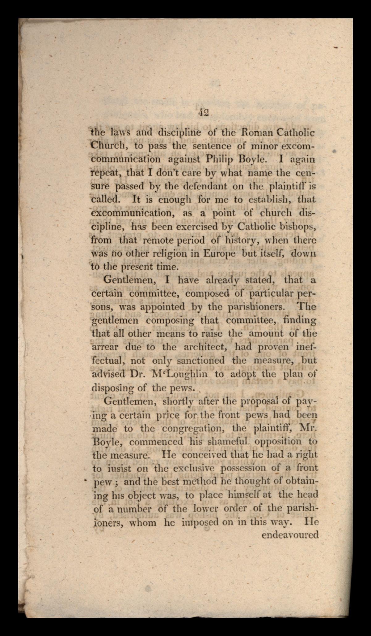 Y e t the said Peter M'Loqghlin well knowing the premi ses, and contriving, and maliciously intending, to h4rt, deg rad e, and d~mnify the said Philip Boyle, in hi s good na me, fame and reputatjon , and to d eprive h im o f his subs tance, ~s afor~said, on th e 10th day of April, in the year of pµr Lo rd , 1808, a t Bally shannon, in the Romaq. Cl!.tholi c c h apel of th e said parish, du~ rmg t}?e time pf ~elebrating public worship therein, of his own wrong, without any just or Jawfui warrant or aµthority, and also withoui any reaso~able or probable c~use, openly, pub-:licly, fcJ.l sely and maliciously, in the presence 1 ~nd hearing · of. the whole congregation, then ~nd th~re assembled, denounced, from the Altar pf tµt! •said c~apel, the said Philip Boyle, an<! ~ursed him, and declared him to be excornmupicaied~ a~d from t~e .R,oman C~tholic church
