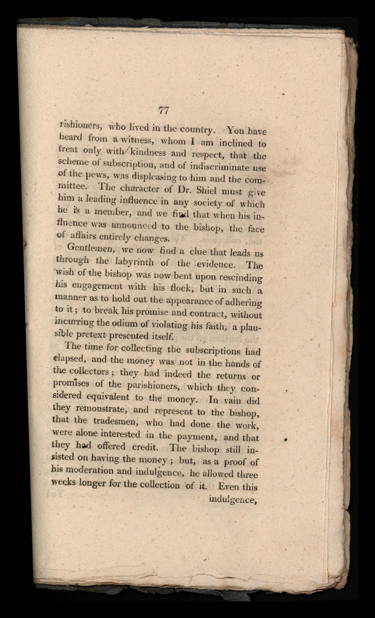 Gentlemen, we now finc'I a clue that leads us through the labyrinth of the e\'idencc. The wish of the bishop was now bent upon rescinding his en gagement with his flock, but in such a mann er as to hold out the aµpcarance of adhering to it; to break his promisP and contract, without incurring the odium of violating his faith, a plau- sible pretext presented j1:5clf.