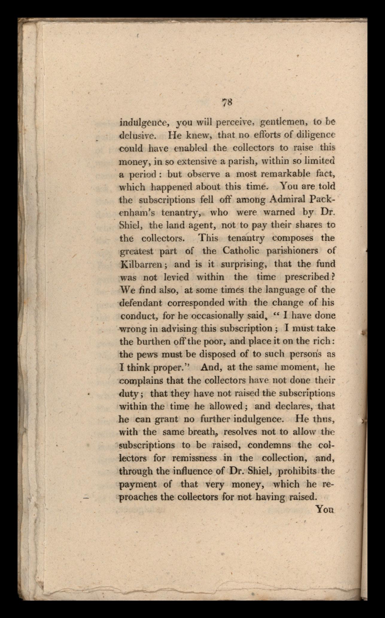 indulgence, you will p erce ive, ge ntlem en, to b e delu sive . He knew, th a t no e ffort s of dili ge n ce could have enabl ed the collectors to rai se thi s money, in so extensive a parish, within so limited a p eri od : but ob se rve a most r e ma rkable fa ct, which happ en ed about this time. You are told the sub scriptions fell off among Admiral P ac kenham' s t cnant ry, who were warned by Dr. Shiel, the land agent, not to pay their shares to the collectors. This t enantry composes the greatest part of the Catholi c parishioners of Kilbarren; and is it surprising, that the fund was not levied within the time prescribed ? "\Ve find also, at som e tim es th e language of th e defendant corresponded with the chan g e of his conduct, for he occasionally said. " I have done wrong in advising this subscription; I must take the burthen off the poor, and place it on th e rich : the pews must be disposed of to such p ersons as I think proper.' ' And, at the same moment, he complains that the collectors have not don e thei r duty; that they have not r aised the subscription s within the time he allowed; and d eclares, that he can grant no further indulgence. H e thu s, with the same breath,, resolves not to allow the subscriptions to be r a ised, condemns the collectors for remissness in the collection, and, through the influence of Dr. Shiel, prohibits th e payment of that very money, which he reproaches the collectors for not having raised. You