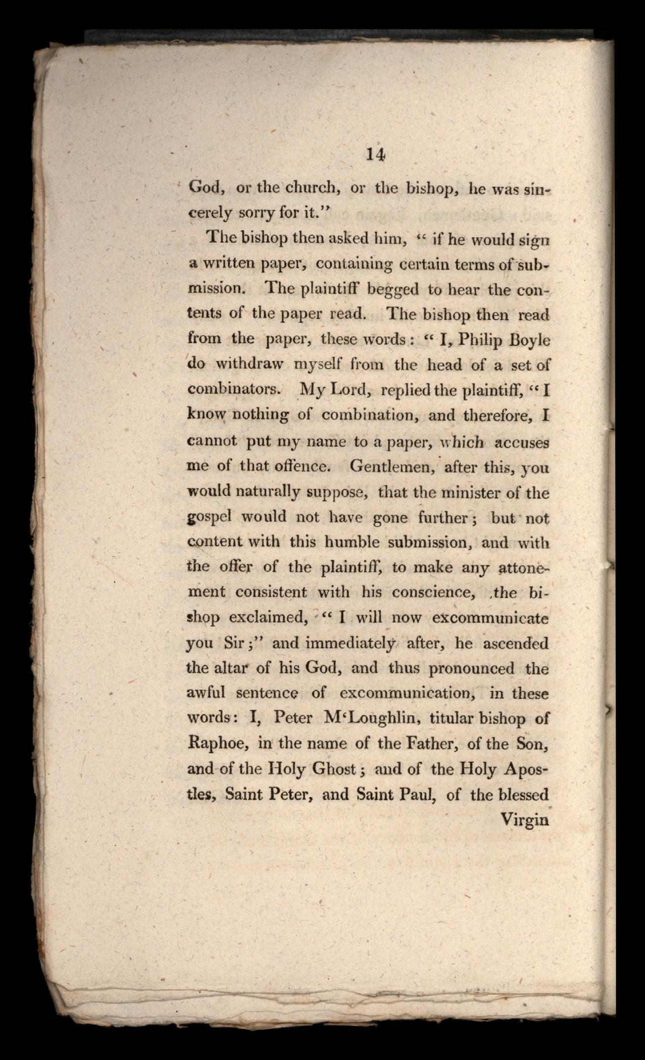 The bishop then asked him, " if he would sign a written paper, containing certain terms of ·submission. The plaintiff begged to hear the contents of th e paper read. The bishop then read from the paper, these words : " I, Philip Boyl e <lo withdraw my self from the head of a set of combinators. My Lord, replied the plaintiff, "I know nothing of combination, and therefore, I cann ot put my name to a paper, "hich a.c c uses me of that offence. G entl eme n, · after this, you would naturally suppos e, that the minister of th e io spcl would not hav e gone further; but not content with this humble submission, and with the offer of the plaintifl: to make any ~ttonement consistent with his conscience, .the bishop exclaimed, " I will now ex.communicate you Sir;" and immediately after, he ascended the altar of his God, and thus pronounced the awful sentence of excommunication, in these words: I, P eter M•Loughlin, titular bishop of Raphoe, in the nam e of the Father, of the Son, and of the Holy Ghost; and of the Holy Apostles, Saint Peter, and Saint Paul, of the blessed Virgin