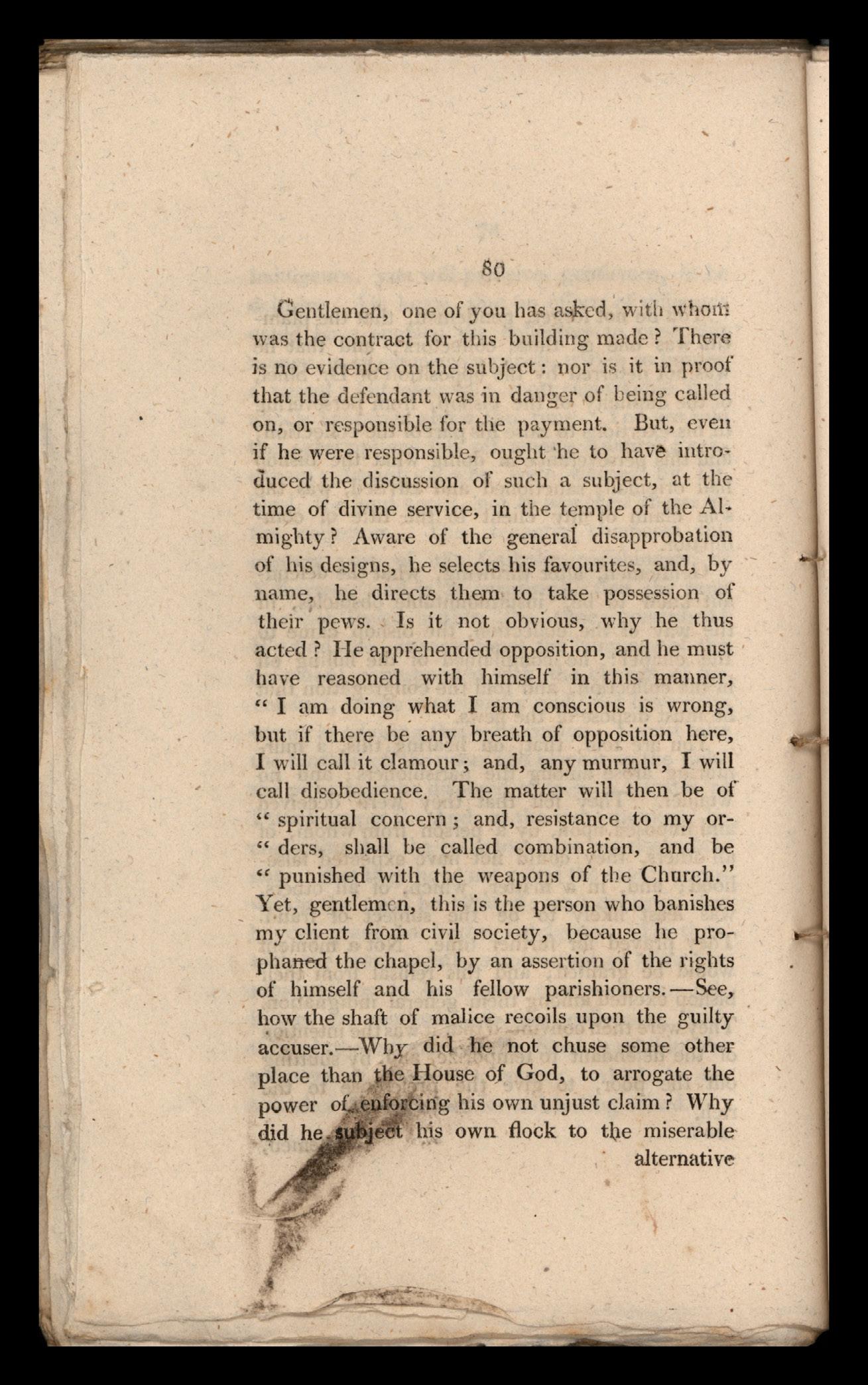 Gentlemen, one of you has asked, with wh 011, was the contract for this building made? There is no evide nce on the subject : nor is it in proof that the defendant was in dallgcr of bei n g called on, or respon sible for the p ayme nt. But, even if he were respons ible, ought ·he to h ave introduced the discuss ion or su ch a subj ect, at the time of divine service, in th e temple of the Almighty? Aware of the generai di sap pro bation of his designs, he selects his favomites, and, b y name, he direc ts them to take po ssession of their pc ws. Is it not obvious, why he thus acted ? Ile apprehended opposition, and he must have reason ed with him self in this manner, " I am doing what I am conscious is wrong, bnt if there be· any breath of opposition here, I will call it clamour; and, any murmur, I will call disobedience. The matter will then be of " spiritual conce rn ; and, resistance to my or" dcrs, shall be called combination, and be "punished with the wea pons of tb e Church . " Yet, gentlemrn, this is the person who banishes my client from civil soci ety, because h e prophaned the chapel, by an assertion of the rights of himself and his fellow parishion ers. -See, how the shaft of malice recoils upon the guilty ~ccuser. - Why did he not chuse some other place than the House of God, to arrogate the power 04e~rting his own unjust claim ? Why ~d he his own flock to tQe mise rable alternative