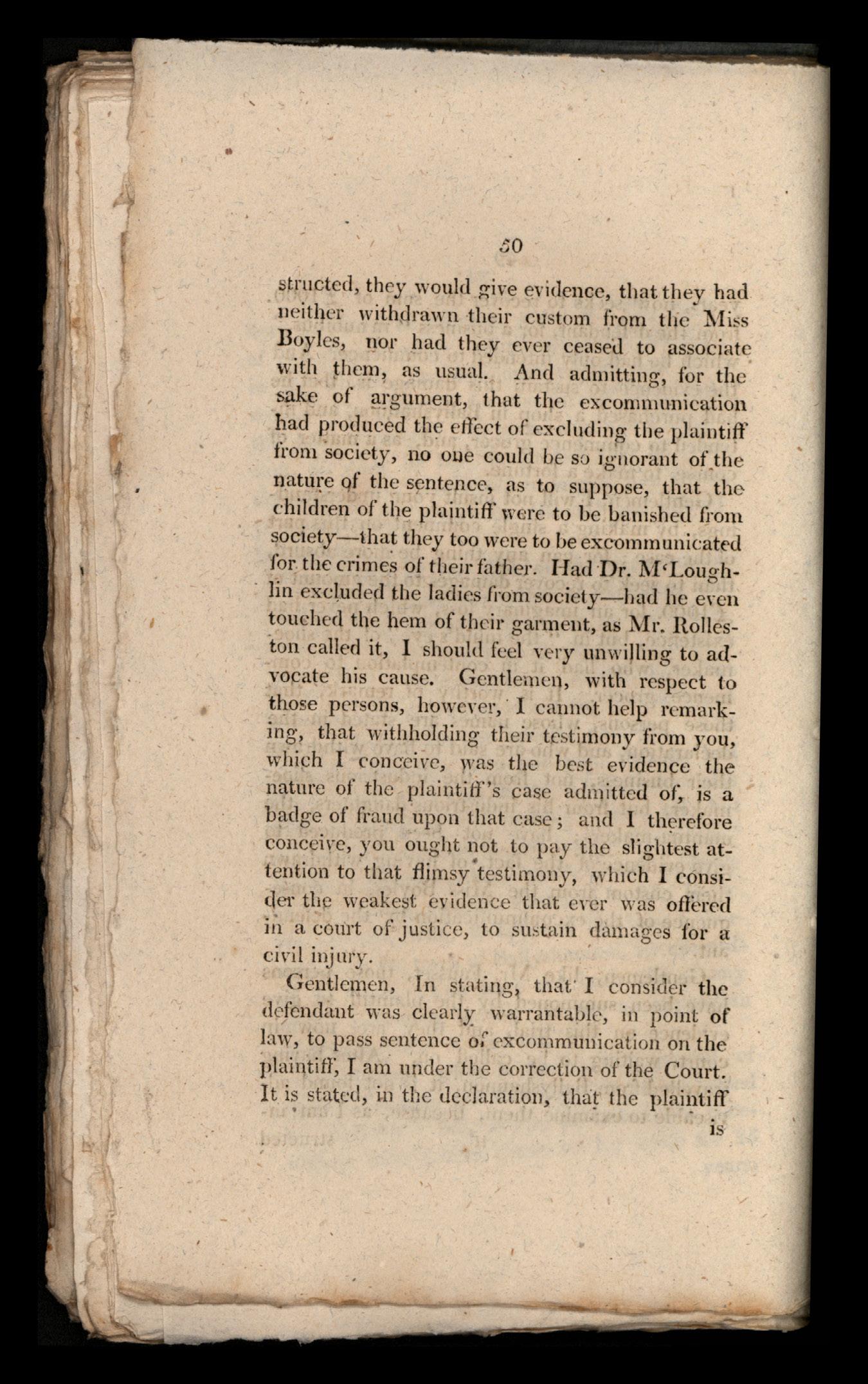 It has bcfo , cry ing- cniously contend ed by the gentlemen on the other !>ide, that the effoct of excomm1111ication in the Catholi c Chur(h is twofold-namc-ly, either to deprive the p erson s censured of participating in the sacraments, or to exclude him from socie ty. And th ey have endeavoured to shew, that the excommunication pronounced in this io stance by Dr. M ' Loughlin, did not extend to (;Xclu tl e th~ plaintiff from society. 1£ this were real.y the fact, (which I