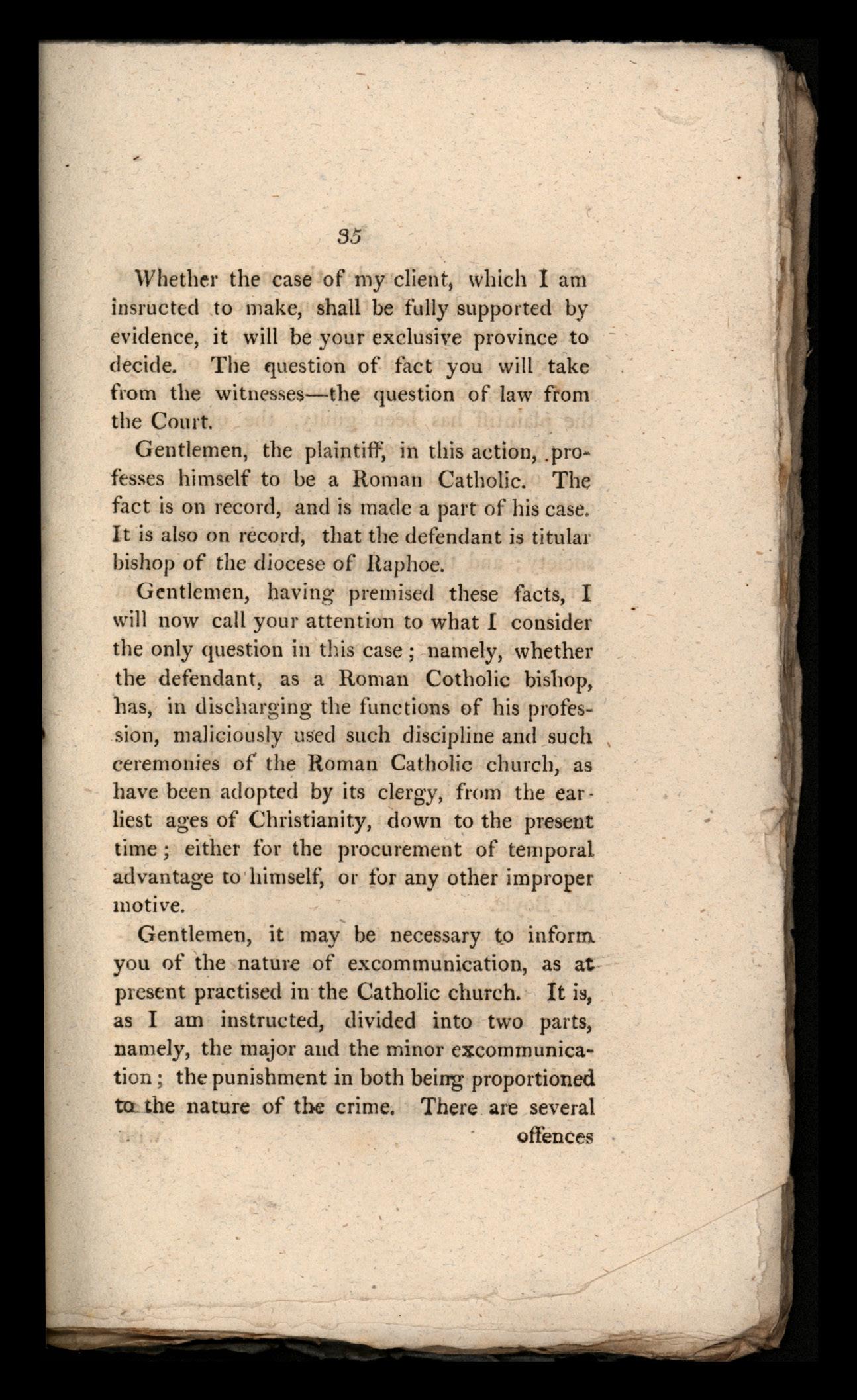 Gentlemen, it is quite unnecessary to impress on minds like yours, the awfnl importance of the duty you have now to perform. This discussion is not confined to a question of property or right, disputed between two individuals, and important only to them. You are not now to balance the weight of evidence between two parties, on a sul>Ject where the public is not interested; and on the decision .of which, no rule to govern the conduct of any class of men can depend. No-your verdict, in its consequences, will, of necessity, involve the dearest privileges, and rights esteemed the most sacred, of a highly respectable class of your fellow subjects.-You are called upon, in the exercise of your solemn function, as Jurors, to draw some line of Jemarcation between the civil rights of tbe Catholic laity, and that spiritual power, which is claimed by their clergy.-You are 11t>t required by the plaintiff to compensate any injury of his, by the destruction of all spiritual power in the pastors of his church; but he does require of you satisfaction, if the legitimate authority of a catholic bishop, has, to his damage, been transgressed uy