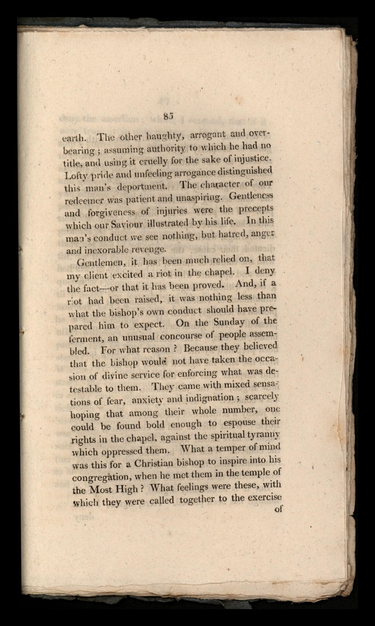 t•arth. The olher haua;ht)t, arrogant arnl owr• bearing ; assumin~ authority to which he had no title, am\ using it crnclly for the sake of injustice. Lofty prirlc :mcl unfeeling arrogance distinguished thi'> man's deportment. The ch:u;actcr of our re<lecmcr was patient and unaspiring. GeutlcnCf-'S and forgiveness of injuries were the precepts which our S,n-iour illustrated by his life. In this ma:1's conduct we see nothing, hnl hatrecl, anget and inexorable rC\ engc. Gcntlcmcn, it has bce11 much rf'lied on, that my licnt e>,.cited a riot in the chap<'l. I <lcny the fact-or that it has been preyed. And, if a r·ot had heen raised, it was nothing less than what the bishop's own condm:t should have prepared him to expect. On the Sunday of the forment, an unusual concourse of people asscm· bled. For what reason ? Because they believed that the Lishop woulc~ not ham taken the occa:.ion of divine service for enforcing what was de· testable to them. They came with mixed sensations of fear, anxiety and indignation ; scarcely hoping that among their whole number, one could be found bol<l. enough to espouse their rights in the chapel, against the spiritual tyranny which oppressed them. What a temper of mind was this for a Christian bishop to inspire into his congregation, when he met them in the temple of the ifost High? ,vhat feelings were these, with which they were called together to the exercise of