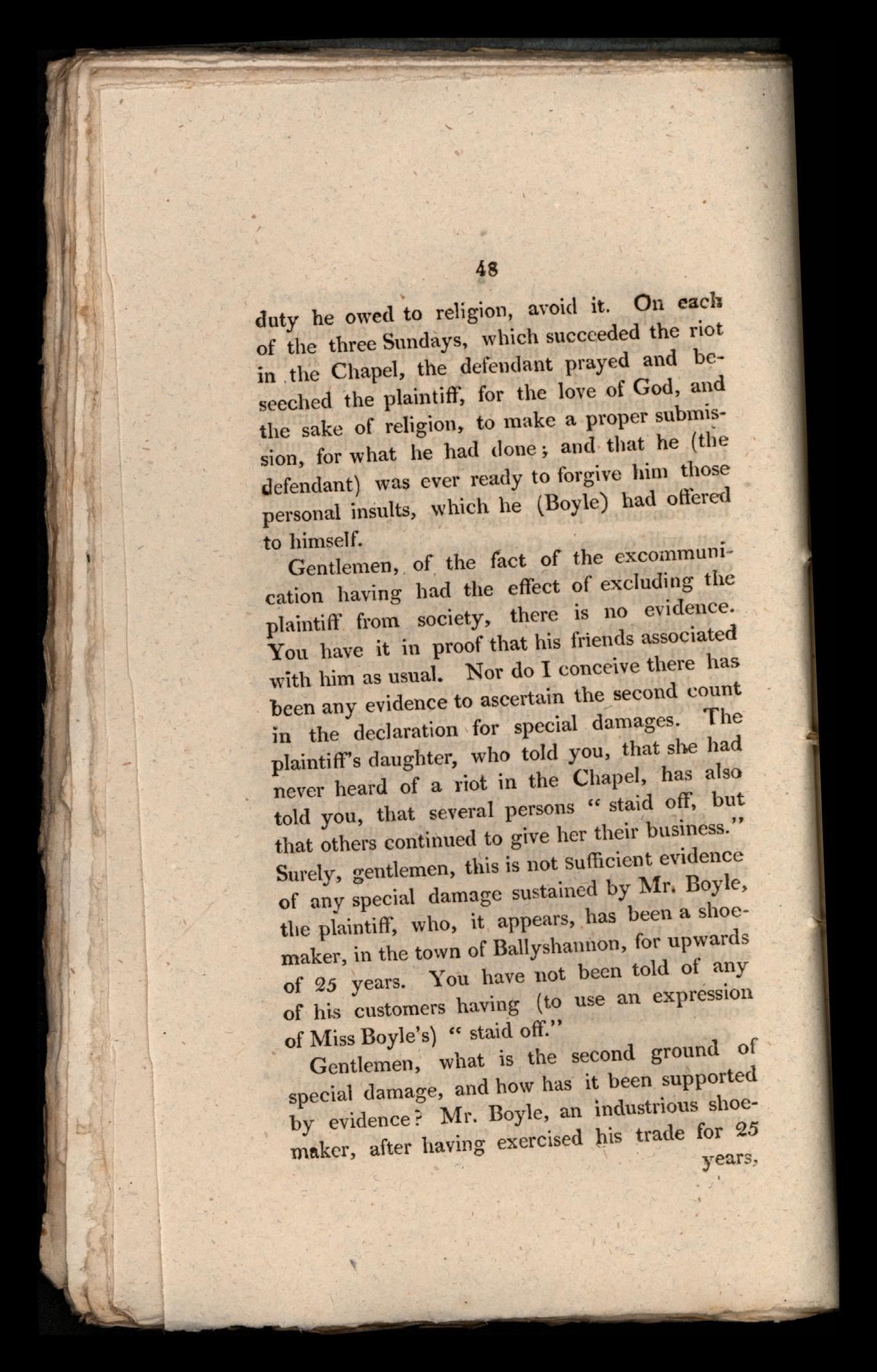 deny the a~ertion ; while, I co11te11J, that if it were true, it is unimportant. Under his lordship's correction, I affirm, that it is superfluous to rrovc spC:cial damage. The net being unlawful, the law would, if, necessary, imply malice, and general damase will support the action. Do you suppost', that this general damage must be pecuniary ? No, gentlemen, tarnished reputation-wounded feelings-loss of society would be grounds for ample d-unagc at your hanc.ls. Was there not Joss of society occasioned to the ~aintitf, by this excommunication ? This, indeed, I had always conceived to be the necessary consequence of excommunication in every church, until I heard the testimony of Dr. Sheil. Much, however, as I esteem him, I can yet believe, that he is not infallible. But the testimony of the other witne:,ses, on a JeycJ, i11 rank, with Boyle, proves, that he must have been deprived of their society, to whicl1 alone he ltacl been accmtomed. " "hc:ther Dr. Sheil be _right or wrong, in the abstract, the consequences were therefore equally, in either case, injurious to Boyle. Though the rich man might, with impunity, associate \\ ith his excommunicate<l friend. The humble Catholic was awed by the censure of the church from such unhallowed society. Ilut is there not another claim for damages ? Arc wounded feelings to be compensated in other actions witJ1 damages, and is Boyle to receirn nothing. at your hands, for