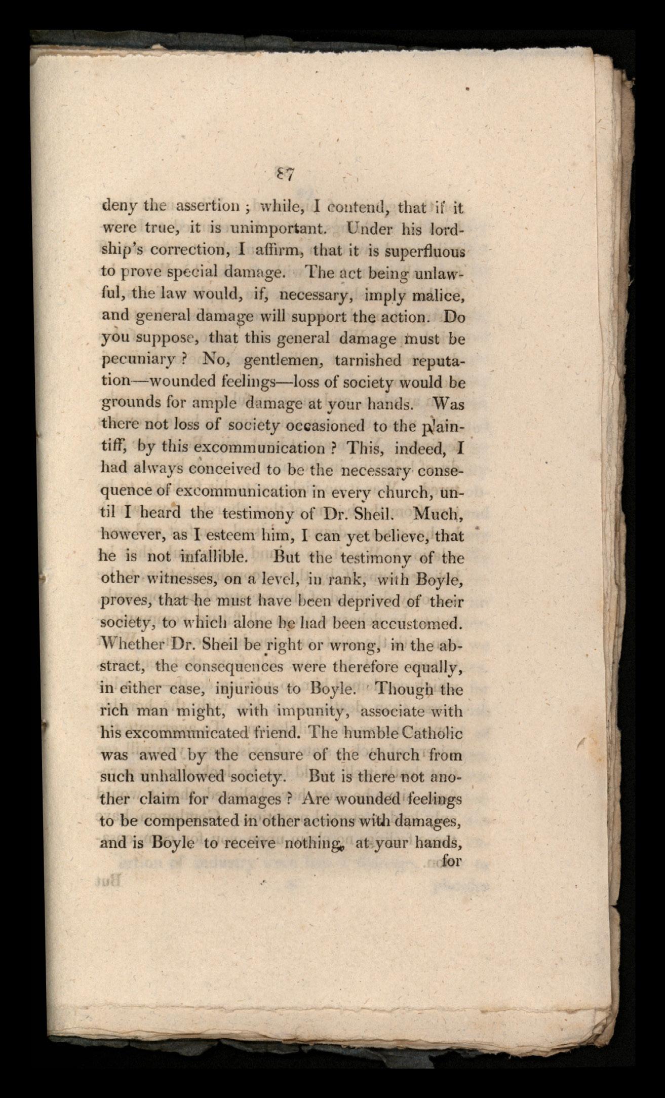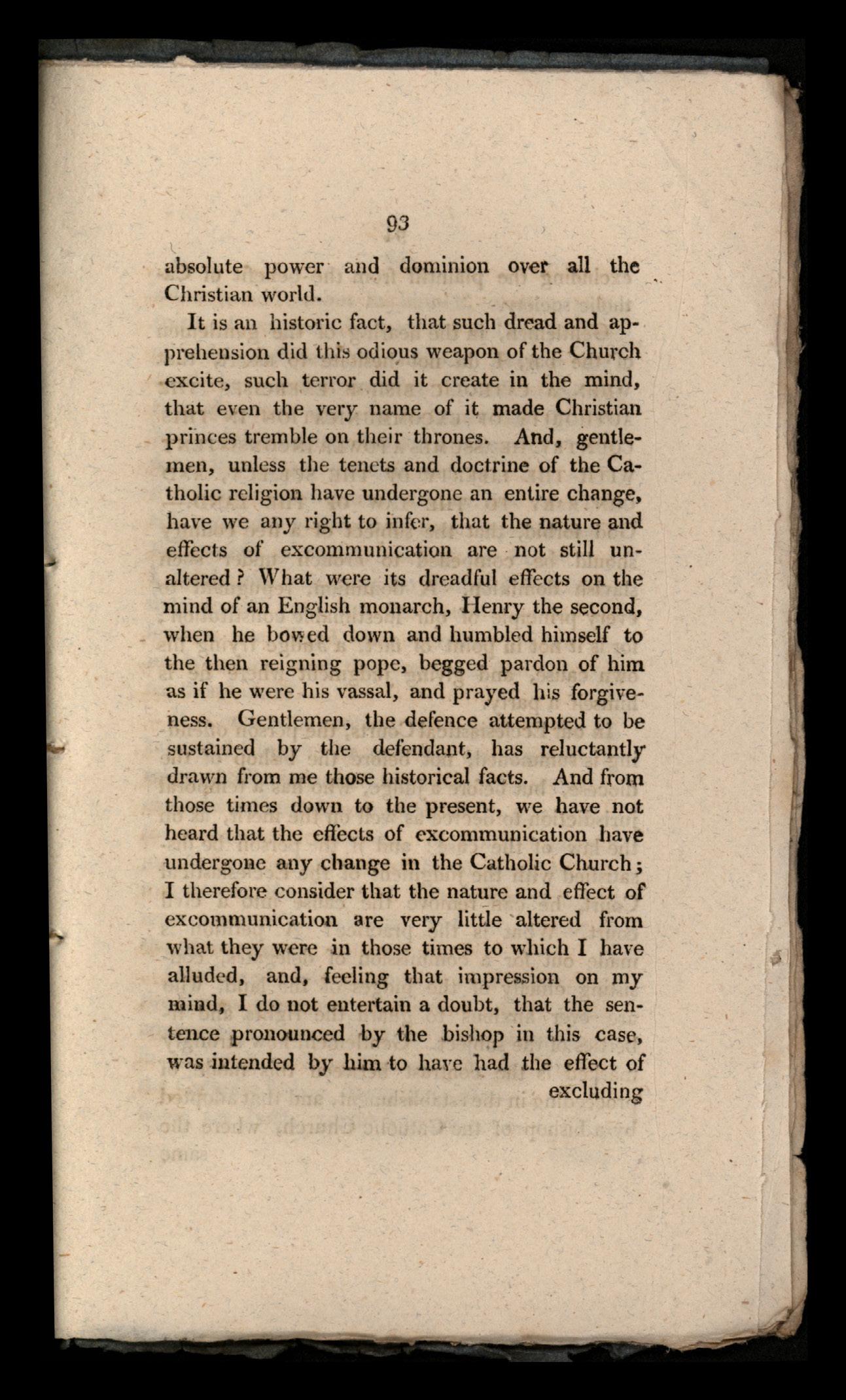 confess 1 very much doubt) aud that any clerg1· man professing the Catholic reHgion had given satisfactory evidence of that circumstance, it 1\•ould, in my opinion, materially alter this case. But, gentlemen, evidence of a contrary tendency has been given; and thf& has been proYed by one of the witnesses, namely, that he, the witness , would consider himself guilty of a crime, did. he associate with a person excommunicated. Anothei· of the witnesses has taken upon him to say, tl1at he would not enter into any commercial intel"CQUn!C with a person excommunicated, and he would not like him. Gentlemen, I run b ound te tell you, tl1at if it were a matter of notoriety, tl1at tbc sentence of excommunication d:d not ex.tend tbe ,.,,hole 1ength of depriving the plaintiff of the benefit of society, it was competent to the defendant to have given evidence of that fact. Gentlemen, 1 conceive it absurd to contend, (at the present da.y) that the sentence of excommun'ication by a Catholic bishop, has not the effect of banishing the delinquent from the society of Catholics. Let me ask any gentleman conversant with ecclesiastical hi tory, what " 'as the power and eftect of the sentence of excommunication, in tho~c dark times of bigotry and superstition, when Christian popes nnd prelates cxerci!Jed an ab~lute
