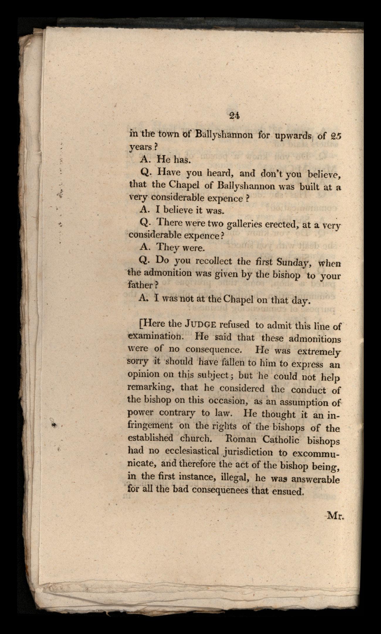 Gentlemen, it is my duty to tell you, that the laws which empowered Catholic bishops to excommunicate, have Jong since been repealed. None but bishops of the Established Church have, in th is country, a legal ri g ht of exercising th.it authority: and I am compelled to tell you, that I consider the sentence of excommunication pronounced by th e defendant in this action, not only AN ASSU\IPTION Of POWER CONTRARY TO LAW, DUT A::-i USUHP \TION OF TIIE RIGHTS OF THE BI 5IIOJ>S OF THE ESTABLJSI~ED CHURCII, AND AN JNFnINGEME~T OF TIIE JURISDJCTJQ.N OF OUR ECCLESIASTfr \L COURTS.