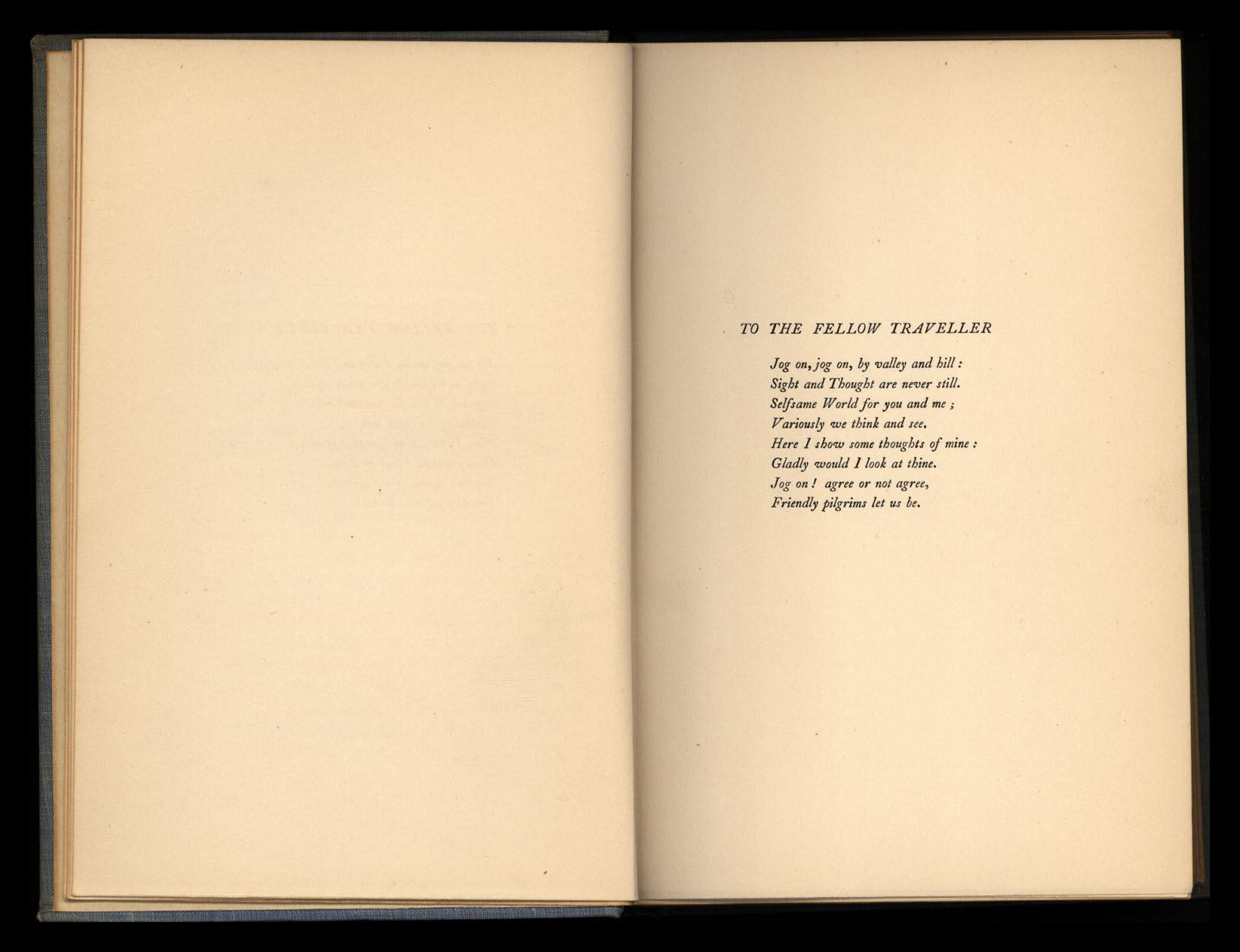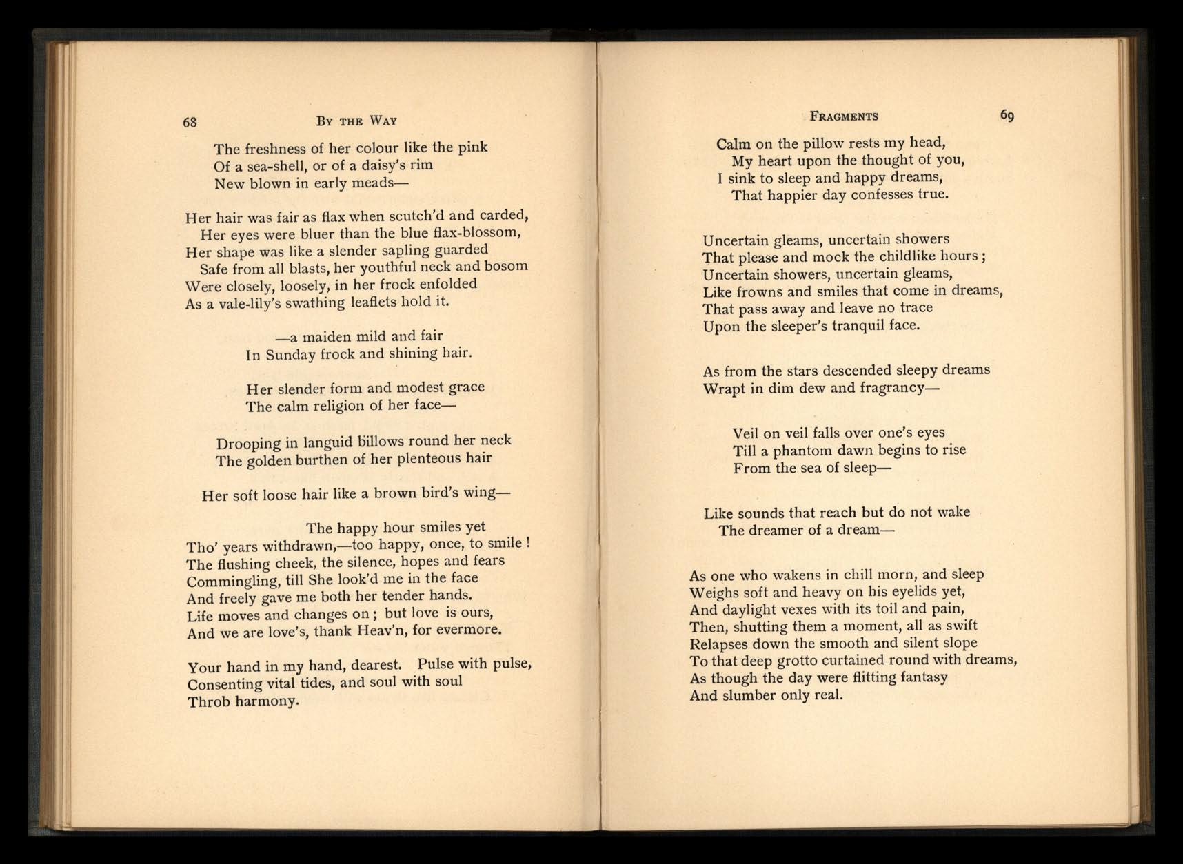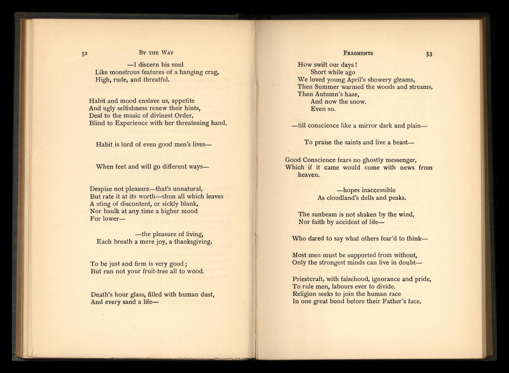 In evil forget not good, Colour not Life with thy mood; Think of old hours of bOding, Of terror and heart-corroding, The darkness, the lightning, the blast, And how they changed and pass'd And melted away altogether To sunshine and summer weather.