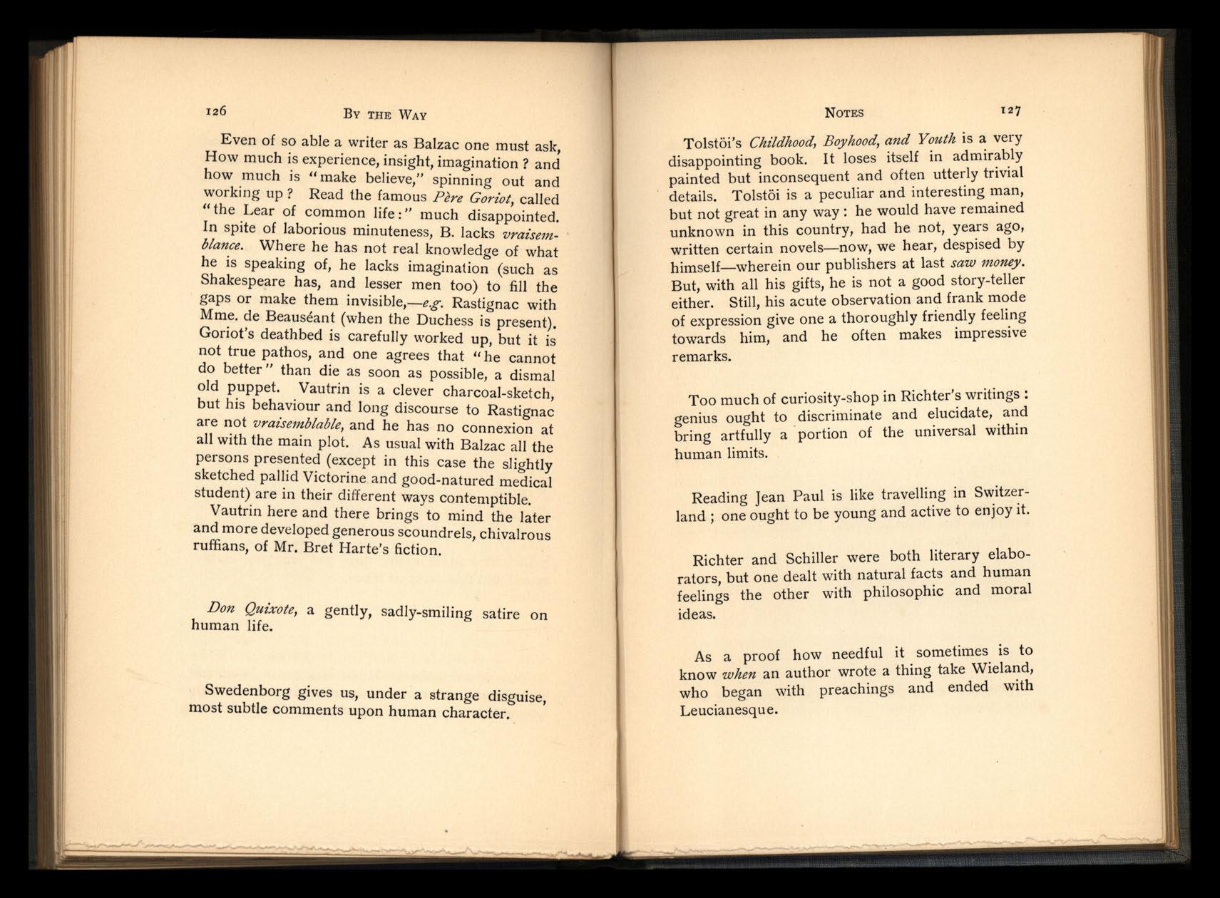 The difference in men's minds is of less and more. The best man is he who has all human qualities in their due proportions. Efficiency, however, in particular directions, is usually the result of a disproportion, an overbalance of qualities; and in what are called practical affairs the strongly partial man is sure to outdo the more complete .one. Goethe could never have made himself Emperor of the French. But Napoleon's view of life was incomparably narrower, and his enjoyment of life immeasurably less.
