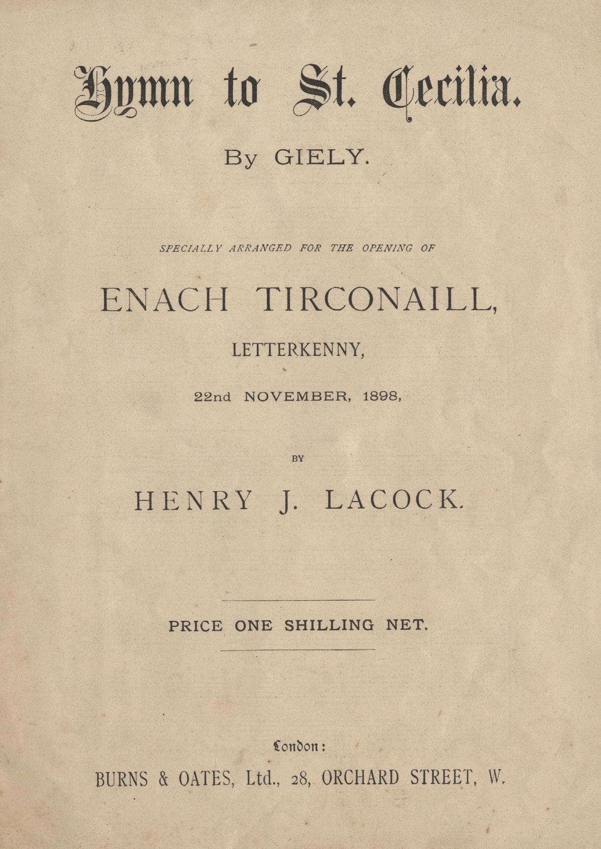 Music Sheet titled Hymn to St Cecilia For the Opening of Enach Tirconaill, 1898 which was donated to the Archives in 2023