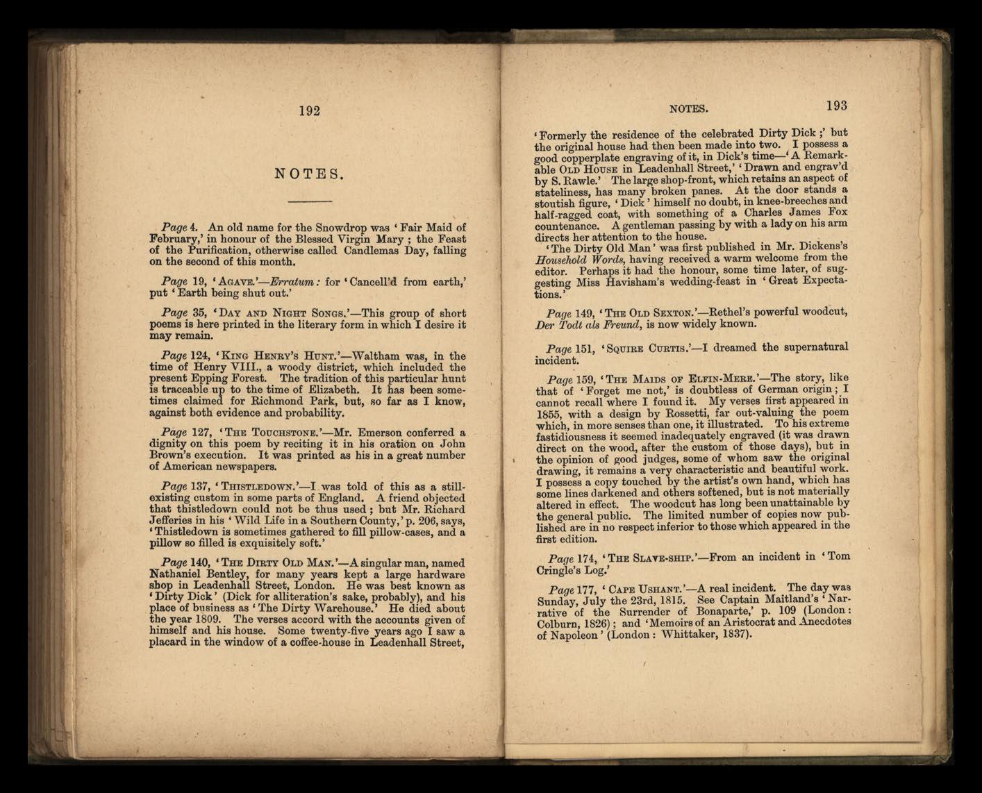 Pag e 159, 'THE MAID S OF ELFIN-MERE. '-The story, like that of 'Forget me not,' is doubtless of German origin; I cannot recall where I found it . My verses first appeared in 1855, with a design by Rossetti, far out-valuing the poem which, in more senses than one, it illustrated. To his extreme fastidiousness it seemed inadequately engraved (it was drawn direct on the wood, after the custom of those days), but in the opinion of good judges, some of whom saw the original drawing, it remains a very characteristic and beautiful work. I possess a copy touched by the artist's own hand, which has some lines darkened and others softened, but is not materially altered in effect. The woodcut has long been unattainable by the general public. The limited number of copies now published are in no respect inferior to those which appeared in the first edition.