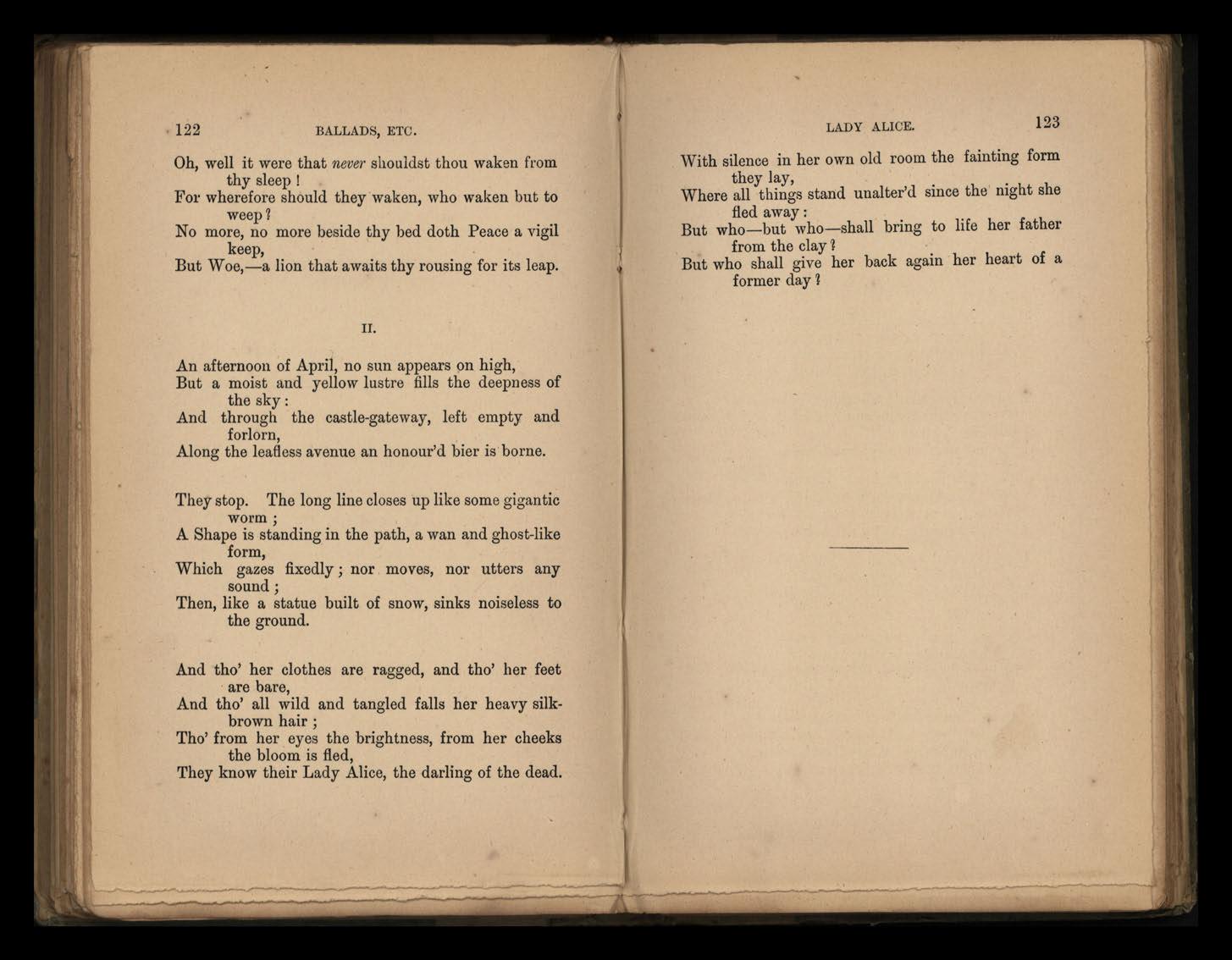 ( It may be one of her brethren Lies wounded on his bed; Perchance her old grandfather Is dying now, or dead.'