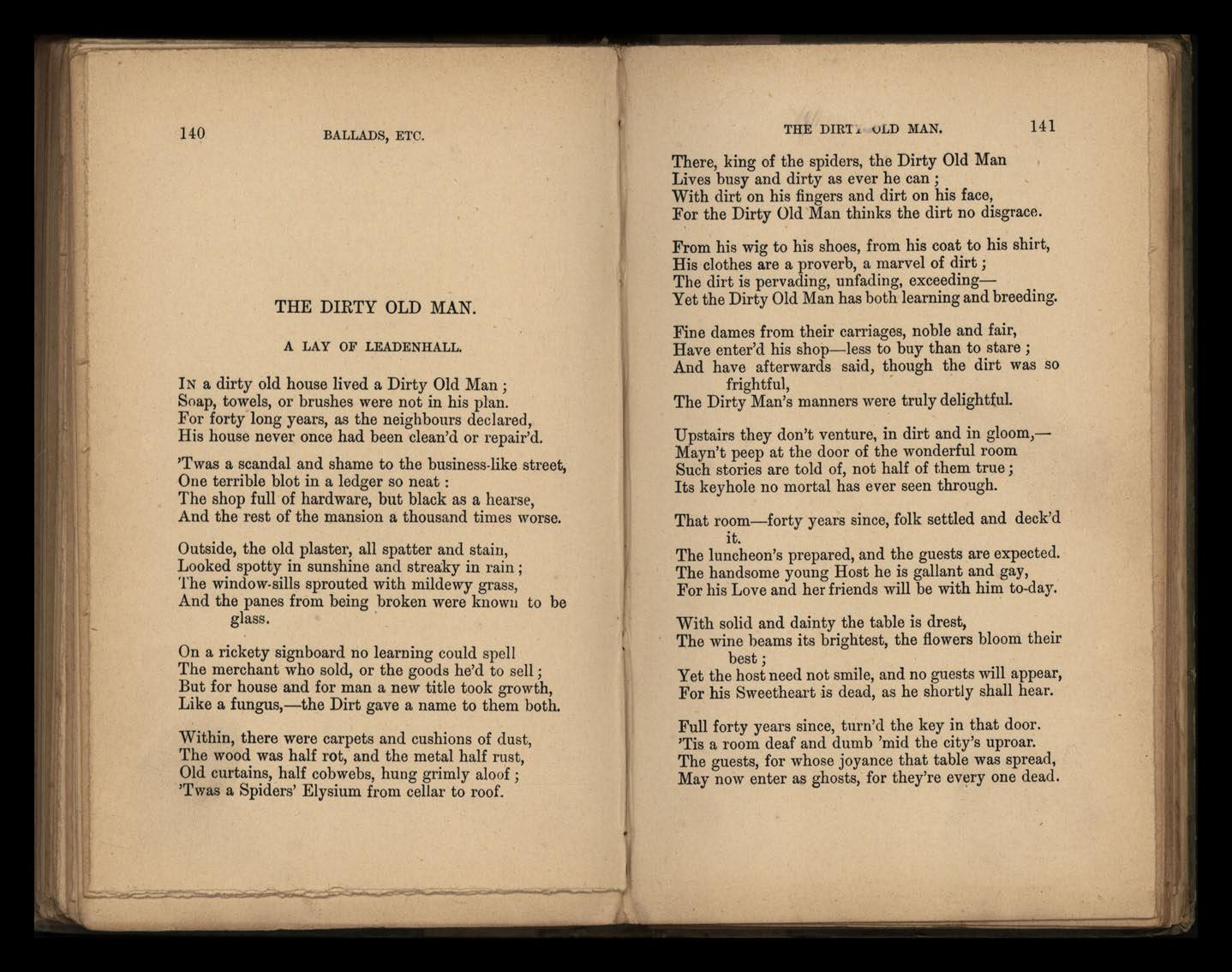 'The Dirty Old Man' was first published in Mr. Dickens's Hou sehold Word s, having received a warm welcome from the editor. Perhaps it had the honour, some time later, of suggesting Miss Havisham' s wedding-feast in 'Great Expectations.'