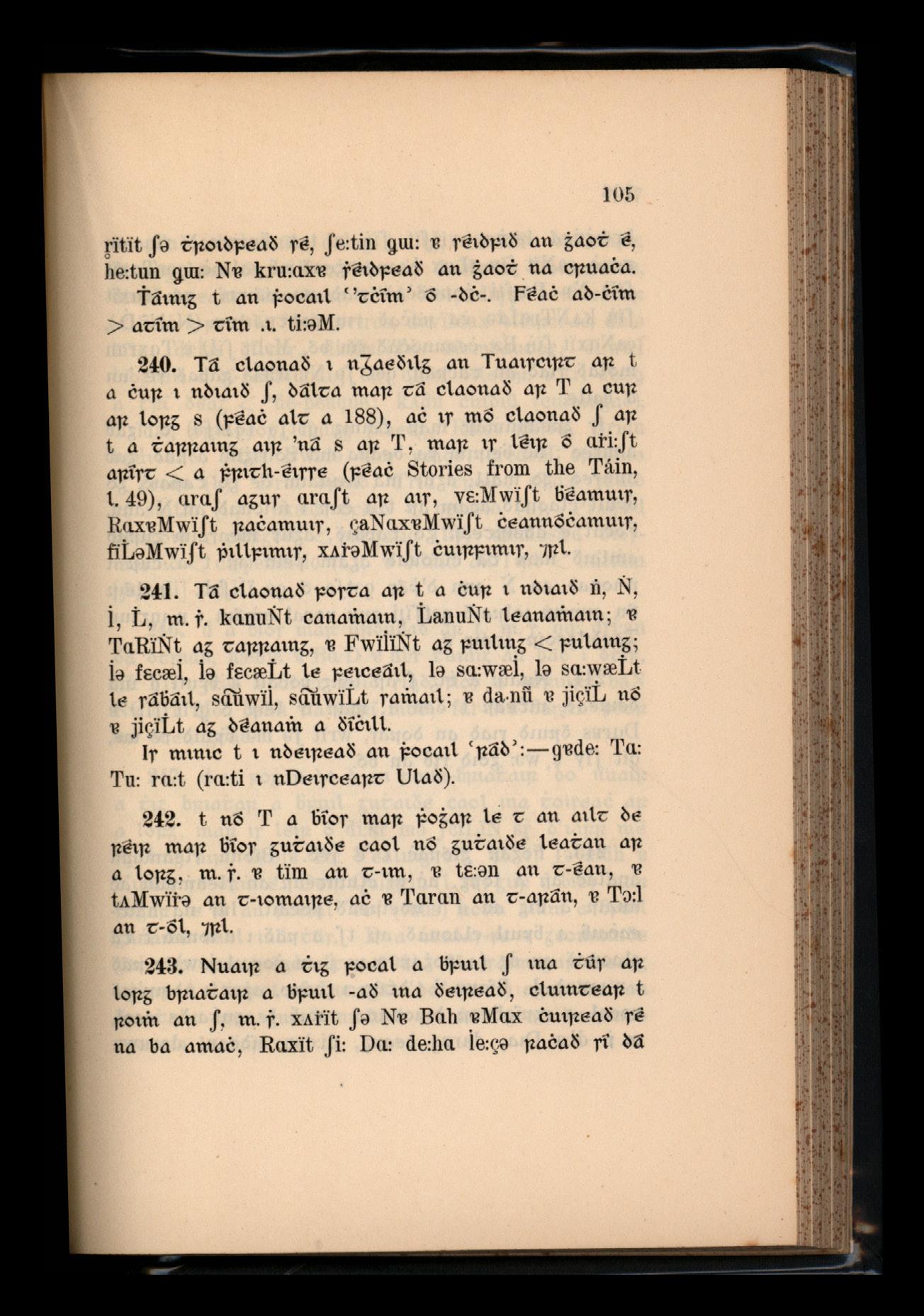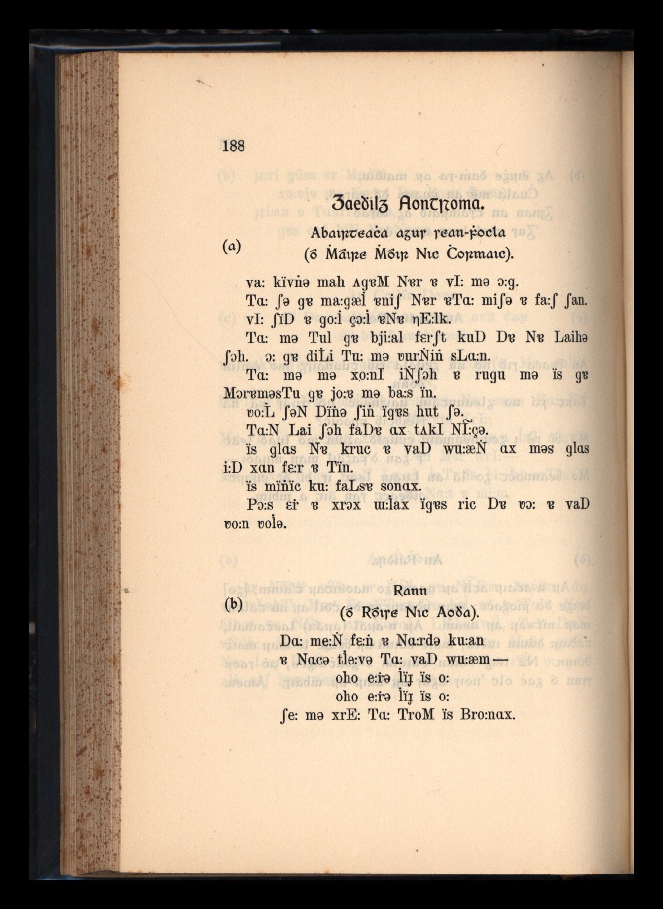 9. Bionn a.: t n-tonab a. , n-air; a n;tiioor;ati A tiOt\t\ tin, tini;, nti ' til, tib, ~o, ~tit, ~m , lk. f~ac kn:rN catin, Mo.:rNalo.x matJtnealac; To.:rNa r;atJtUi;e; u:ro.s AnJtar, u:m antio, Bu:rlft batntiiogan, kro.:m."11 C}?anntia, ska'.:ru (ska:nru t niteann Columcille) ri;anntia~; :>: ha:rL11 o taJtla, Ma:rL'13 maJtla (maltiac t 6Connacr;aiti), Mn:rLaxo.n ma)tlacan; fO~a ran amm Po.:rLo.n Patitotan; Po.:rDo.g (Bo.:rDo.g i nDeircea~ Ula~) patibSi;, ka:rda cattibe, n:rD atib. Ir t~tti on j:tlt~eacr; i;O Jtato an i;Utai~e i;OtJttb ran j:ocal 'aJtb' ra r;rean-am. f~ac an Jtann: