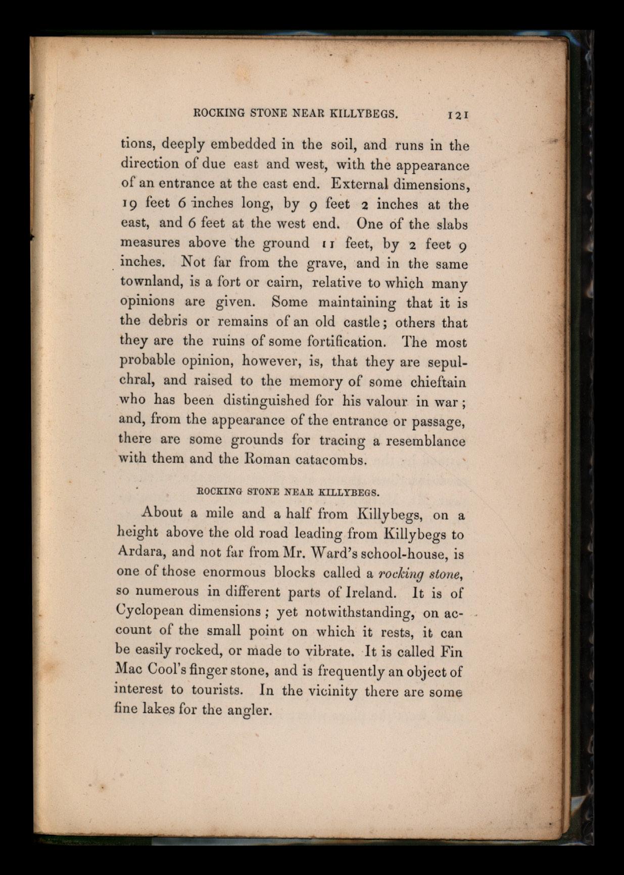 The Cathach of St. Columbkille, 79 Great Battle at Ballyshannon, in 1697, between Sir Conyers Clifford and his Forces, and Red Ilugh O'Donnell- Gallant Defence of the Castle, and Heroic Bravery of the Inhabitants-Death of the Baron of Inchiquin in the act of crossing the River, 80 Donegal, 86 Donegal Castle, 87 Lough Derg, 89 Killybegs and the Scenery of the Wilds-Excursion to Glencolmkille-The New Hotel at Carrick- The Beautiful Cliffs, and the Old Stono Crosses of the Glen-Grand Mountain Pass of the Glcngeish, 97 Kilcar, . 101 Carrick, ib. Sliabh- Liag, 104 View from Sliabh-Liag, 105 The One Man's Path, ib. Thunder Storm on Sliabh-Ling, 106 Bunglass, 107 Malinbeg, ib. Glen Head, 110 The Sturrell, 111 Tho Old Stone Crosses in the Glen, 112 Grand Mountain P ass of the Glengeish, 114 Table of Distances from Killybegs to the Wilds, 116 Cyclopean Remains at Casholcummin, near Killybegs, ib. Giant's Grave, near Killybegs, 119 Rocking Stone, near .Killybegs, 121 :Beautiful Drive from Killybegs to St. J ohn's Point and the Lighthouse, 122