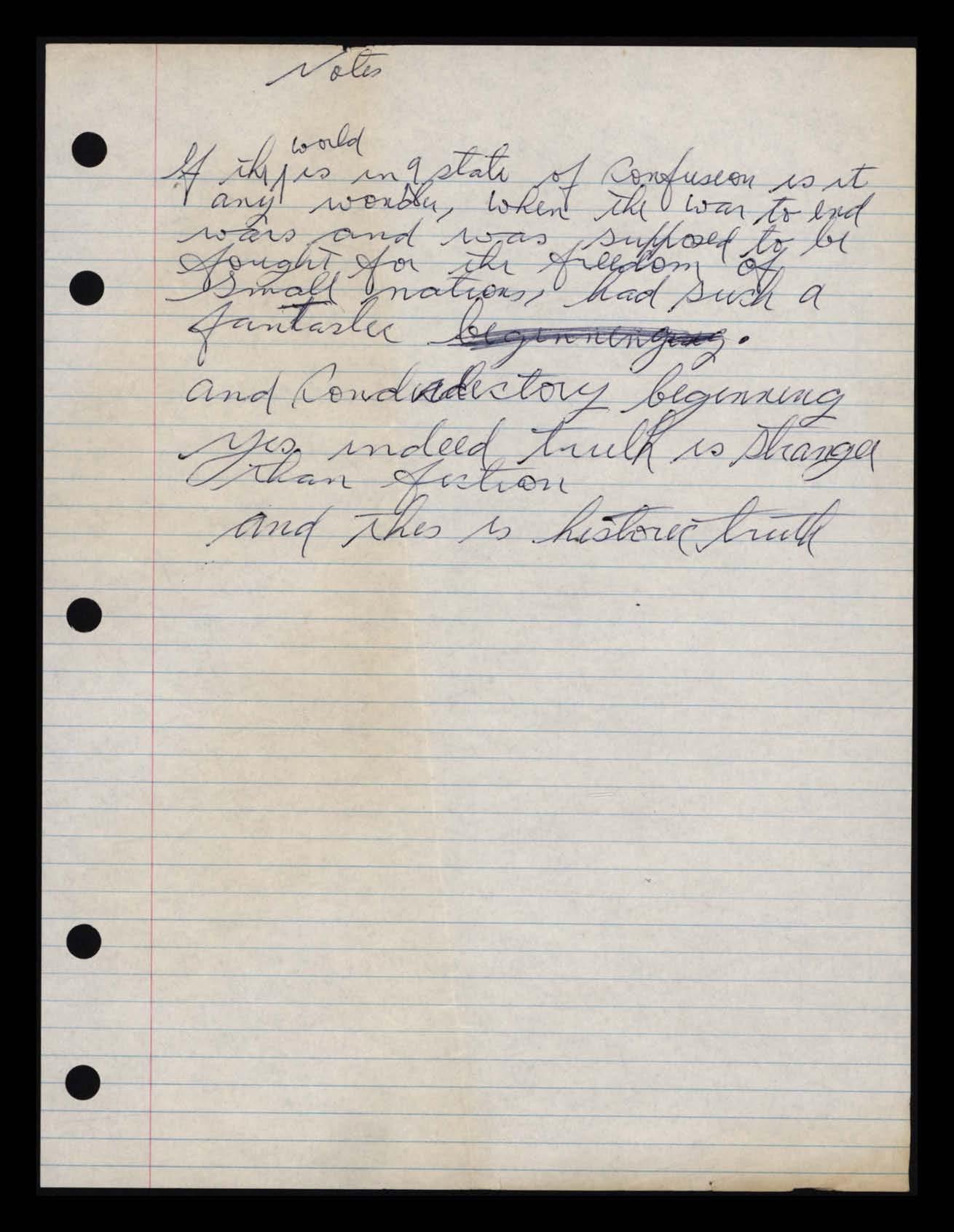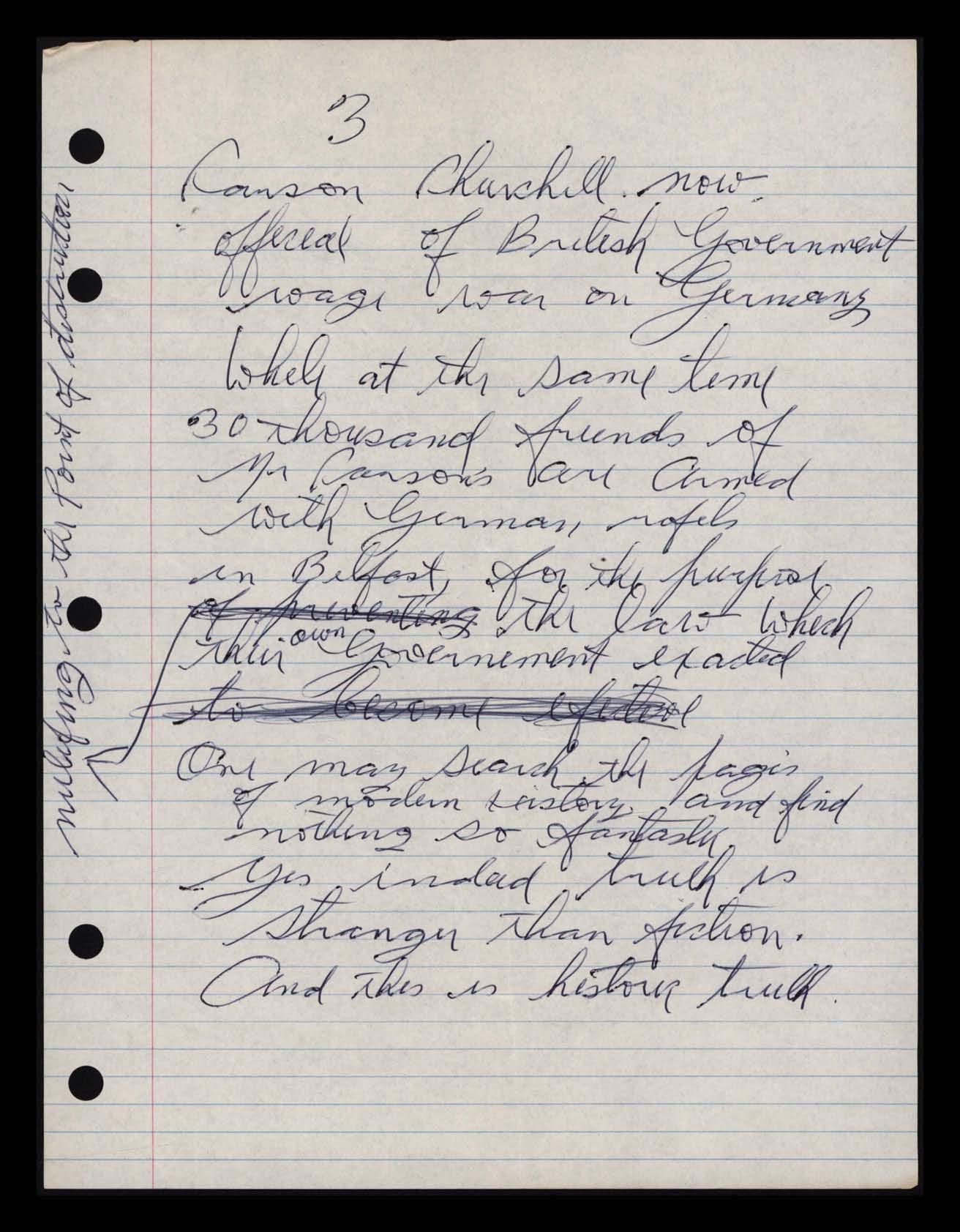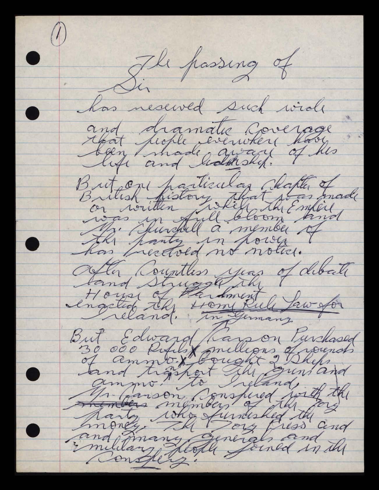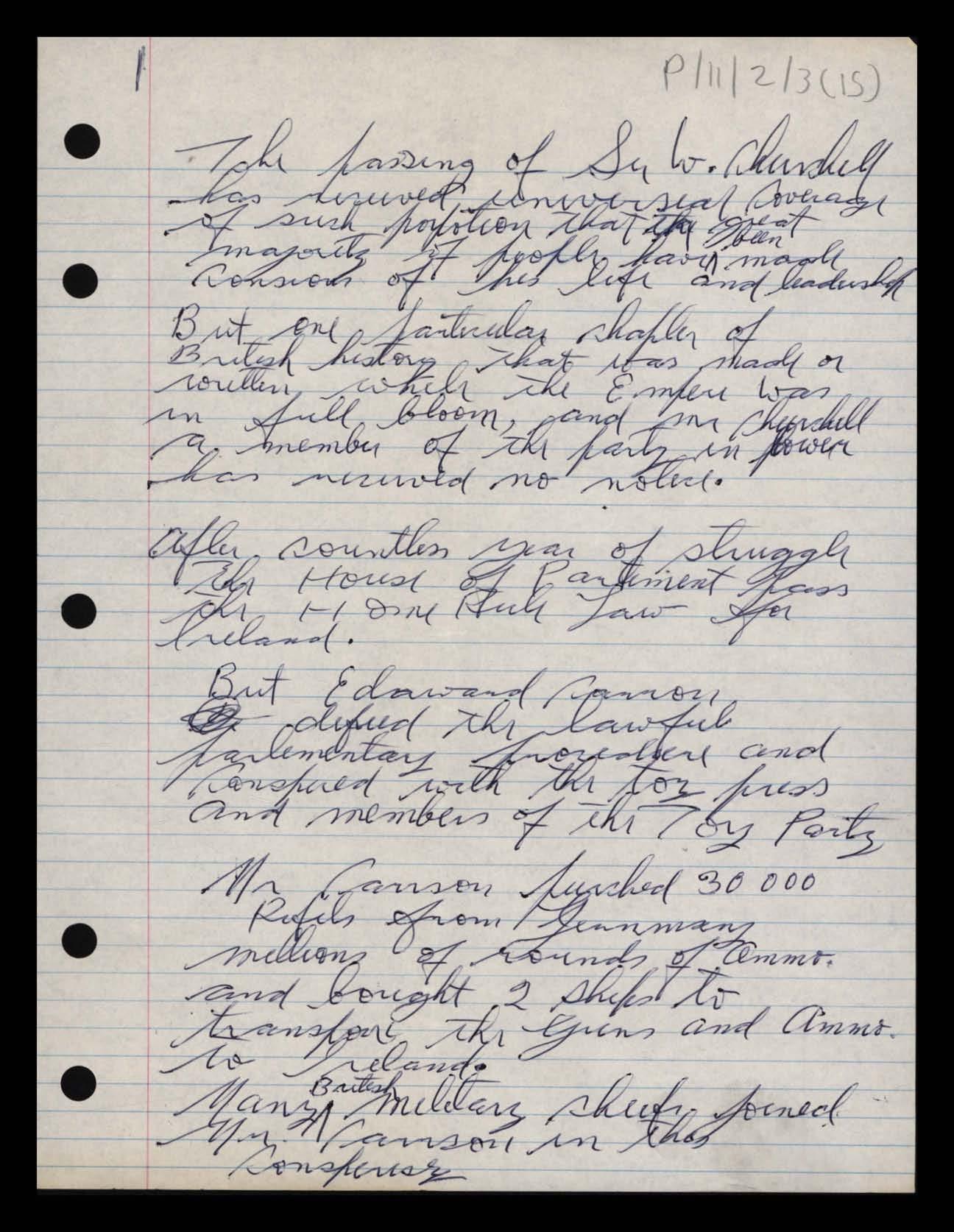 Document written in Daniel Doherty's hand in which he writes about Winston Churchill (recently deceased, 1965) and his involvement with the party that "conspired" with Edward Carson following the passing of the Home Rule Law for Ireland by the British Parliament. c. 1970.